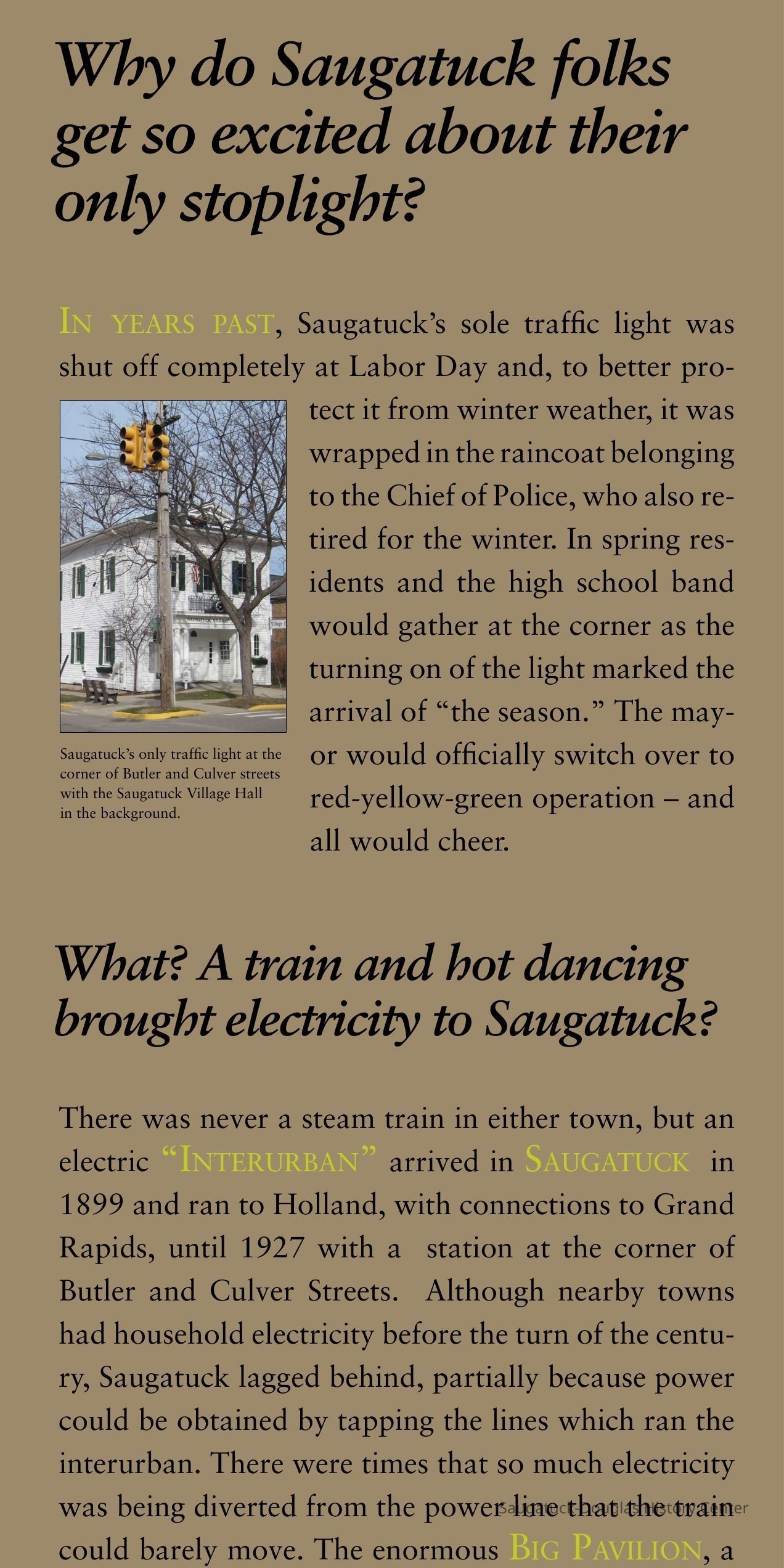 The exhibits main panels covered the founding of the villages, working at a sawmill, leisure activities, chain ferry and bridge transportation, the post office and home mail delivery, Dr. Walker and the Community Hospital, school consolidation and education, the Labor Day Bridge Walk. The side panels covered what do the names of Saugatuck and Douglas mean, population, industry and production, the longest-lasting businesses, restaurants and food, ice cream, the stoplight in Saugatuck, electrical service, highways, farmers and the first telephone company, major fires, the Kirby house as a hospital, churches, schools through the years and student statistics, and "how to small towns citizens get things done?"