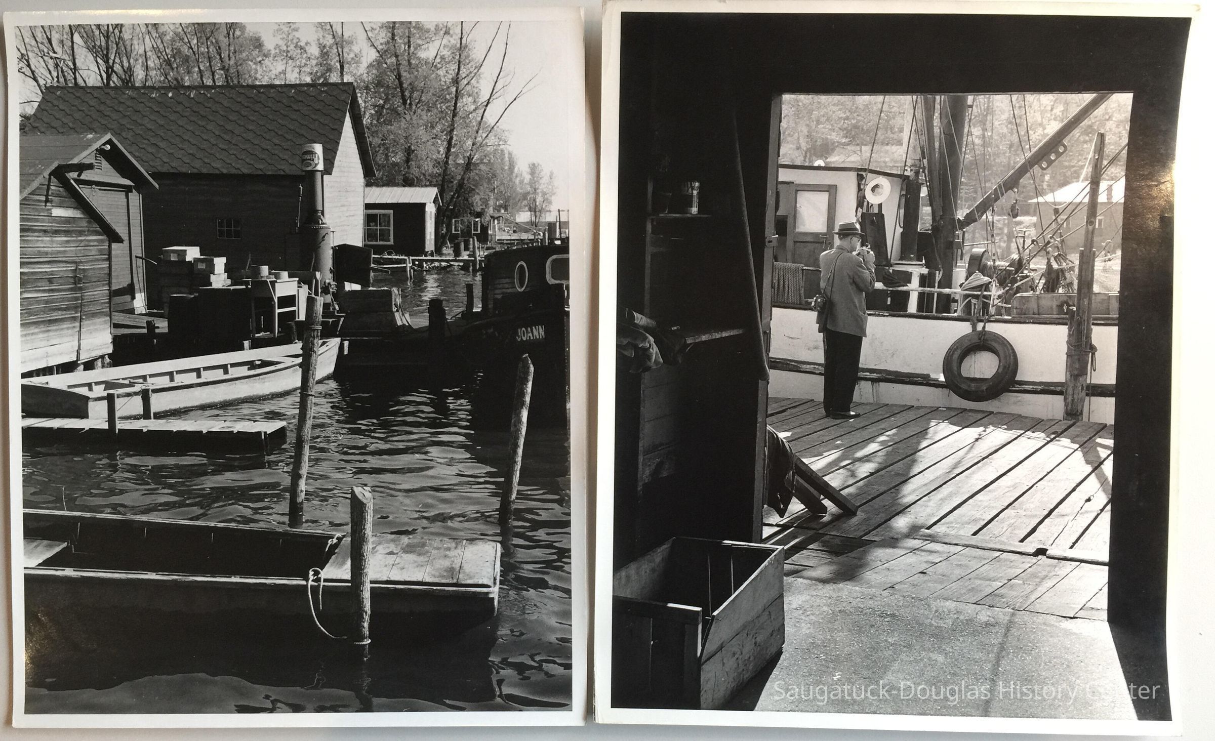 2. Tug Joann at dock with small, wooden craft, the net boiler, fish boxes and the Sewers' shanties.