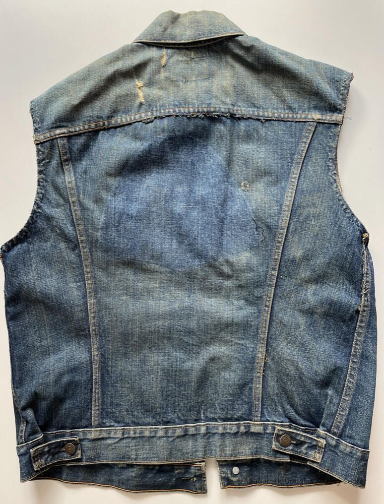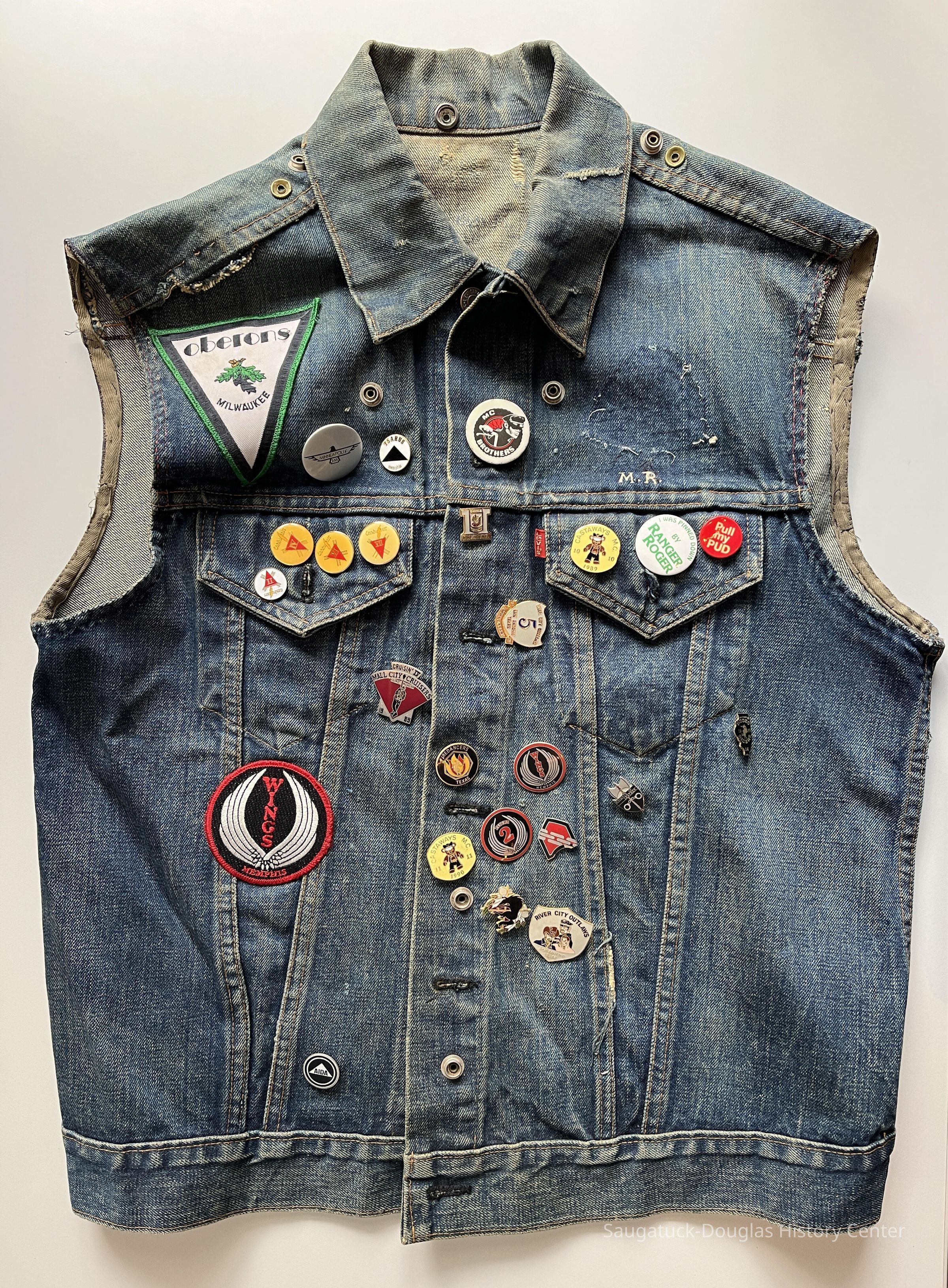 3. Denim vest, possibly fashioned from a jacket, adorned with many of the same patches and pins as the leather vest with the addition of Minneapolis SM, MC Brothers, Conductors XII, Mall City Cruisers 1989 Cruisin' IV, Castaways MC 10 1989 and 11 1990, Flight 2, I was pinned down by Ranger Rodger, Pull my PUD, and AIDA. Convex triangular patches on chest and back have been removed. "M.R." embroidered on chest for Mark Richter. Tags removed. Yellowed and threads worn in areas.