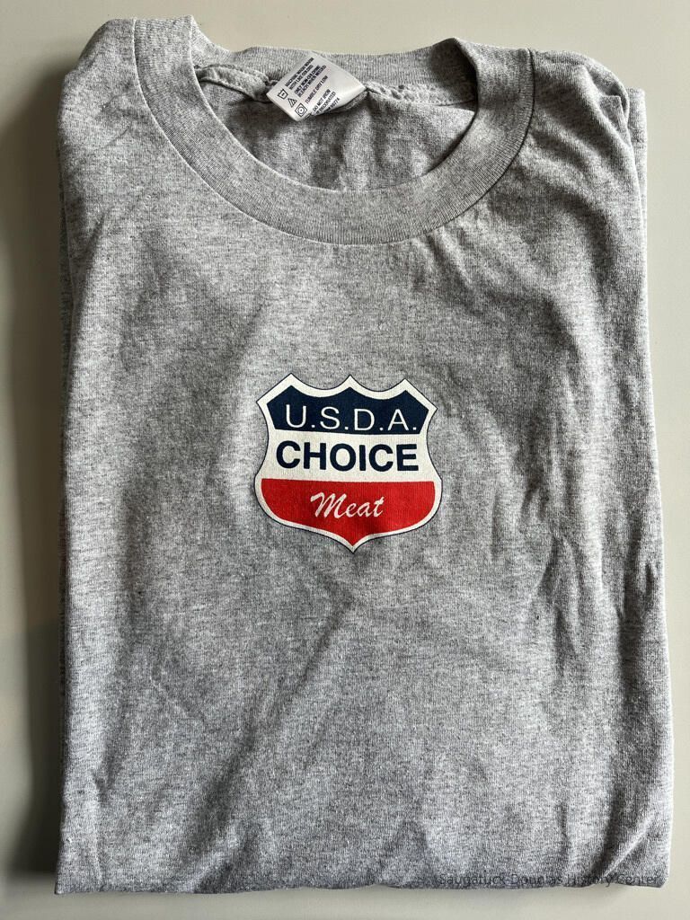 4. Grey XXL t-shirt with "U.S.D.A Choice Meat" in highway shield silk-screened on center front. Blank back.