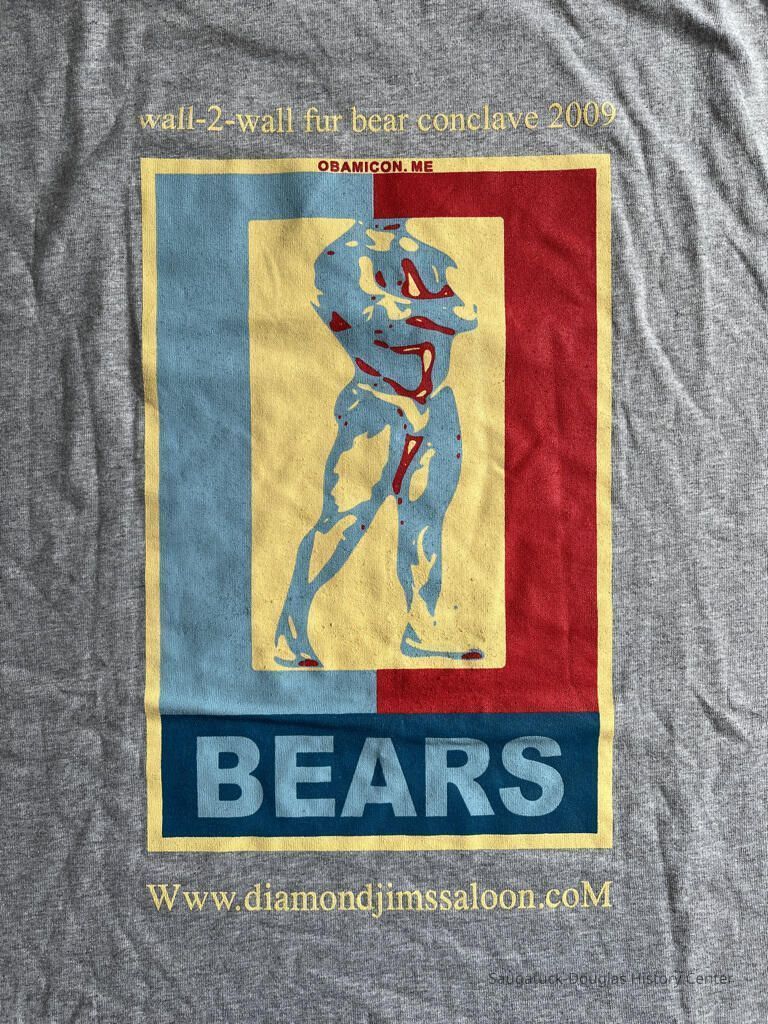 5. Grey XXL t-shirt with large design silk-screened on back of a muscular man's body in the style of the iconic President Barack Obama "Change" poster. Text reads "wall-2-wall fur bear conclave 2009, obamicon.me, BEARS, Www.diamondjimssaloon.coM".