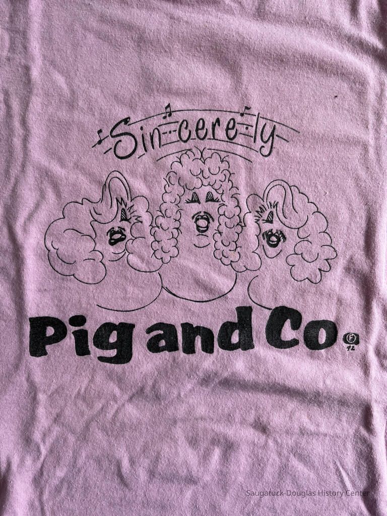 6. Pink XXL t-shirt with black silk-screen design on chest of three drag queens with poofy hair, exaggerated eyelashes and lips... and mustaches. Text reads "Sin-cere-ly Pig and Co. (F) 92.