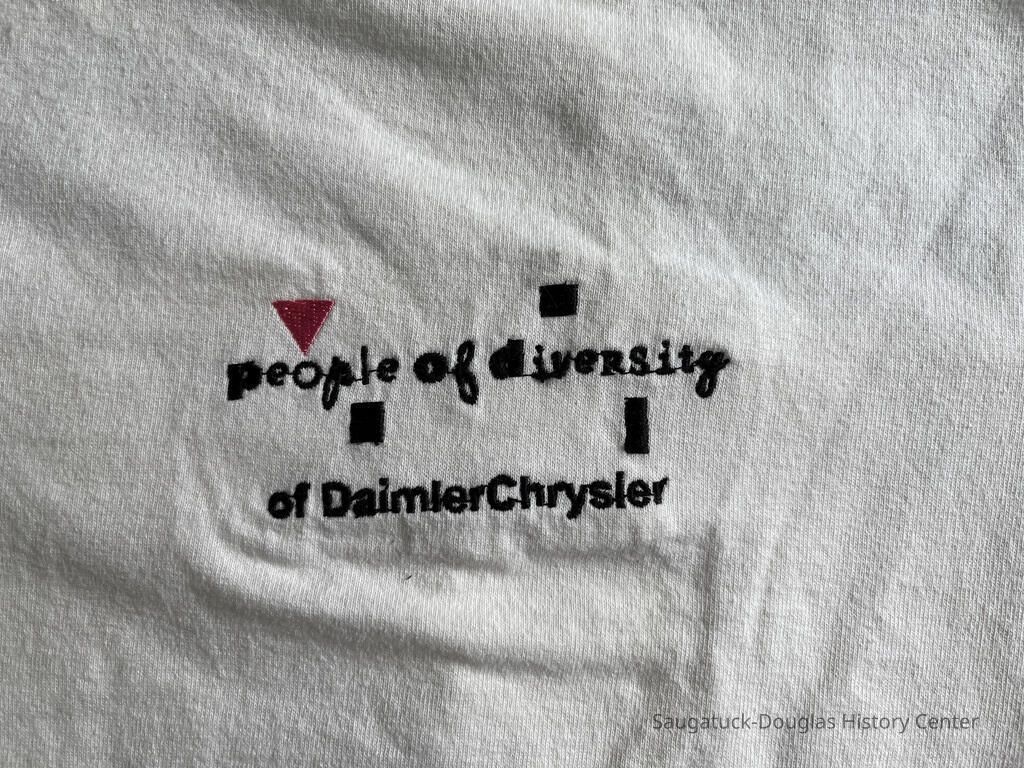 7. White XXL t-shirt with "People of diversity of DaimlerChrysler" embroidered over wearer's heart.