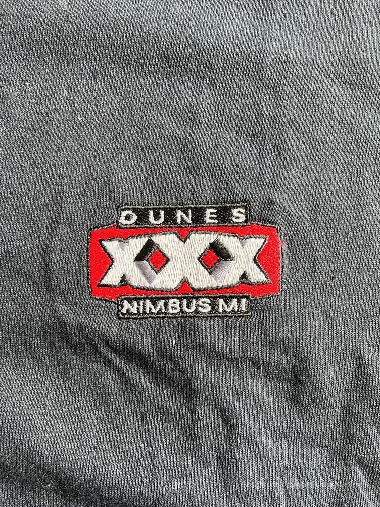 7. Black XXL t-shirt with "Dunes XXX Nimbus MI" embrodered in red, white and black over the wearer's heart.