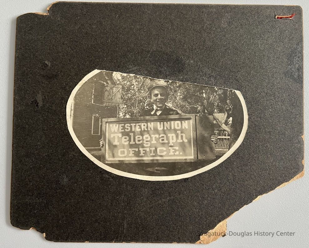 From Remembering When, 2021.87.22 "The photos of the boy, Cecil Linter are a bit of a puzzle—as we can’t find anything about him, except obviously, he worked for the telephone company. The photo of him with the sign was recently found in the Denison family photo collection, and the photo of him on his delivery bike turned up in the Auction House-Chaps album. Does anyone know anything about Cecil? He appears to be pretty proud of his job."