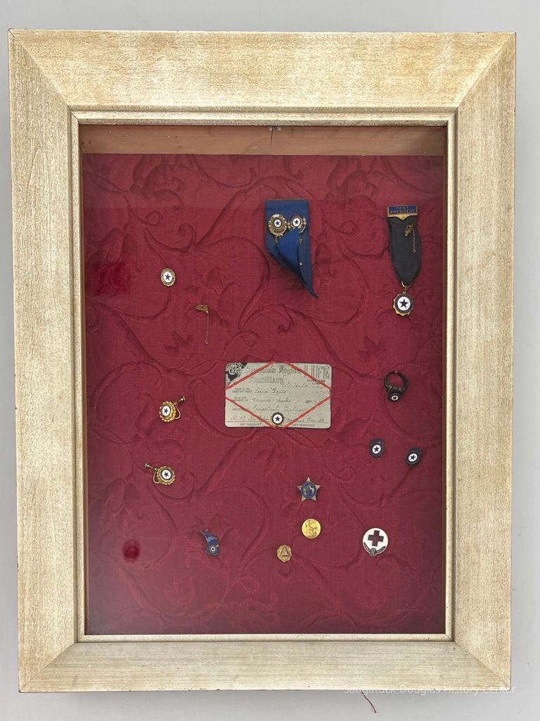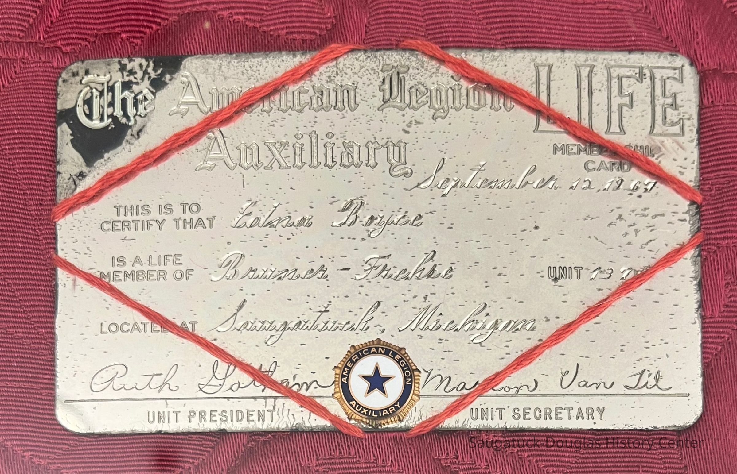 Framed, wooden box with glass front displaying a collection of pins. Centered on the red-fabric upholstered display area is a silver-tone metal American Legion Auxiliary life membership card, dated September 12, 1967, that certifies Edna Boyce is a life member of Bruner-Frehse unit 137. The metal card is also engraved with the signatures of Ruth Gotham and Marion Van Til.