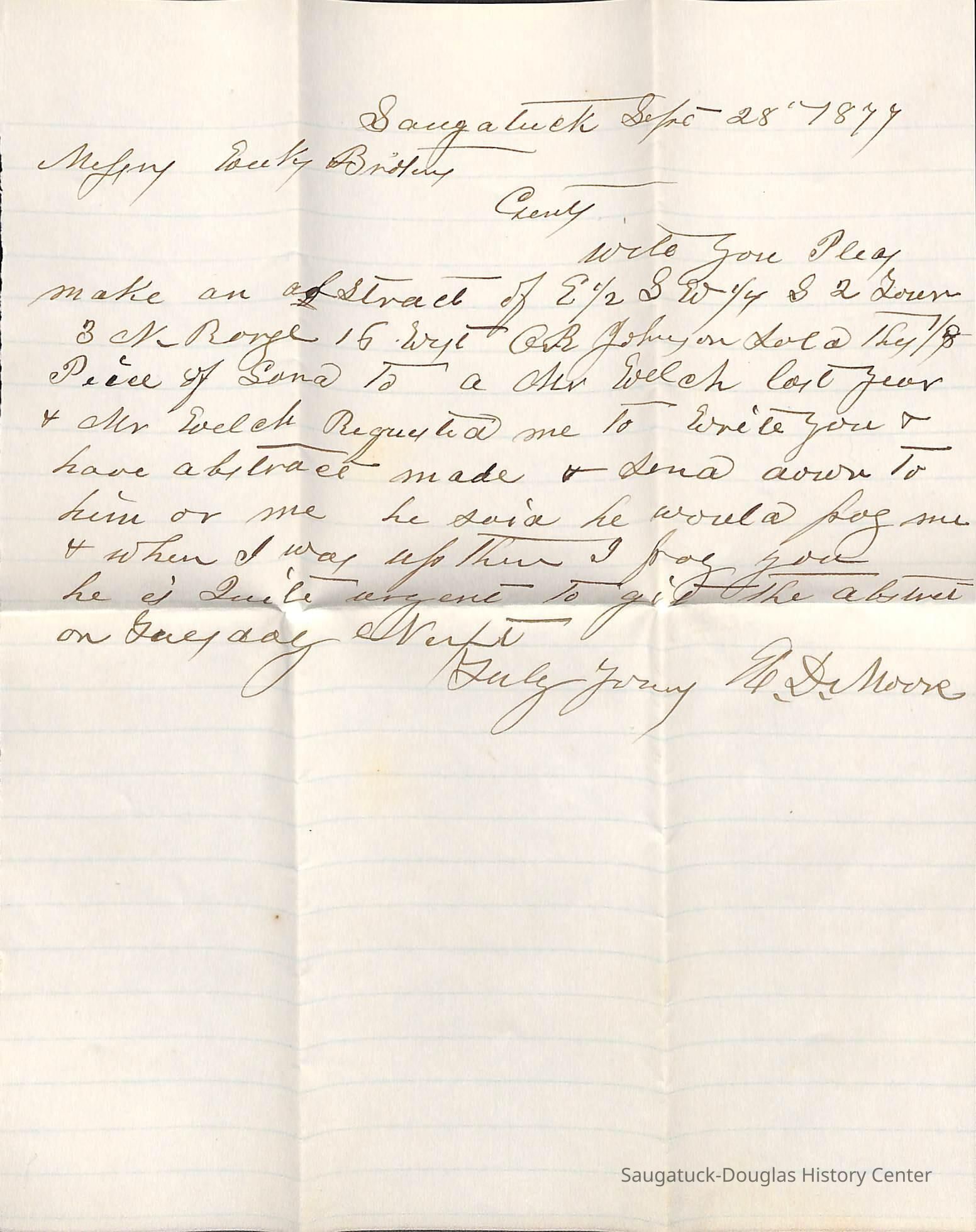 Handwritten letter to the Abstract Office - now the Register of Deeds - requesting an abstract for property in Saugatuck. Letter sent from H.D. Moore and dated September 28, 1877.