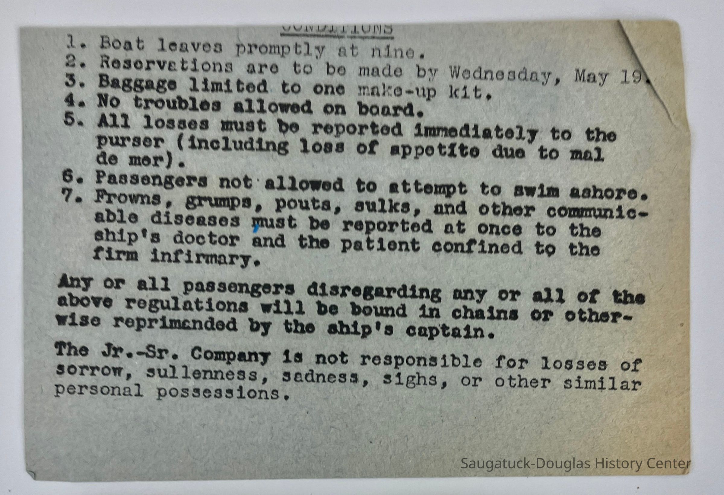 JR.-SR. Steamship Lines faux-ticket, "Sailing from Saugatuck H.S. on S.S. Helterskelter, May 21, 1937 [graduation hi-jinks]