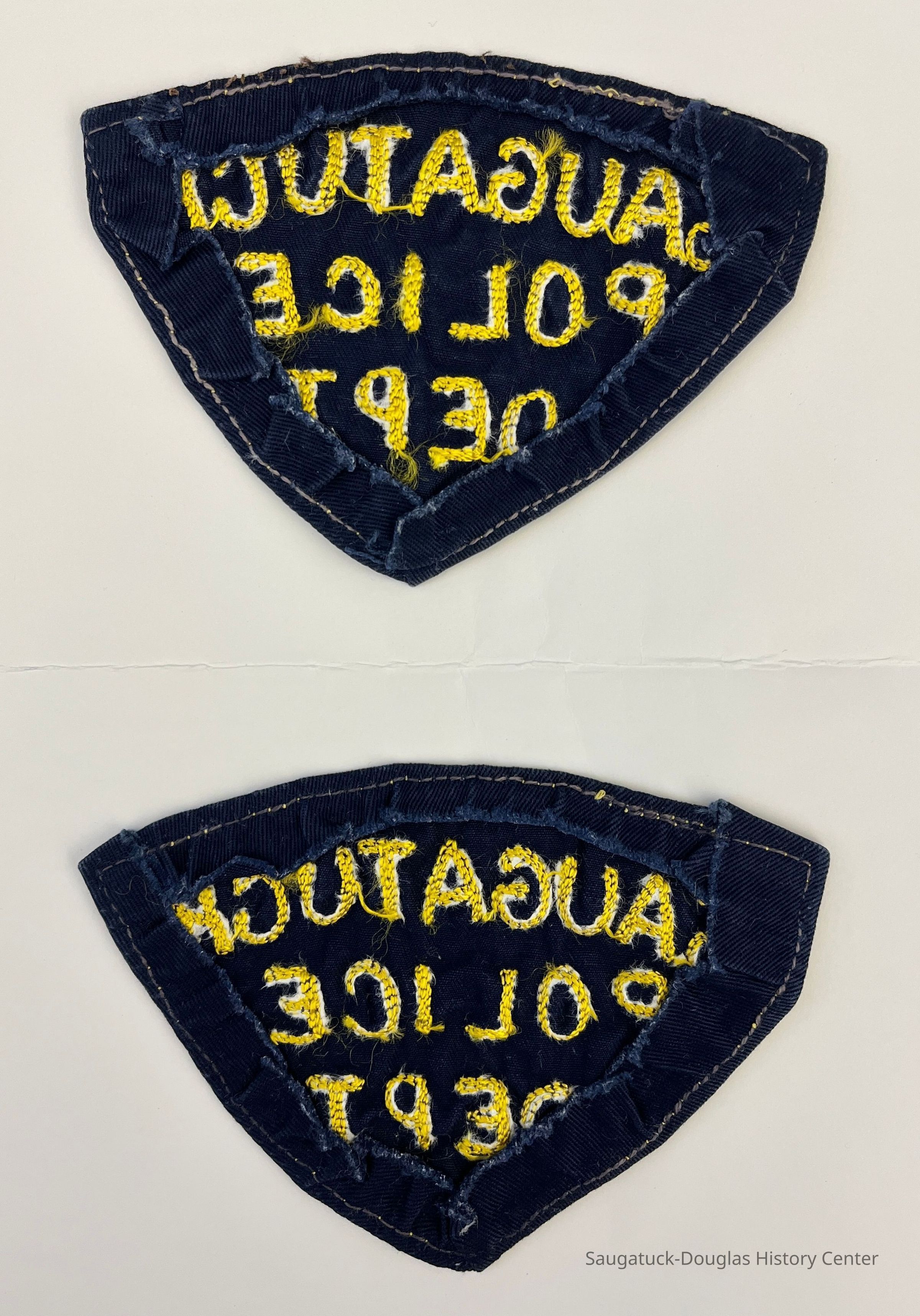 Two dark blue fabric shoulder patches with the text "Saugatuck Police Dept" chain stitched in yellow braid.
