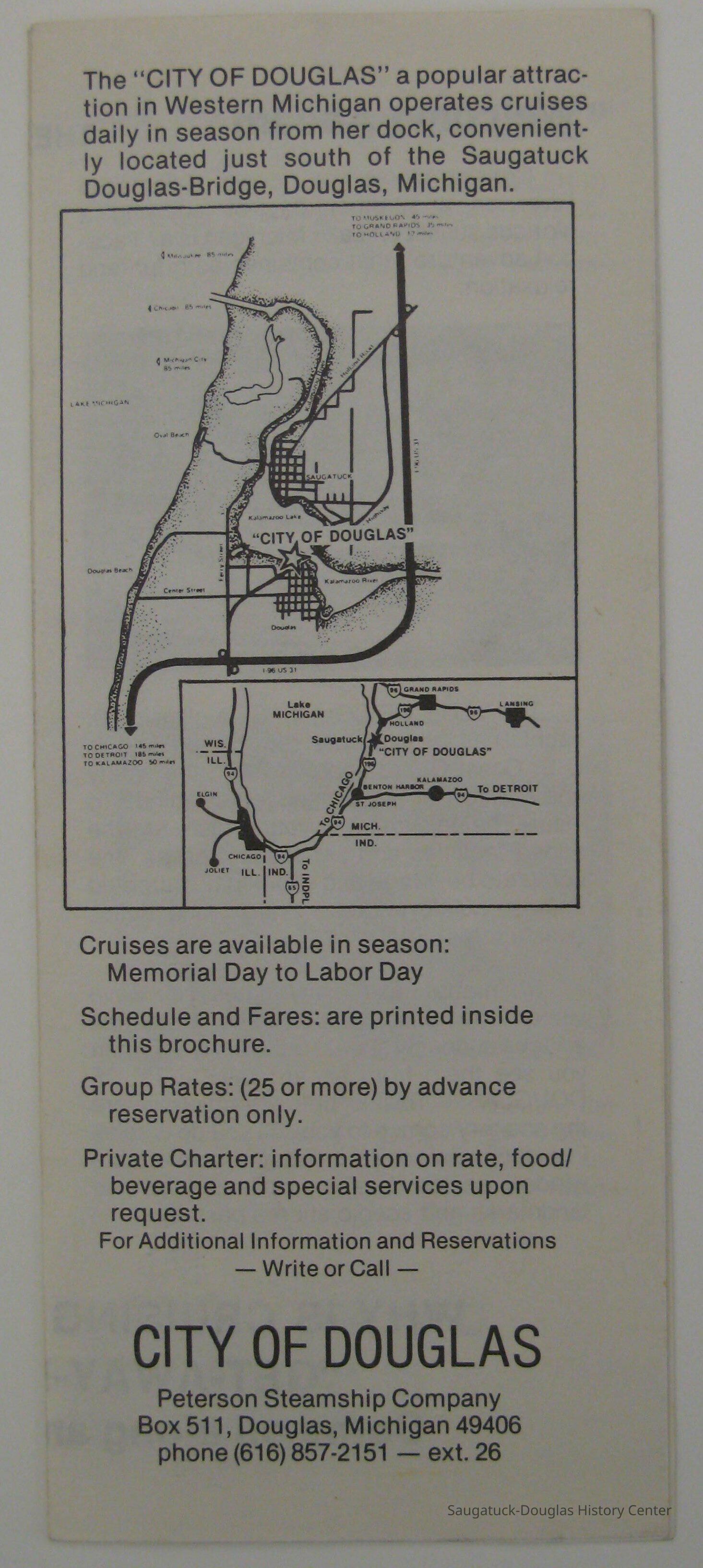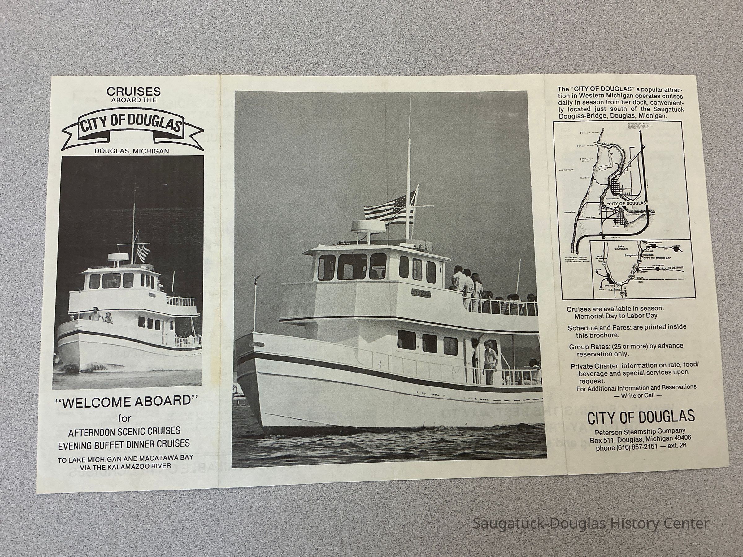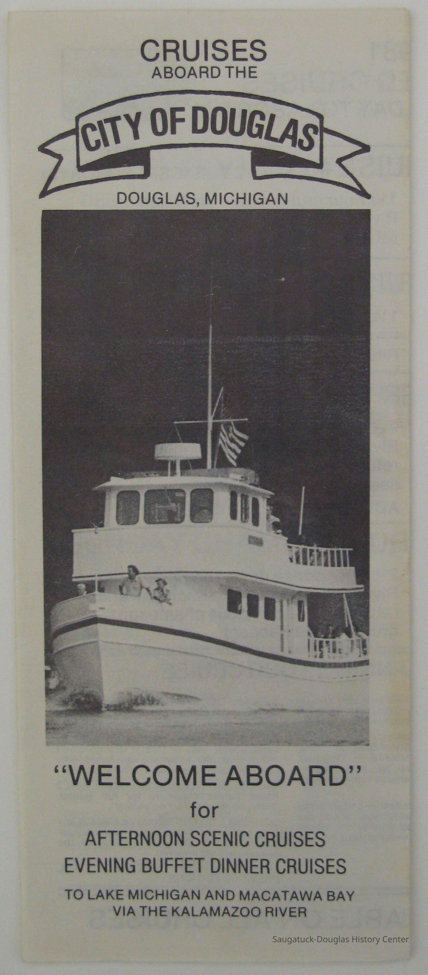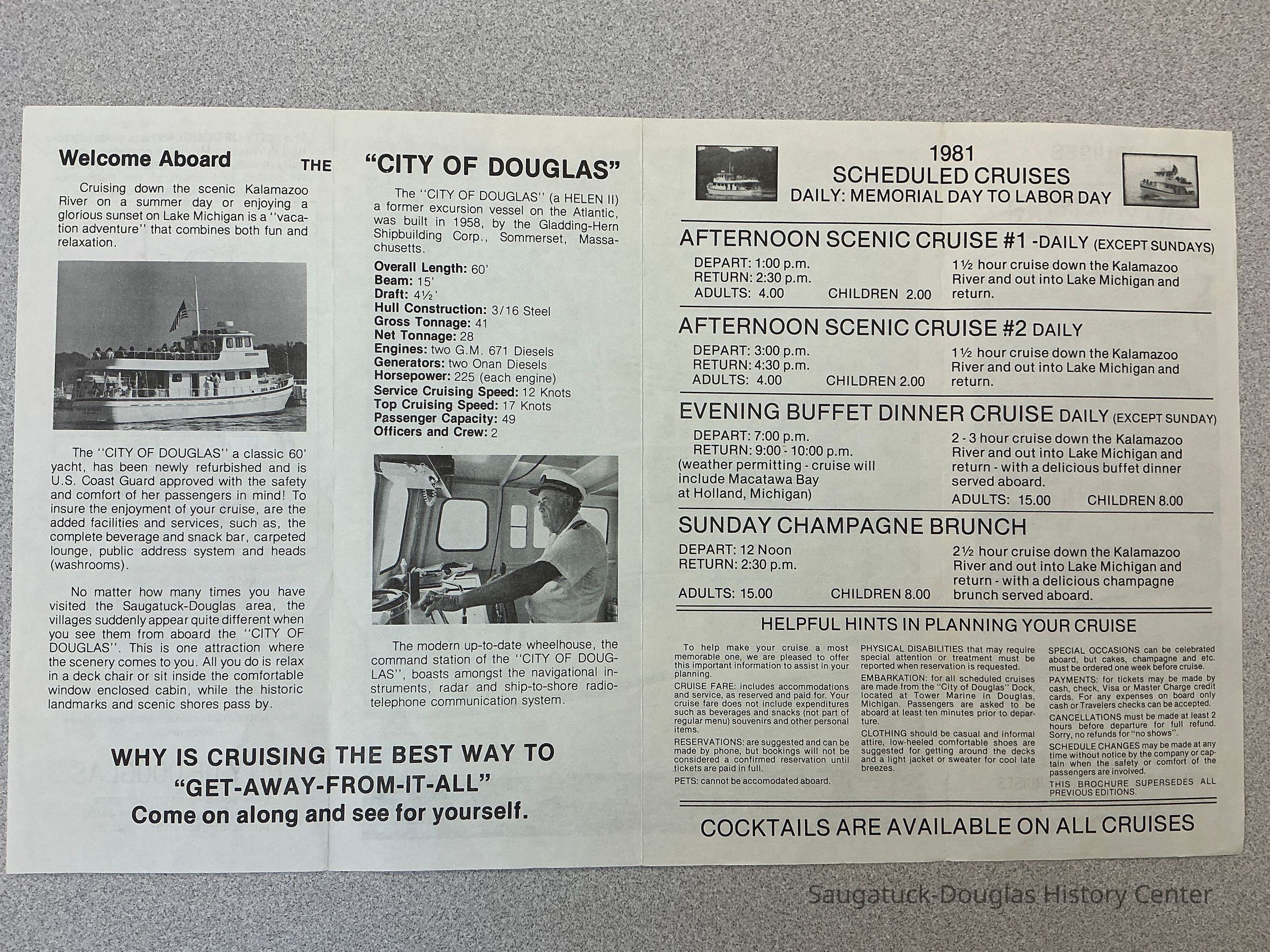 This item is a brochure for The City of Douglas cruises. The title reads, "Cruises Abouard the City of Douglas." This brochure details the history of the City of Douglas, which had previously been a private yacht. Eventually it was refurbished and used to provide tours along the Kalamazoo for Saugatuck and Douglas visitors. There is a detail for the cruise schedule for the 1981 season between Memorial and Labor Day. Services provided on the cruise are also listed.