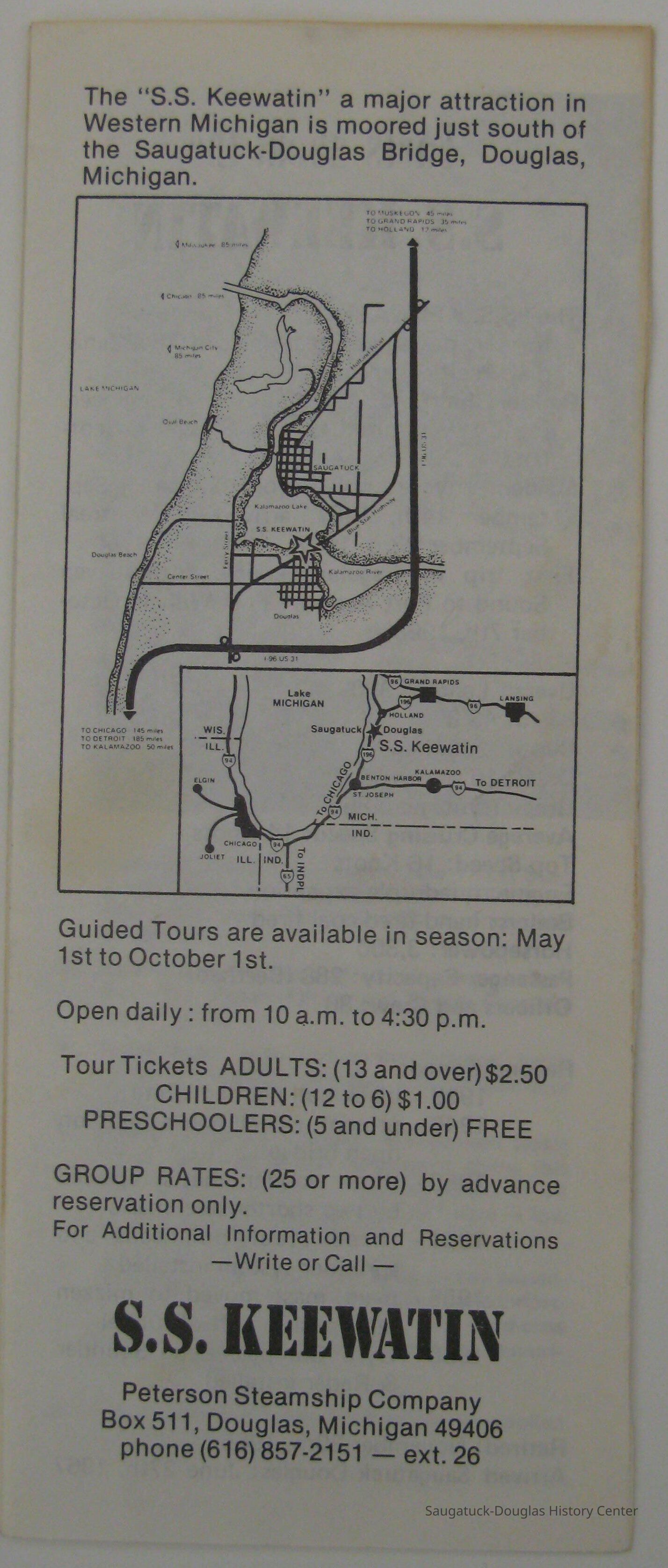 Brochure for the S.S Keewatin, which arrived in Saugatuck-Douglas in 1967. It was a former passenger steamship for the Canadian Pacific Railroad, but was turned into a living maritime museum in 1967. It remained as a museum until 2012. The brochure provides facts about the Keewatin along with a description of the museum. A map to the Keewatin's location is also provided, as well as, hours of operation and ticket rates.