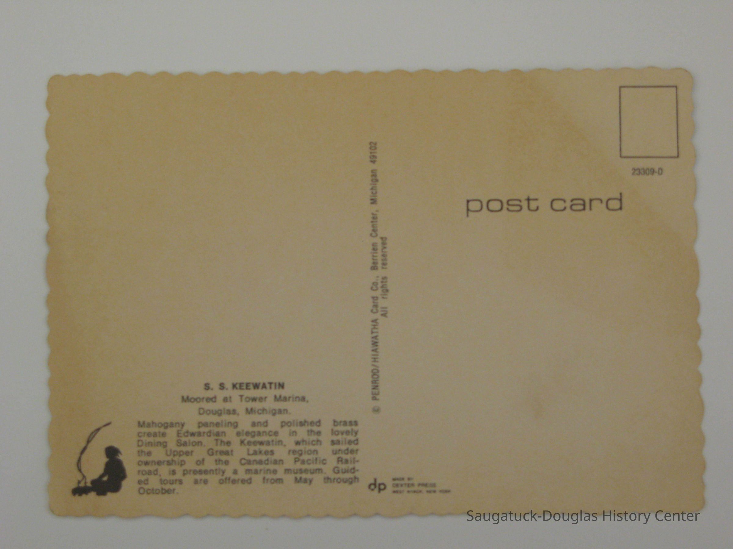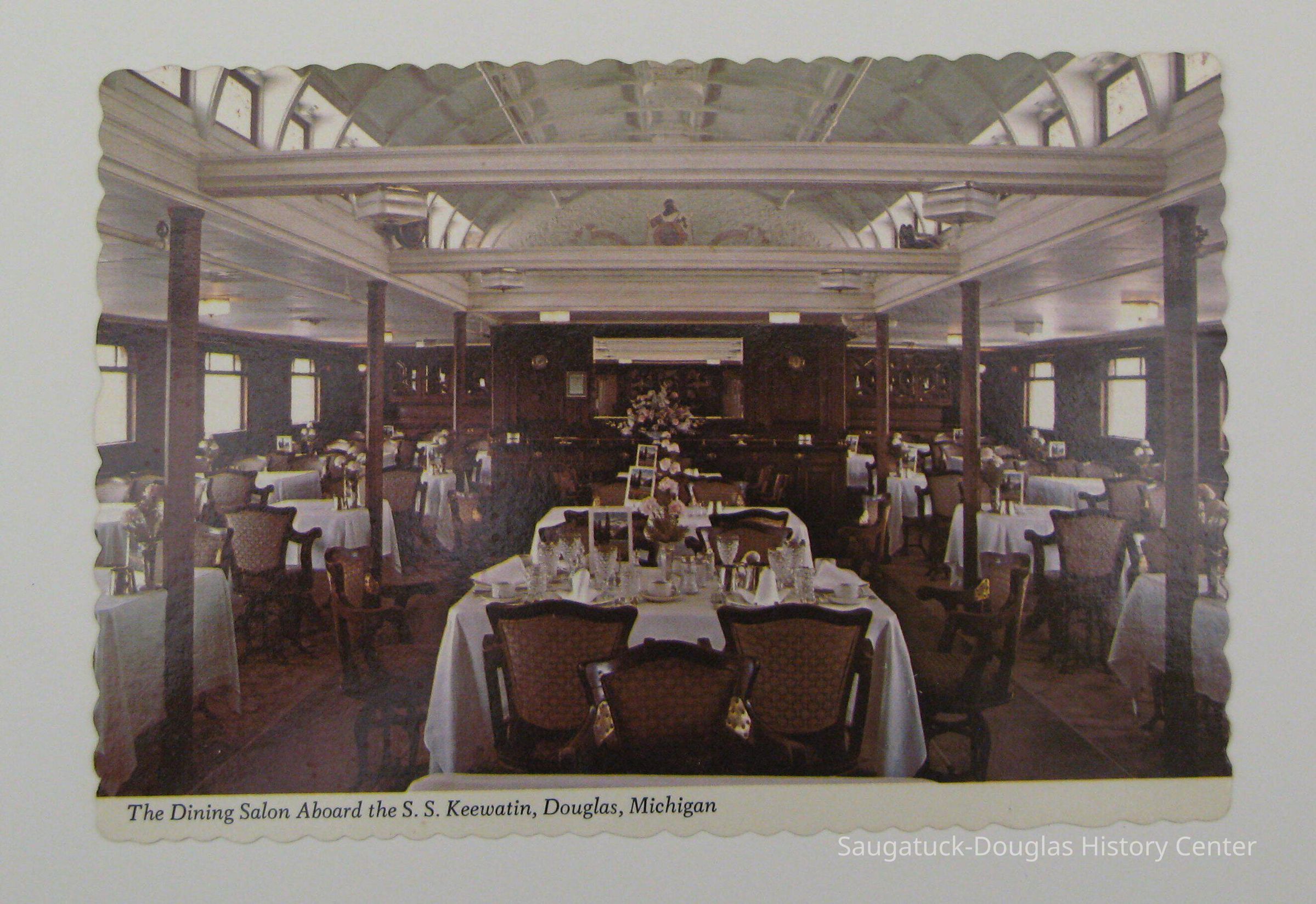 This postcard has a photo of the Dining Salon of the S.S Keewatin on the front. The back has a brief description of the dining salon along with information about the museum's seasons of operation. The Copyright for the photo is printed on the back as well, it reads, "Penrod/Hiawatha Card Co. Berrien Center, Michigan." There is no message written on the card or any stamps. This was a promotional postcard for the Keewating while it remained as a museum in Douglas until 2012.