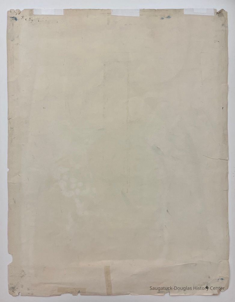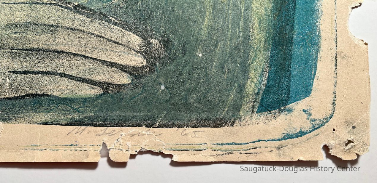 Poly-chrome lithograph of a woman with black hair and a blue-green background and dress. Image is signed as a proof by M. Lerner '65. Unframed.