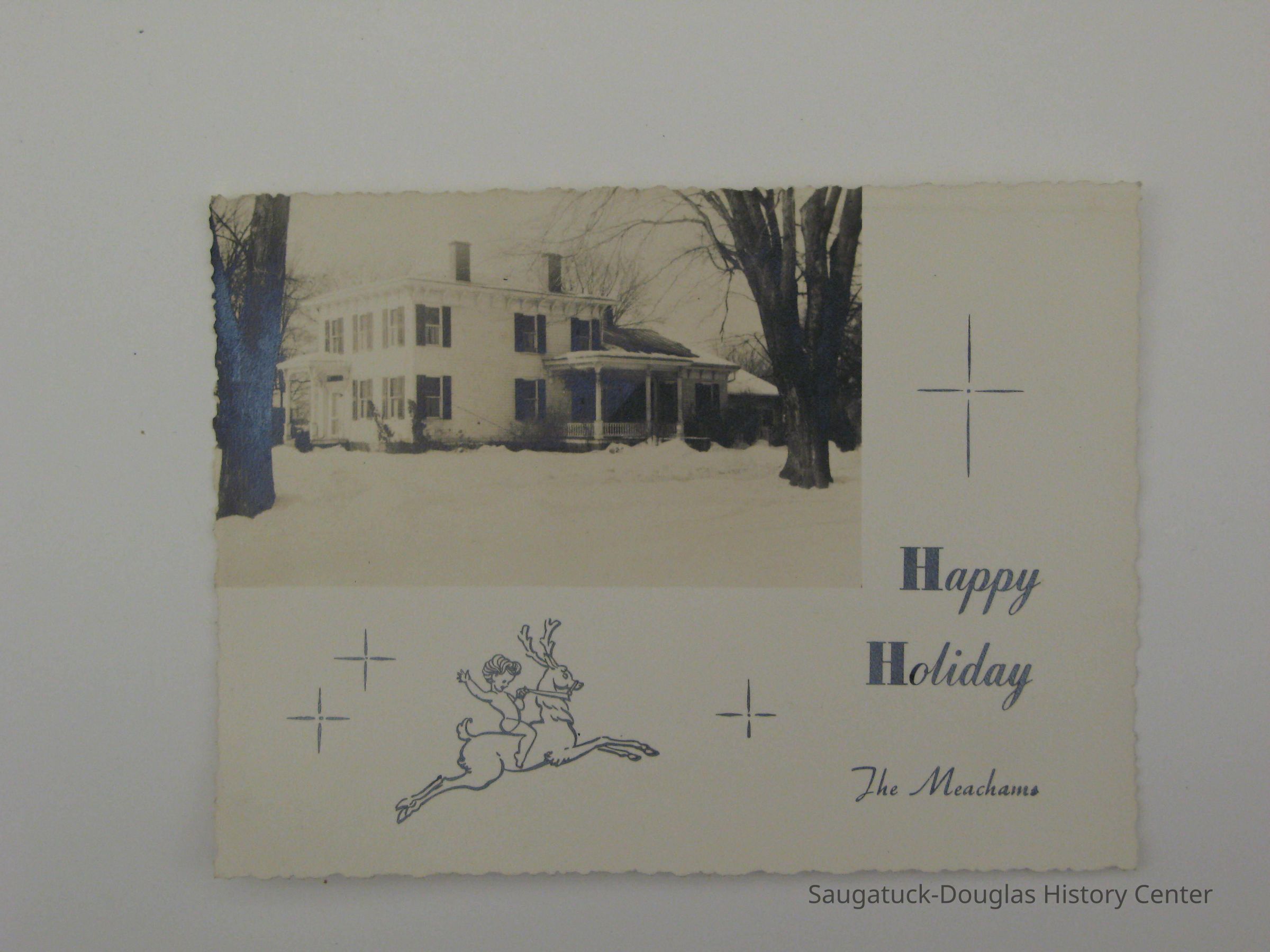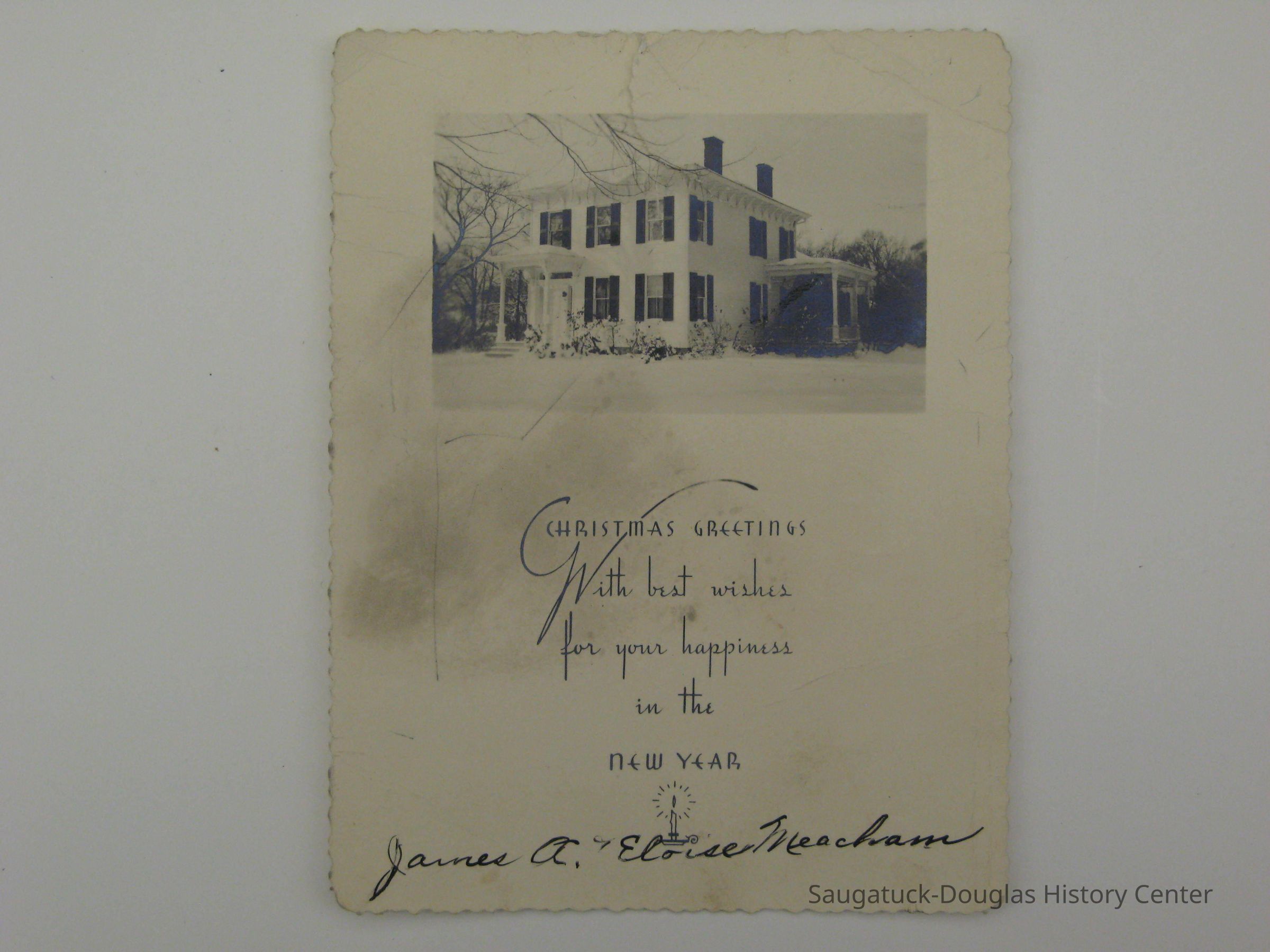 Two Christmas cards from unknown years. The front of the cards both have a photo of a home, taken from different angles. The back, though, is blank. Both were, presumably, given to the Moker family at Christmas from James and Eloise Meacham. These were custom made cards and have "Happy Holidays" on one and "Christmas Greetins with best wishes for your happiness in the new year" printed on them along with small christmas themed designs.