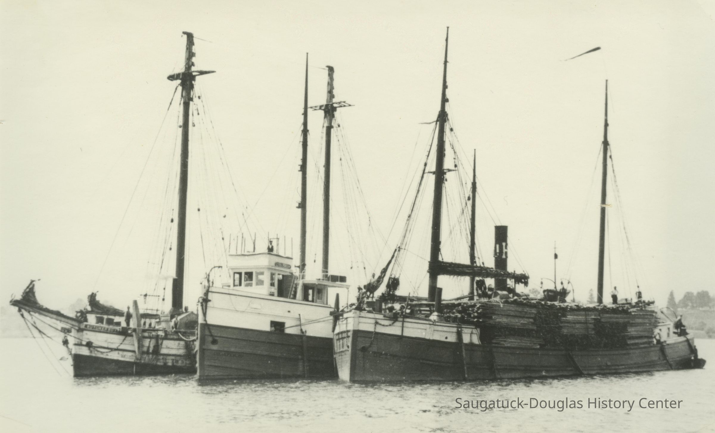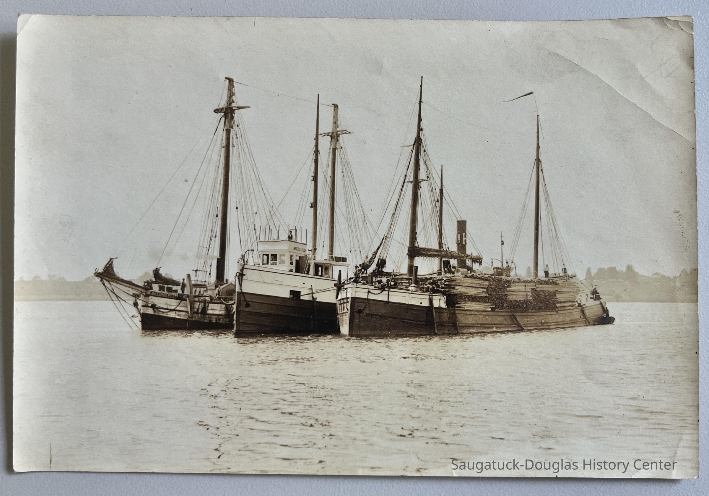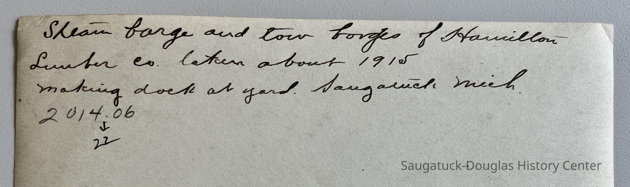 Written on the back of the photo "Steam barge and tow barges for Hamilton Lumber Co. ?? about 1915 making dock at yard. Saugatuck, Mich."