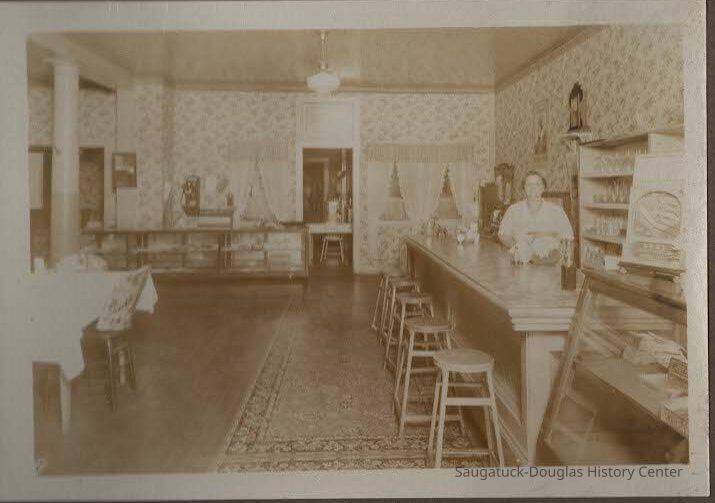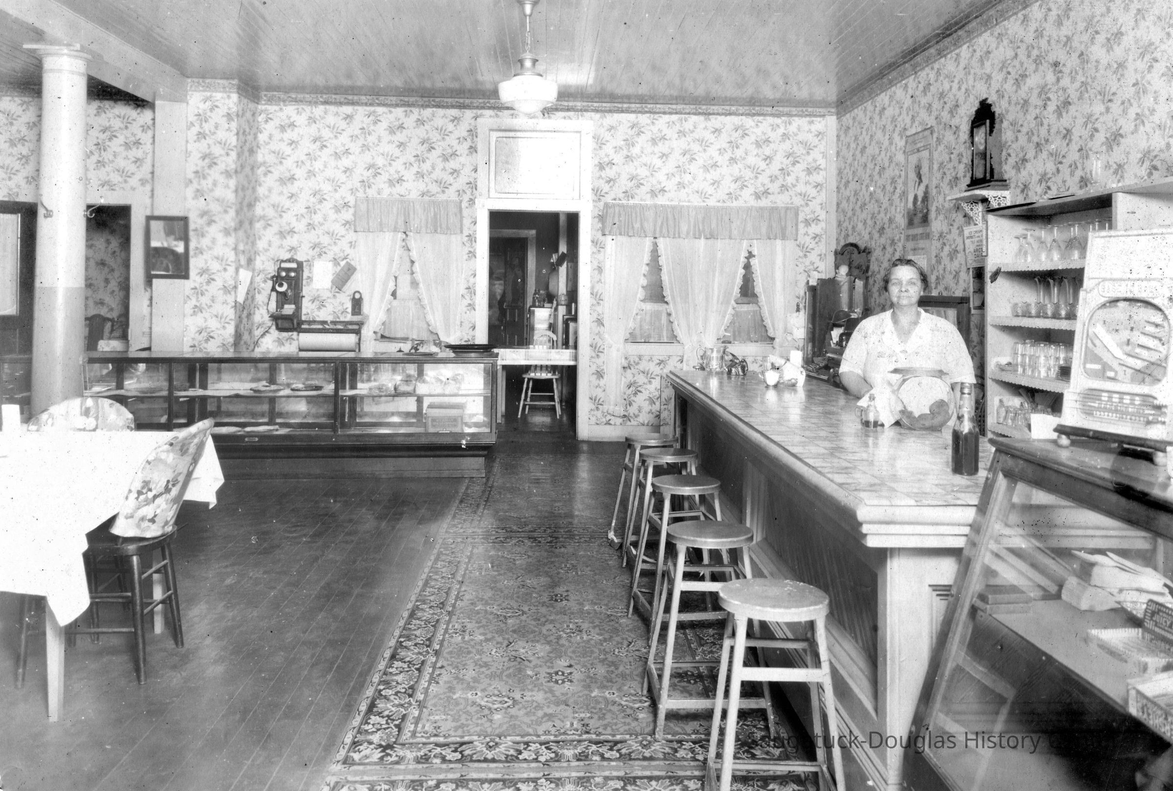 A sepia and white photograph of the inside of the Douglas Cafe from the first half of the 20th century. A woman stands behind the counter on the right. It shows a table to the left and another counter towards the back center of the room. There are also stools by the counter on the right. There is also a copy in Box 21.