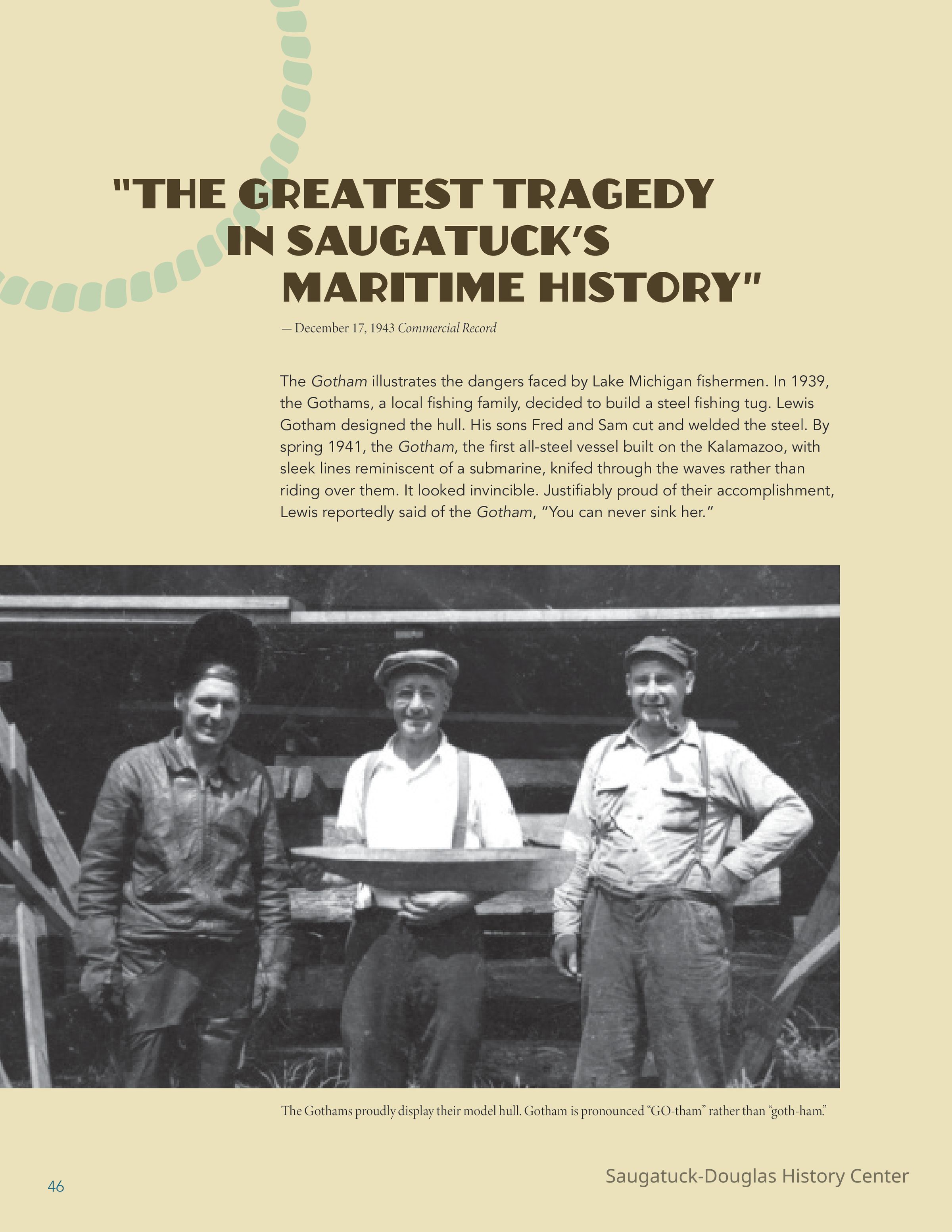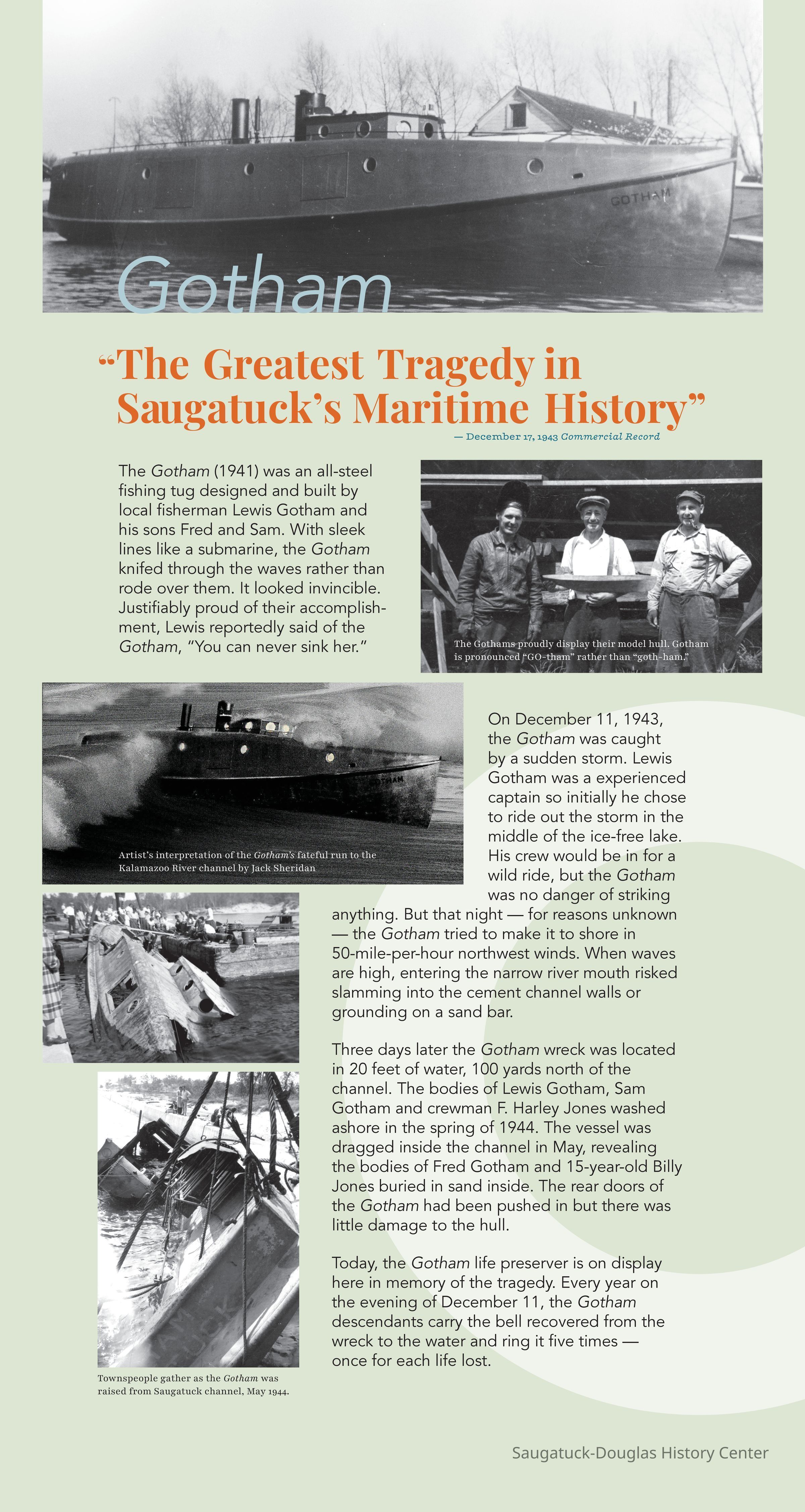 Five people, Lewis Gotham, Sam Gotham, Fred Gotham, F. Harley Jones and 15-year-old Billy Jones perished when the Gotham went down at the narrow mouth of the Kalamazoo River.