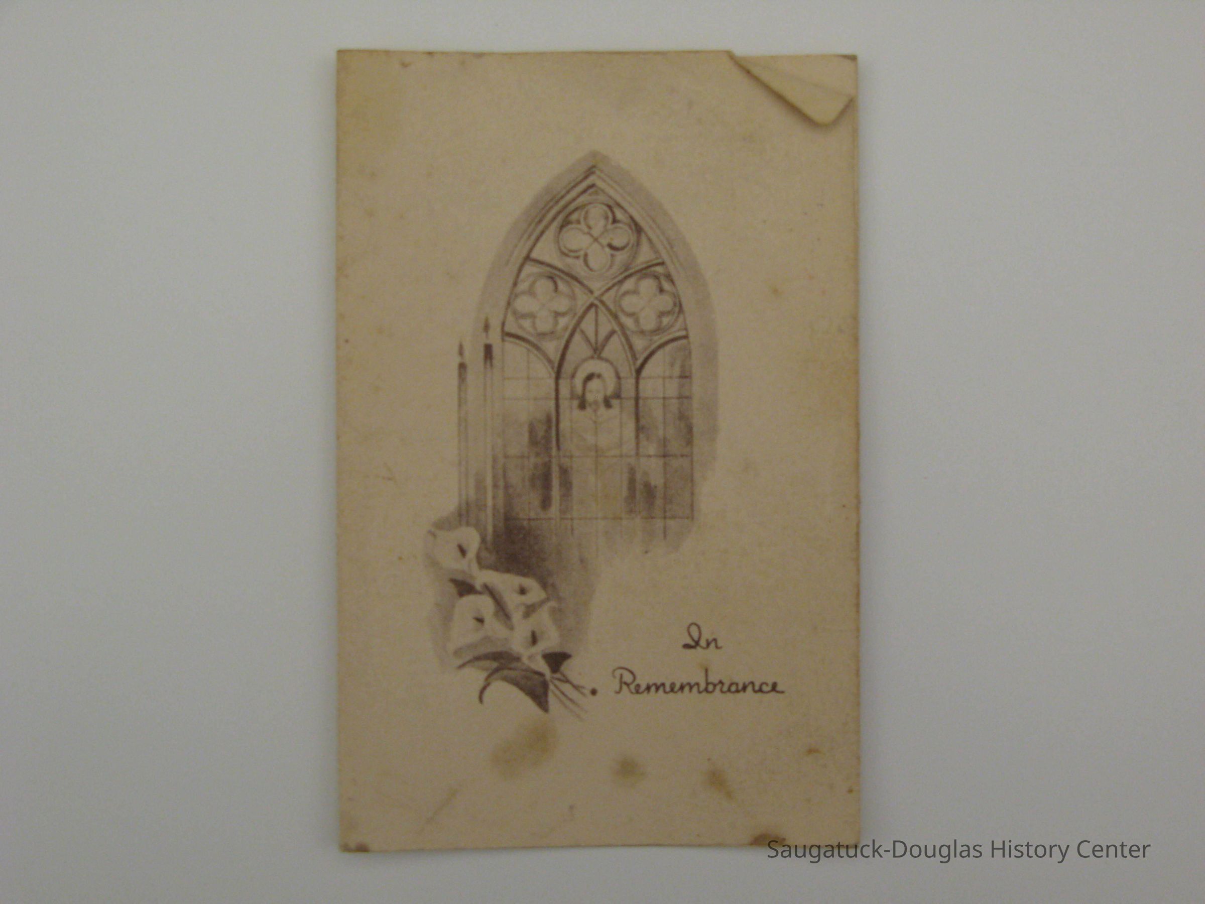Paper memorical card for the service for Lila Fern Heath. The card is small and has a trifold. The cover has a printed image of church windows while the inside folds contain a poem by John Whittier and details about the service. It was held on February 2, 1942 at the Dykstra Funeral Home at 2:00 PM. Lila Heath's final resting place was in the Graafschap Cemetary. It is very likely that the Moker family knew Lila Heath and attended her memorial service, keeping the card afterwards.