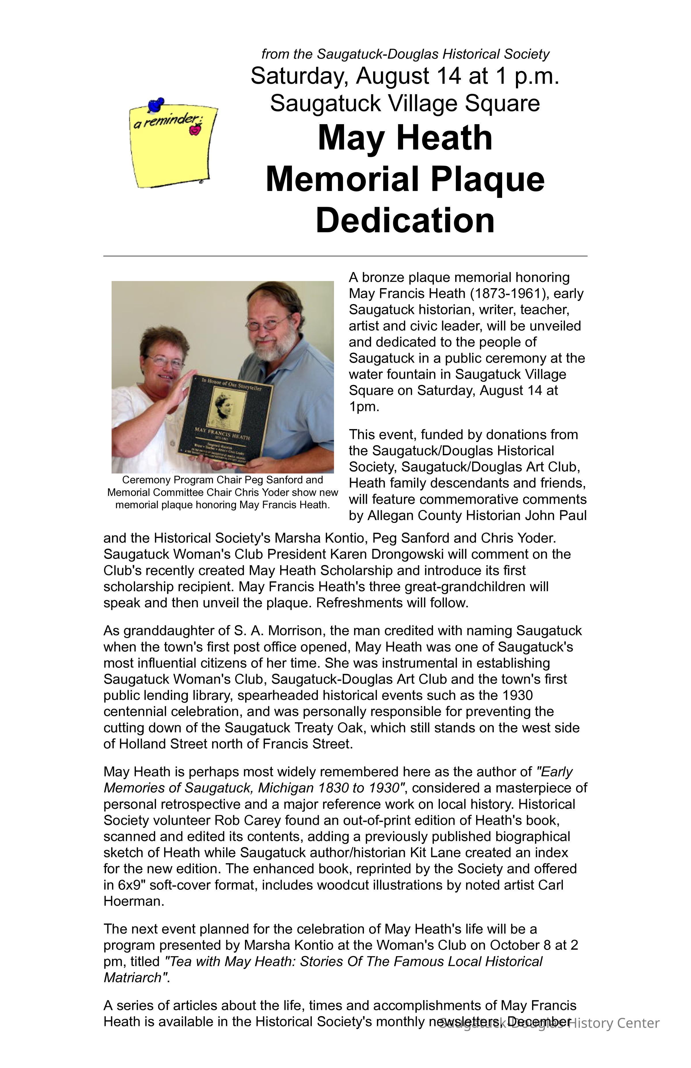 SDHC email: Saturday, August 14 at 1 p.m. Saugatuck Village Square May Heath Memorial Plaque Dedication A bronze plaque memorial honoring May Francis Heath (1873-1961), early Saugatuck historian, writer, teacher, artist and civic leader, will be unveiled and dedicated to the people of Saugatuck in a public ceremony at the water fountain in Saugatuck Village Square on Saturday, August 14 at 1pm. This event, funded by donations from the Saugatuck/Douglas Historical Society, Saugatuck/Douglas Art Club, Heath family descendants and friends, will feature commemorative comments by Allegan County Historian John Paul and the Historical Society's Marsha Kontio, Peg Sanford and Chris Yoder. Saugatuck Woman's Club President Karen Drongowski will comment on the Club's recently created May Heath Scholarship and introduce its first scholarship recipient. May Francis Heath's three great-grandchildren will speak and then unveil the plaque. Refreshments will follow. As granddaughter of S. A. Morrison, the man credited with naming Saugatuck when the town's first post office opened, May Heath was one of Saugatuck's most influential citizens of her time. She was instrumental in establishing Saugatuck Woman's Club, Saugatuck-Douglas Art Club and the town's first public lending library, spearheaded historical events such as the 1930 centennial celebration, and was personally responsible for preventing the cutting down of the Saugatuck Treaty Oak, which still stands on the west side of Holland Street north of Francis Street. May Heath is perhaps most widely remembered here as the author of "Early Memories of Saugatuck, Michigan 1830 to 1930", considered a masterpiece of personal retrospective and a major reference work on local history. Historical Society volunteer Rob Carey found an out-of-print edition of Heath's book, scanned and edited its contents, adding a previously published biographical sketch of Heath while Saugatuck author/historian Kit Lane created an index for the new edition. The enhanced book, reprinted by the Society and offered in 6x9" soft-cover format, includes woodcut illustrations by noted artist Carl Hoerman. The next event planned for the celebration of May Heath's life will be a program presented by Marsha Kontio at the Woman's Club on October 8 at 2 pm, titled "Tea with May Heath: Stories Of The Famous Local Historical Matriarch". A series of articles about the life, times and accomplishments of May Francis Heath is available in the Historical Society's monthly newsletters, December 2009 through current, which can be viewed and printed out on www.sdhistoricalsociety.org; select News Library, then E-News.