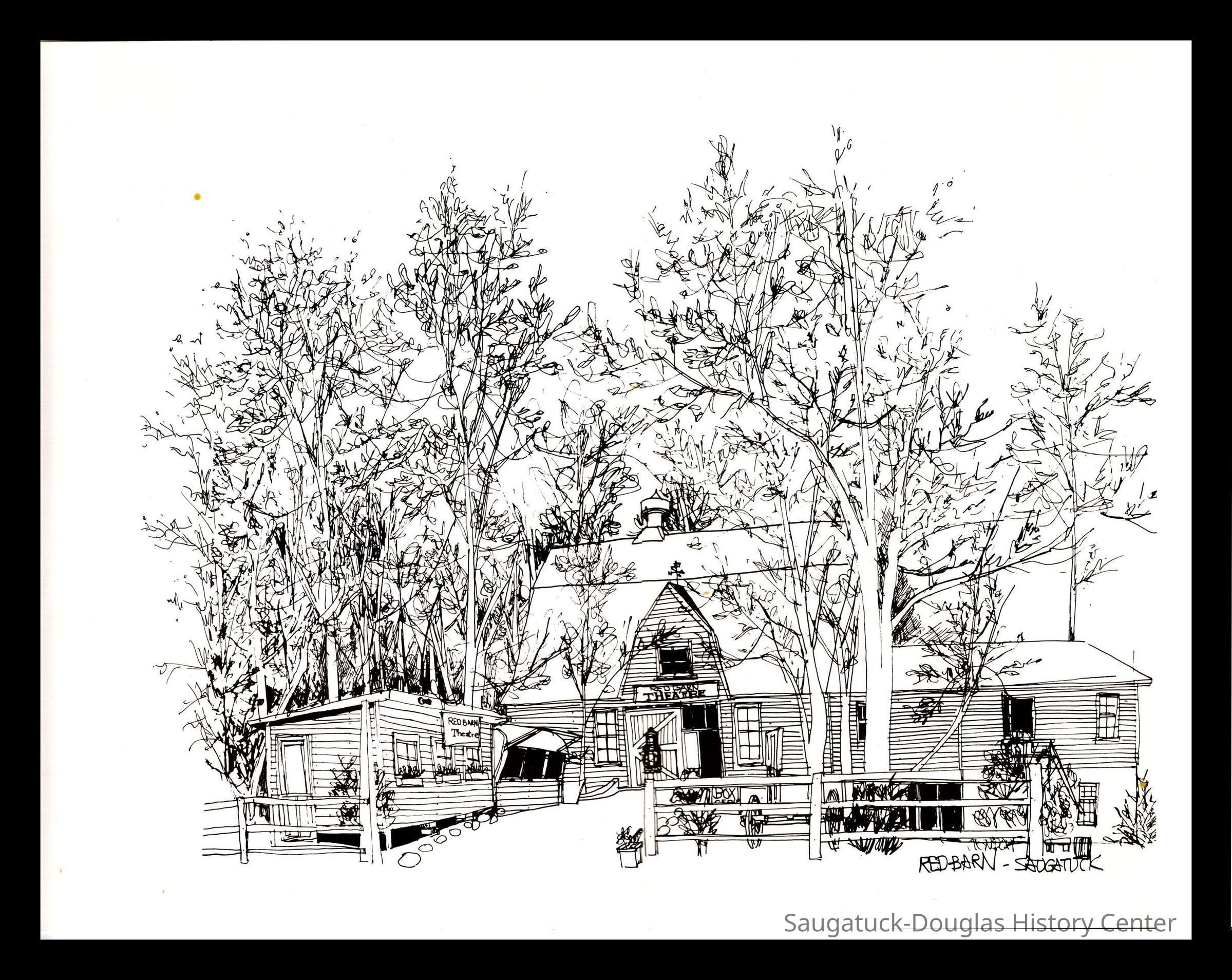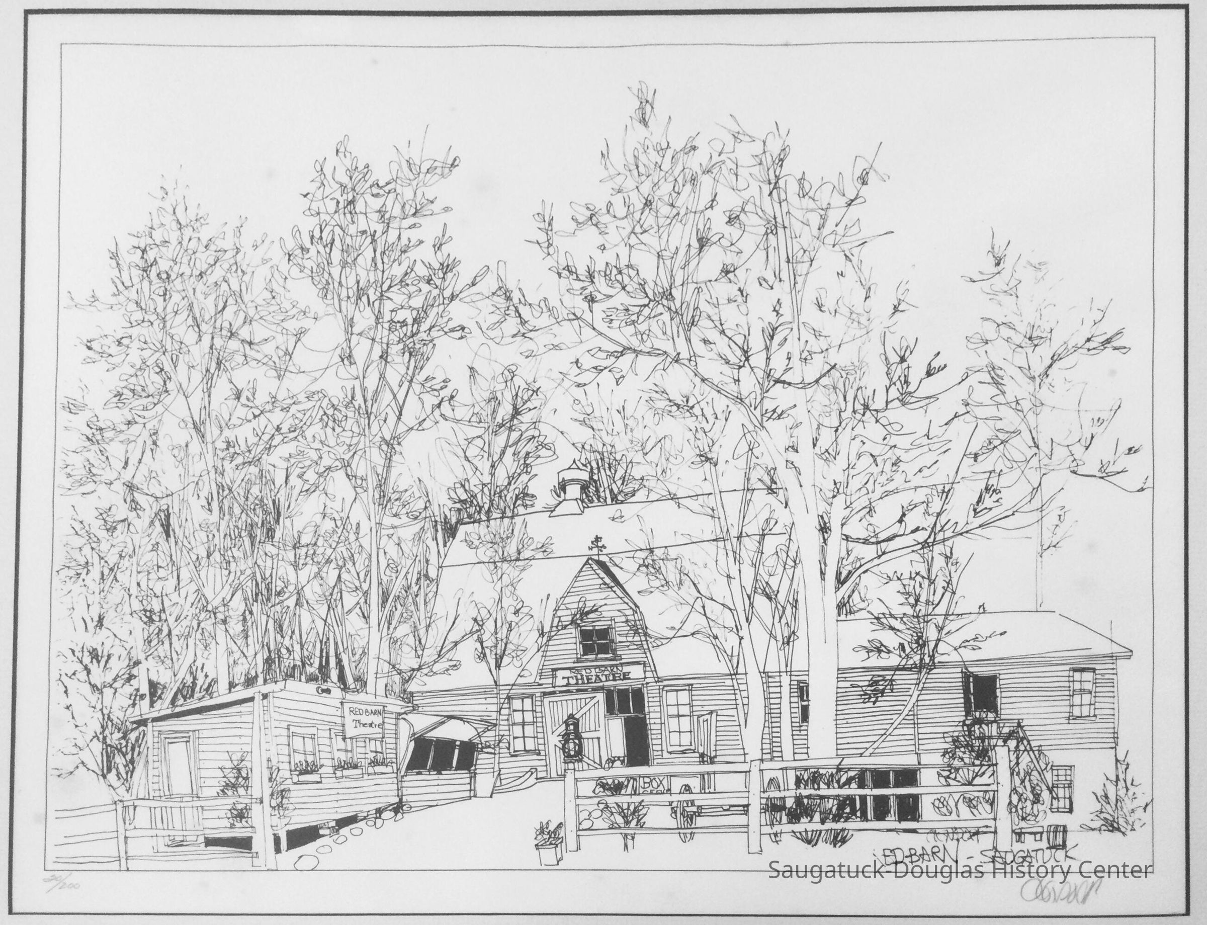A print of a pen and ink drawing of the entrance view of the Red Barn Theatre, by William Olendorf. Olendorf made the Red Barn series for a fundraiser to raise money for the theatre.