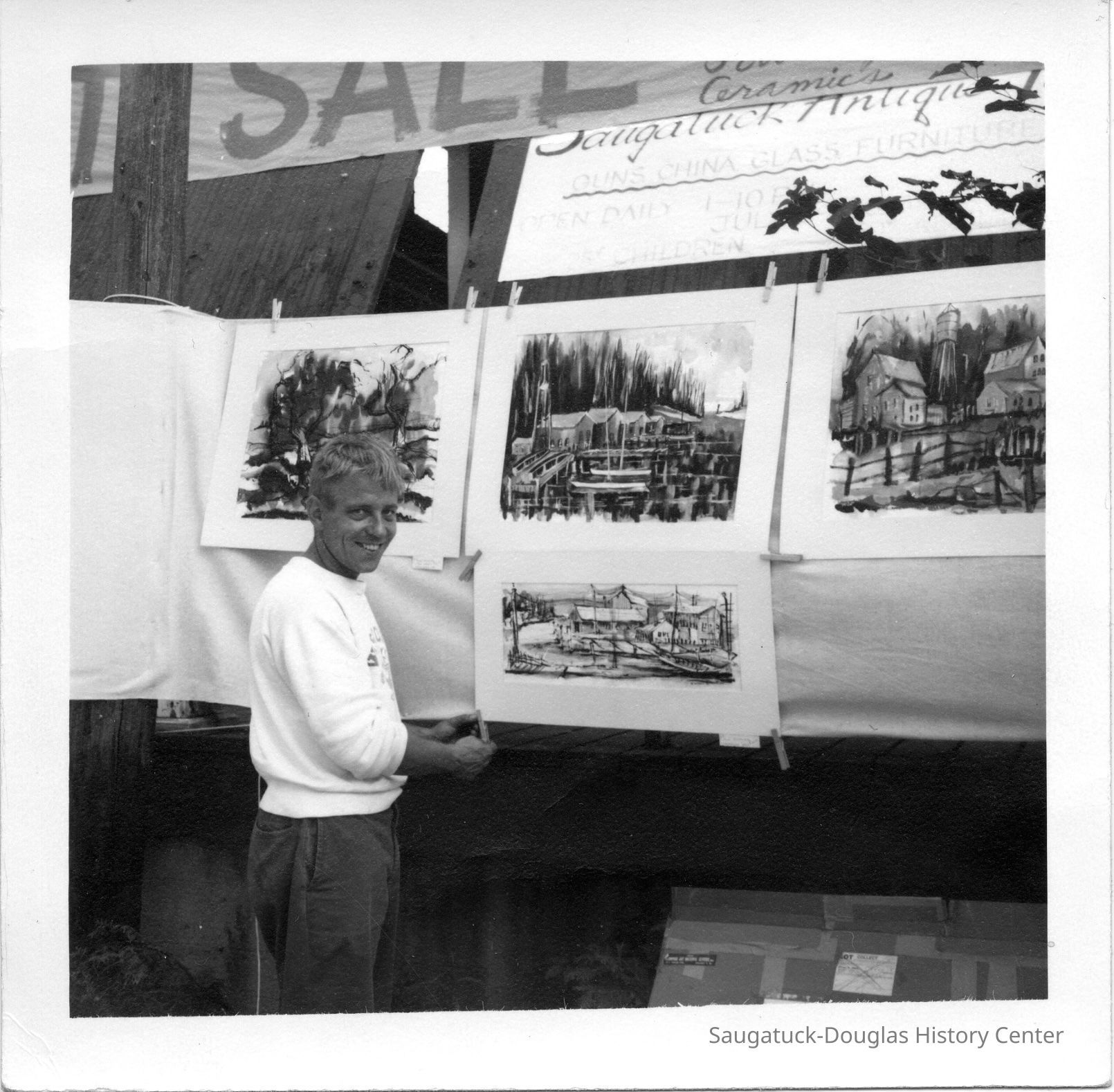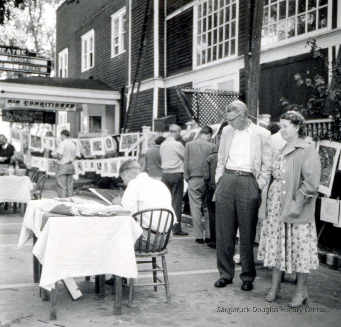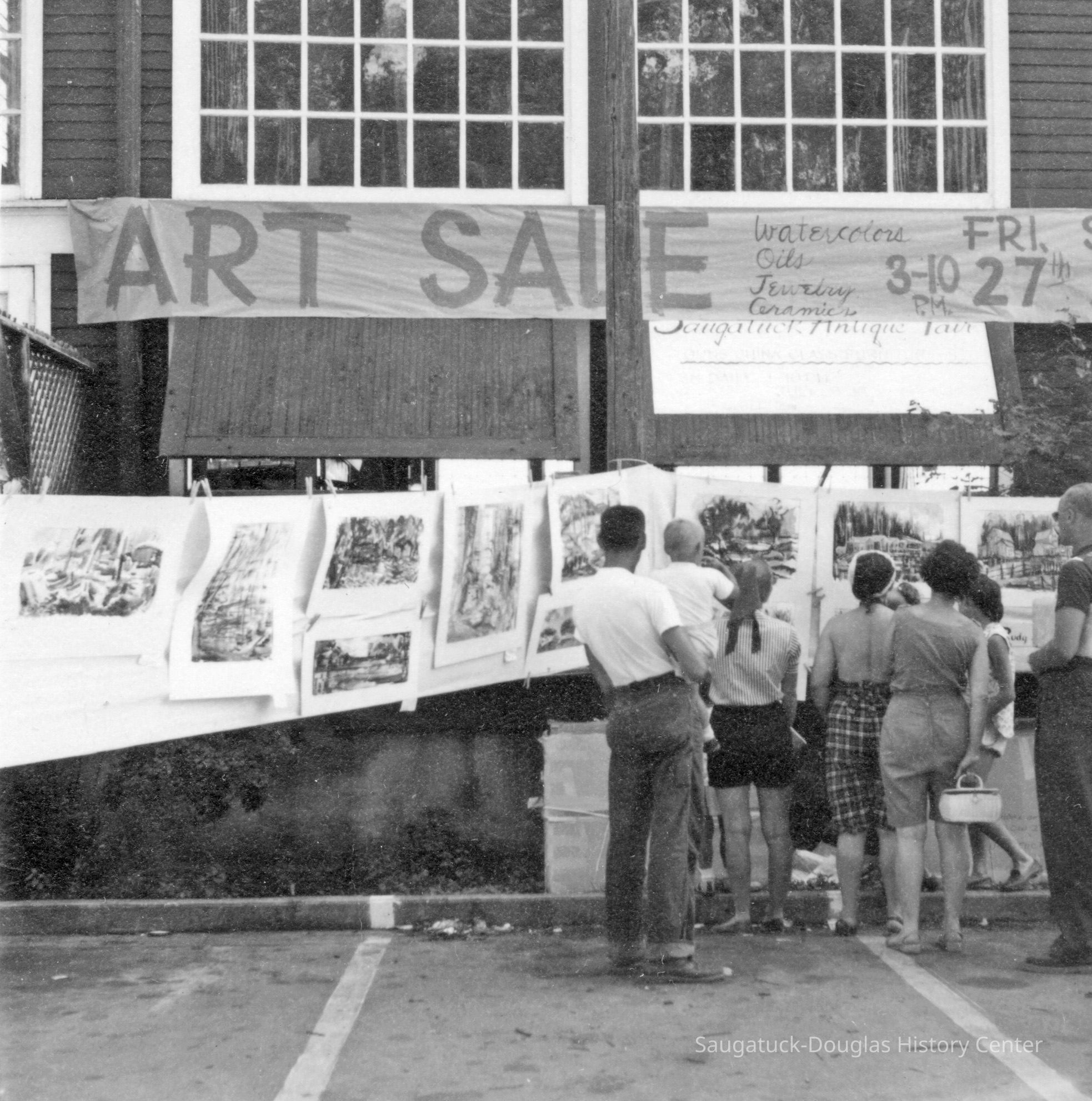 Digital images of adults looking at landscape paintings at an art sale outside the Big Pavilion. The unframed artworks are on paper and hung on ropes in a clothesline art show. The peoples clothing suggest the sale happened in the 1950s.