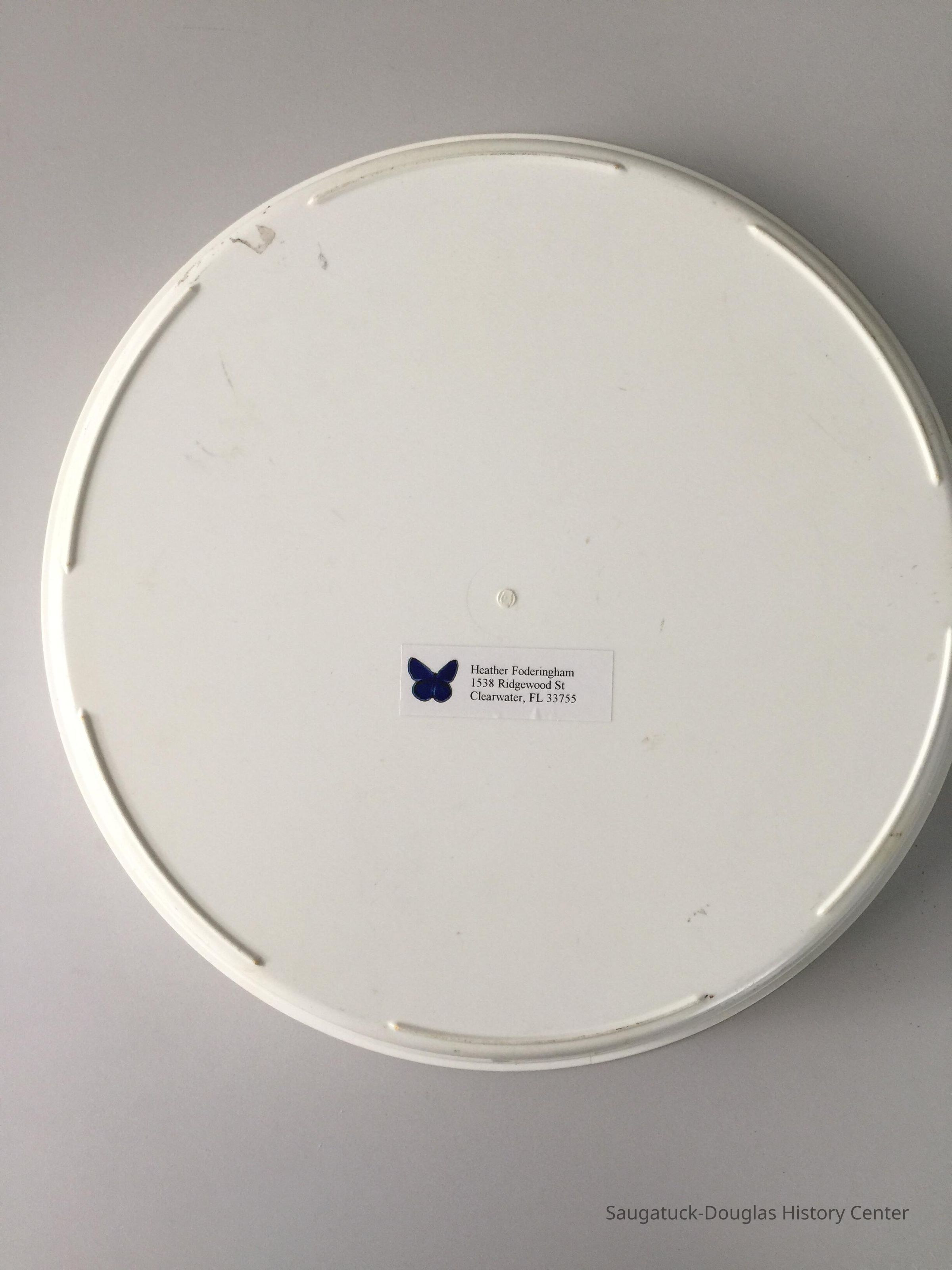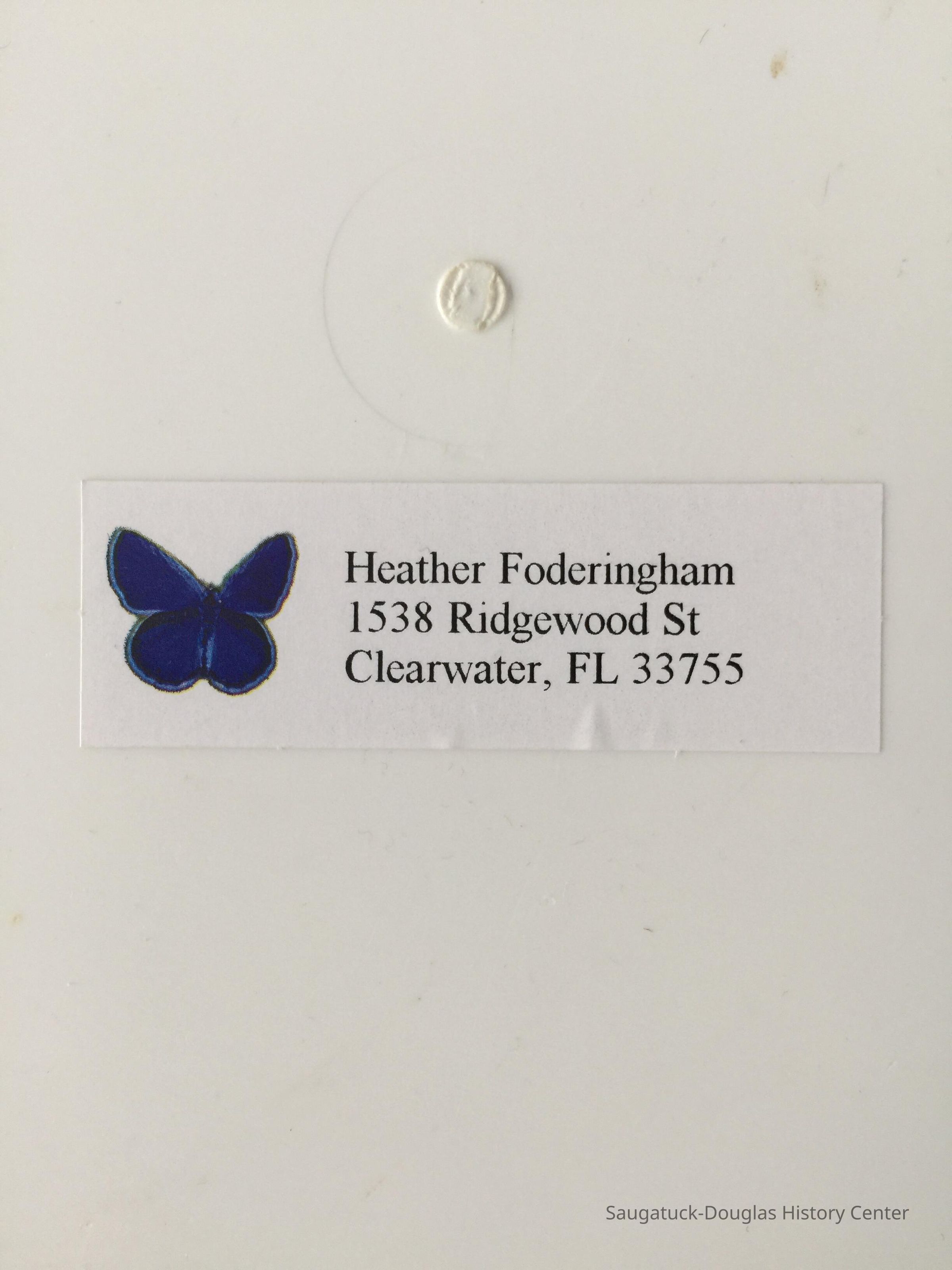 A return address label on the back of the tray is adorned with a blue butterfly and the words "Heather Foderingham 1538 Ridgewood St. Clearwater, FL 33755"