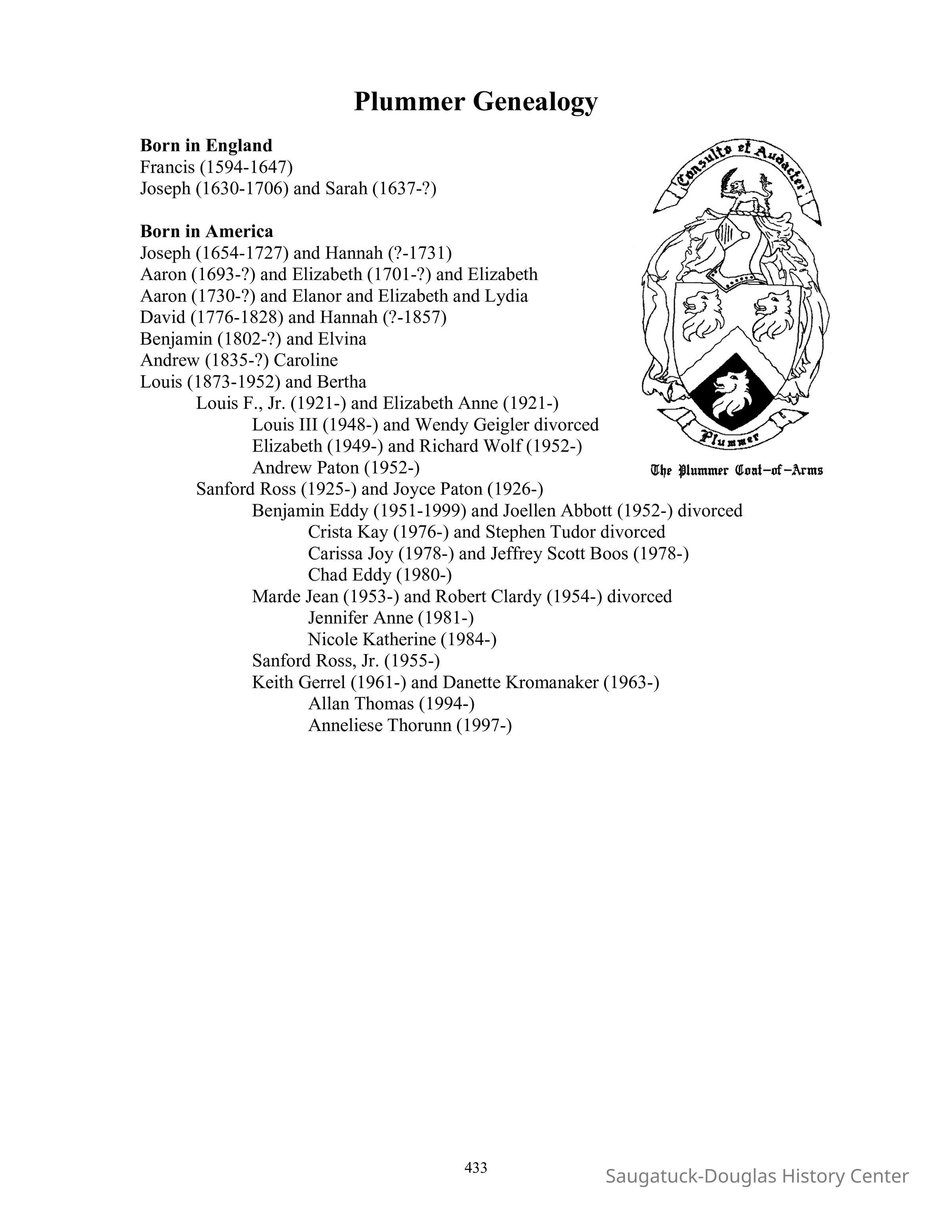 Plummer, Benjamin 1802-1885Eddy, Lillian (Grimes) 1863-1955Eddy, Scott Wilmoth 1843-1930Eddy, Rayond Grimes 1895-1973Plummer, Andrews Ames 1835-1917Plummer, Elmer Earnest 1871-1955Plummer, Joyce Paton (Eddy) 1926-2016Plummer, Sanford Ross 1925-2008Plummer, Louis Frank Sr. 1873-1952