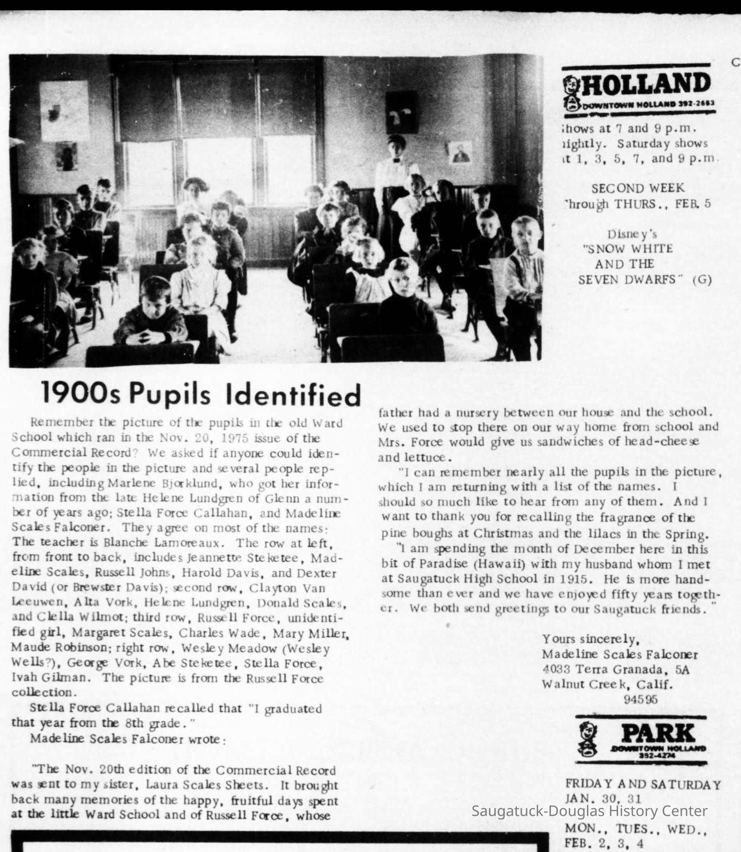 Photograph and 1976 Bicentennial newspaper article written about the photo of Ward School pupils, circa 1910