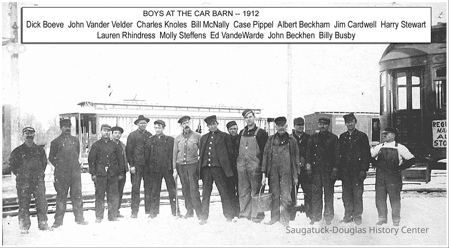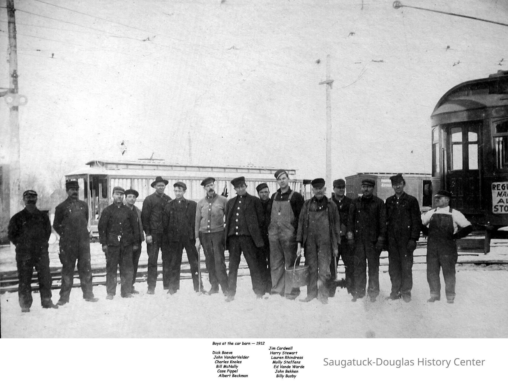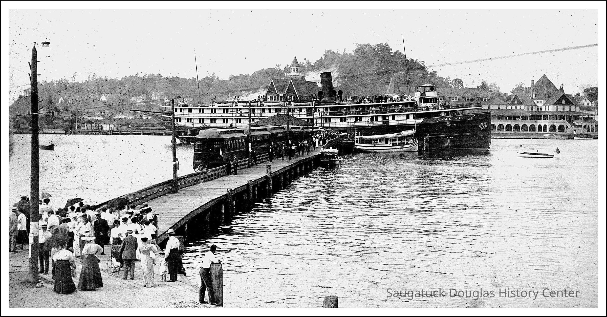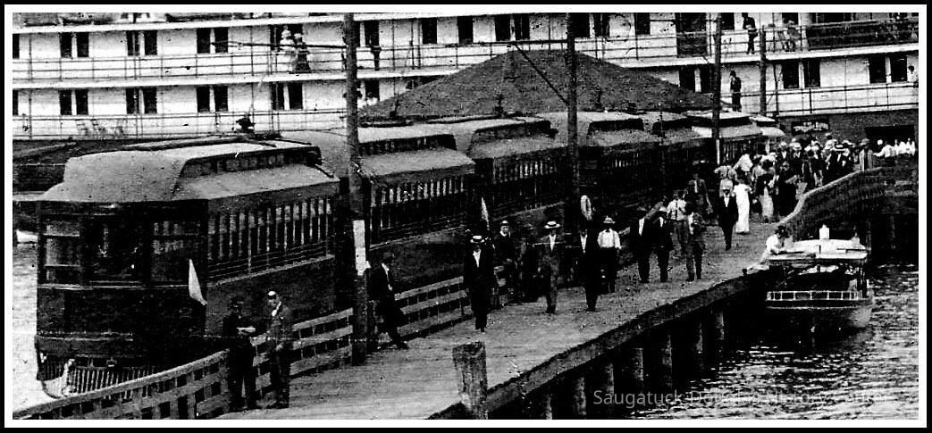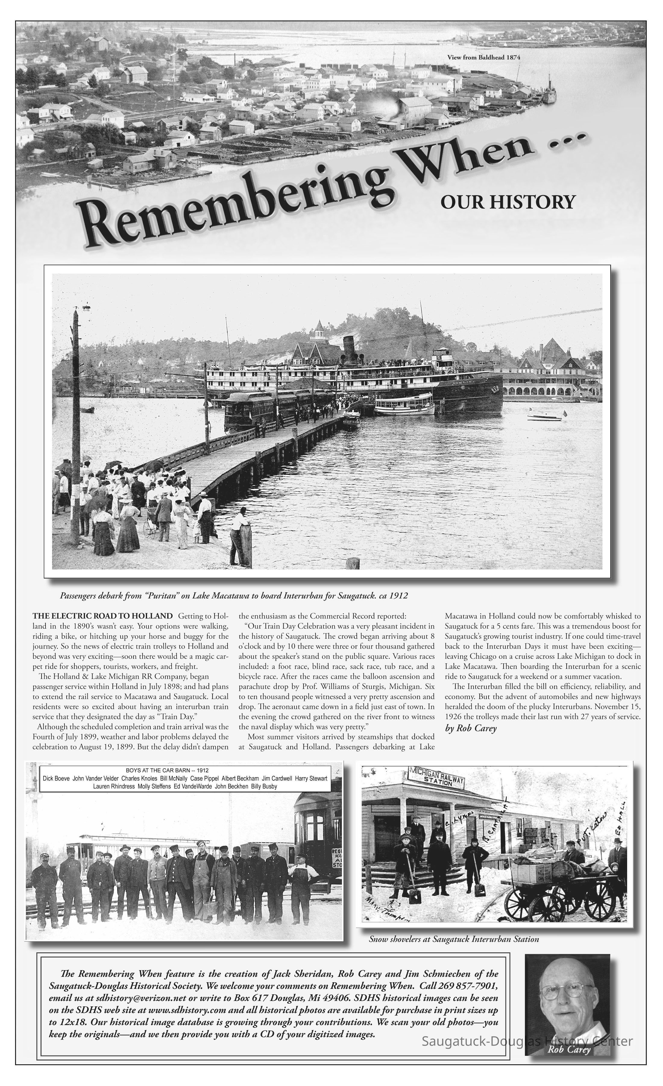 [Part 1 is at 2021.87.46] THE ELECTRIC ROAD TO HOLLAND Getting to Holland in the 1890’s wasn’t easy. Your options were walking, riding a bike, or hitching up your horse and buggy for the journey. So the news of electric train trolleys to Holland and beyond was very exciting—soon there would be a magic carpet ride for shoppers, tourists, workers, and freight. The Holland & Lake Michigan RR Company, began passenger service within Holland in July 1898; and had plans to extend the rail service to Macatawa and Saugatuck. Local residents were so excited about having an interurban train service that they designated the day as “Train Day.” Although the scheduled completion and train arrival was the Fourth of July 1899, weather and labor problems delayed the celebration to August 19, 1899. But the delay didn’t dampen the enthusiasm as the Commercial Record reported: “Our Train Day Celebration was a very pleasant incident in the history of Saugatuck. The crowd began arriving about 8 o’clock and by 10 there were three or four thousand gathered about the speaker’s stand on the public square. Various races included: a foot race, blind race, sack race, tub race, and a bicycle race. After the races came the balloon ascension and parachute drop by Prof. Williams of Sturgis, Michigan. Six to ten thousand people witnessed a very pretty ascension and drop. The aeronaut came down in a field just east of town. In the evening the crowd gathered on the river front to witness the naval display which was very pretty.” Most summer visitors arrived by steamships that docked at Saugatuck and Holland. Passengers debarking at Lake Macatawa in Holland could now be comfortably whisked to Saugatuck for a 5 cents fare. This was a tremendous boost for Saugatuck’s growing tourist industry. If one could time-travel back to the Interurban Days it must have been exciting—leaving Chicago on a cruise across Lake Michigan to dock in Lake Macatawa. Then boarding the Interurban for a scenic ride to Saugatuck for a weekend or a summer vacation. The Interurban filled the bill on efficiency, reliability, and economy. But the advent of automobiles and new highways heralded the doom of the plucky Interurbans. November 15, 1926 the trolleys made their last run with 27 years of service. by Rob Carey