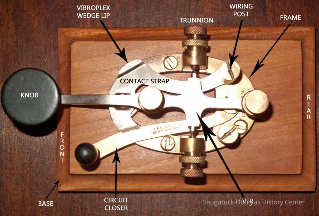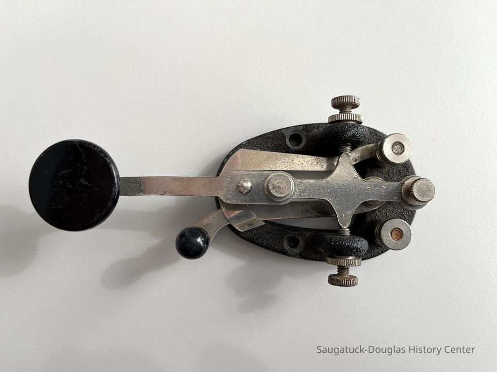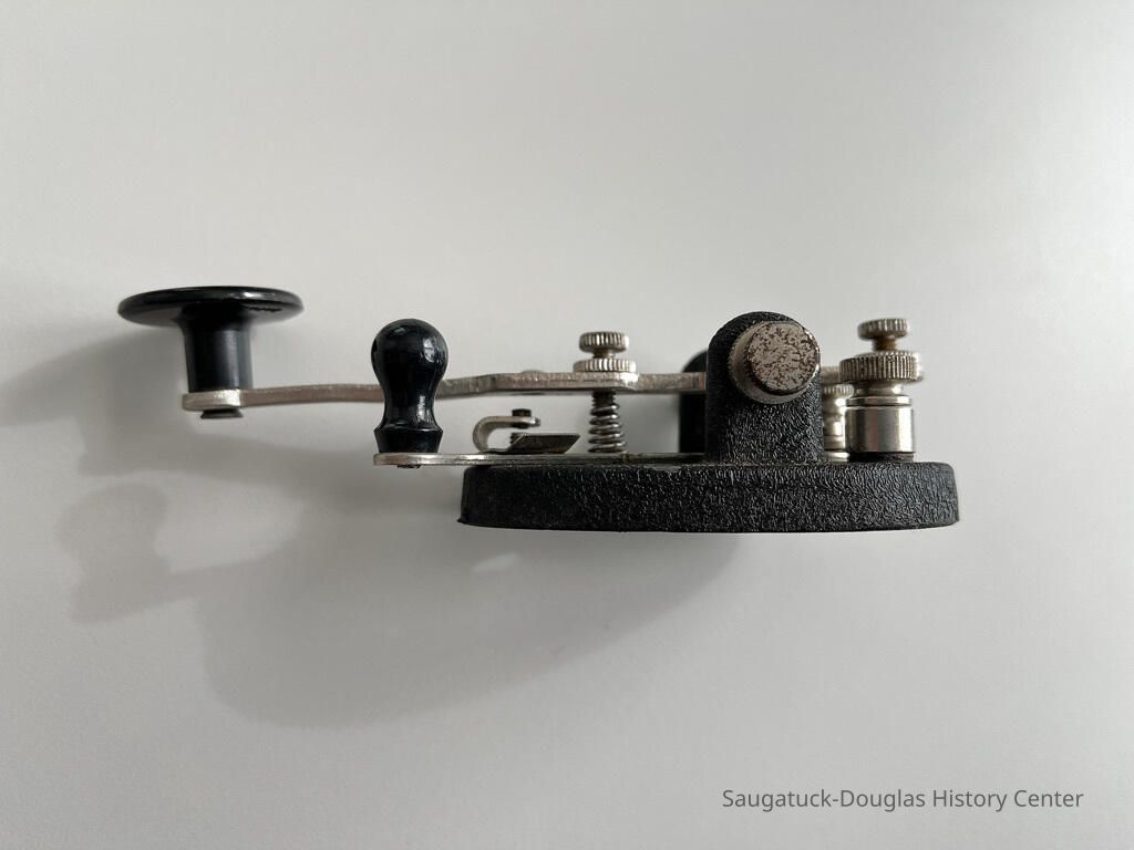 A cast metal oval, with holes to attach it to a work surface, and painted with a wrinkly, black paint, is the frame of this Hand or Straight key. The steel upper lever forms the key, a on-off switch that pivots over the frame and ends with a flat, circular, black knob. The Bakelite or plastic knob is stamped "JAPAN" on its underside. The smaller, spherical black knob is a circuit closer. Additional metal screws are the wiring posts and to adjust the Key's spring and contact.