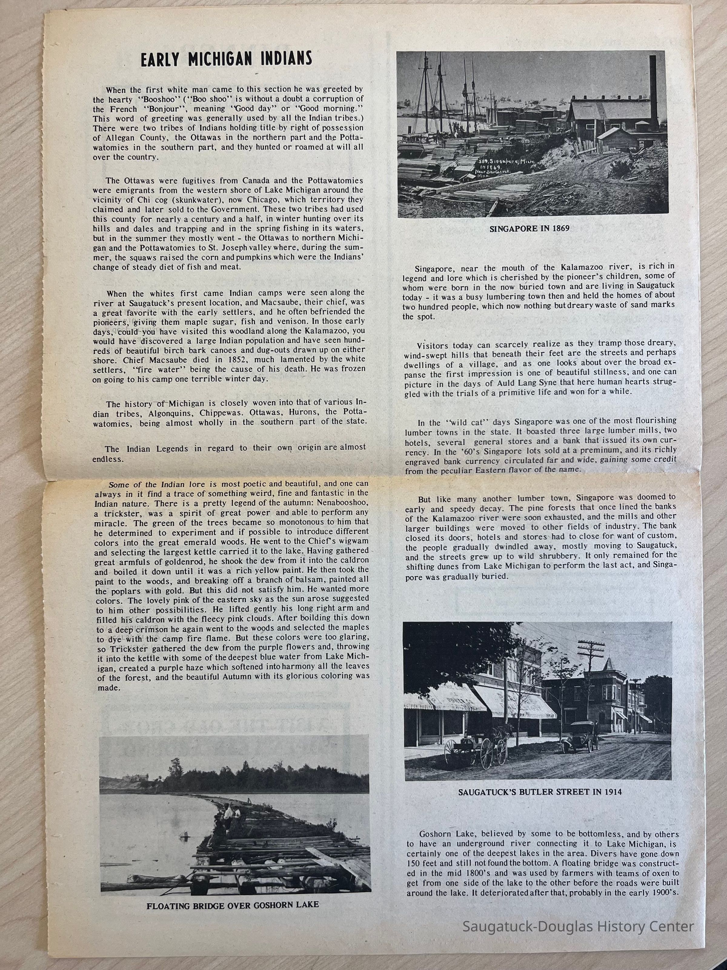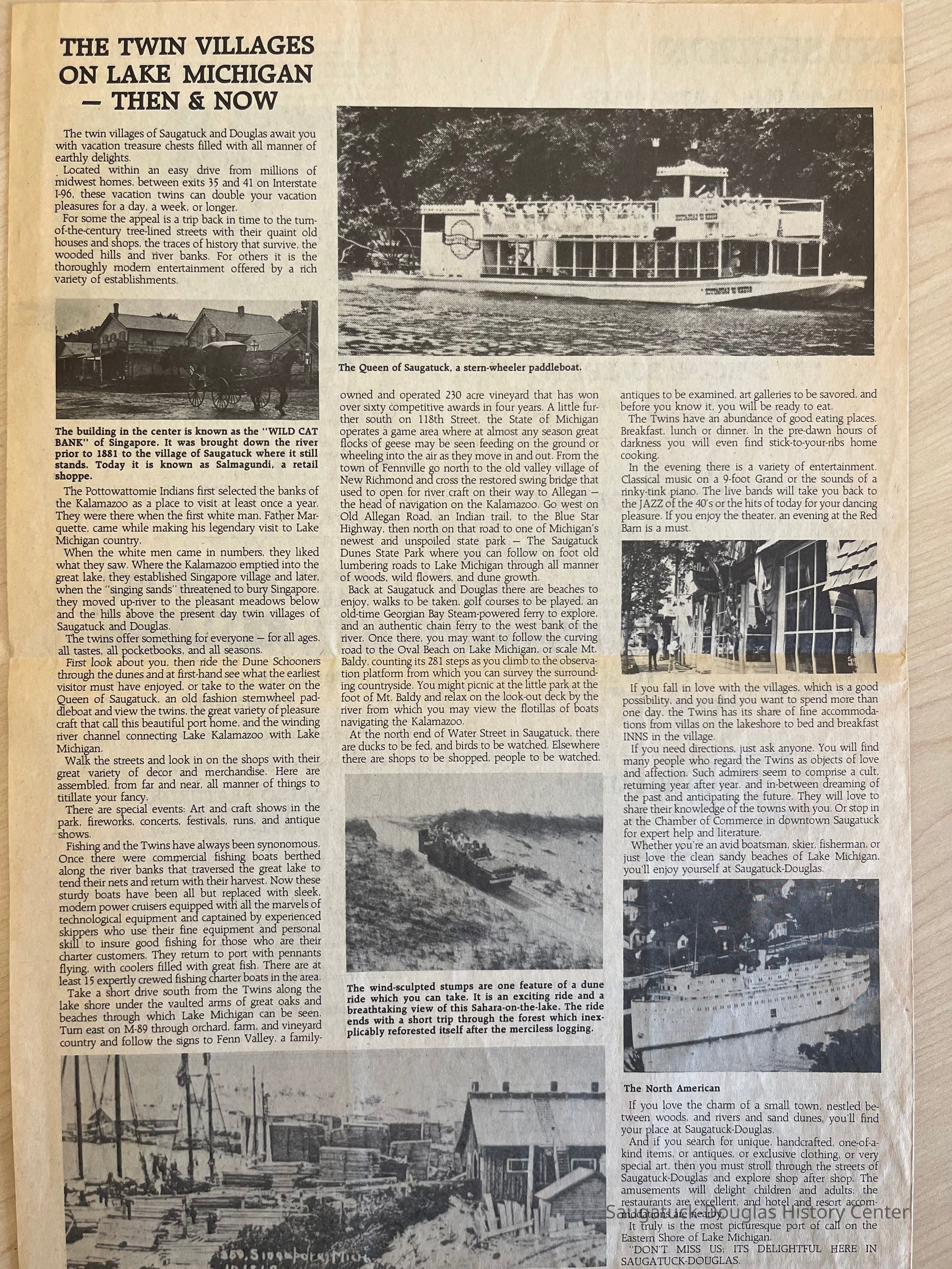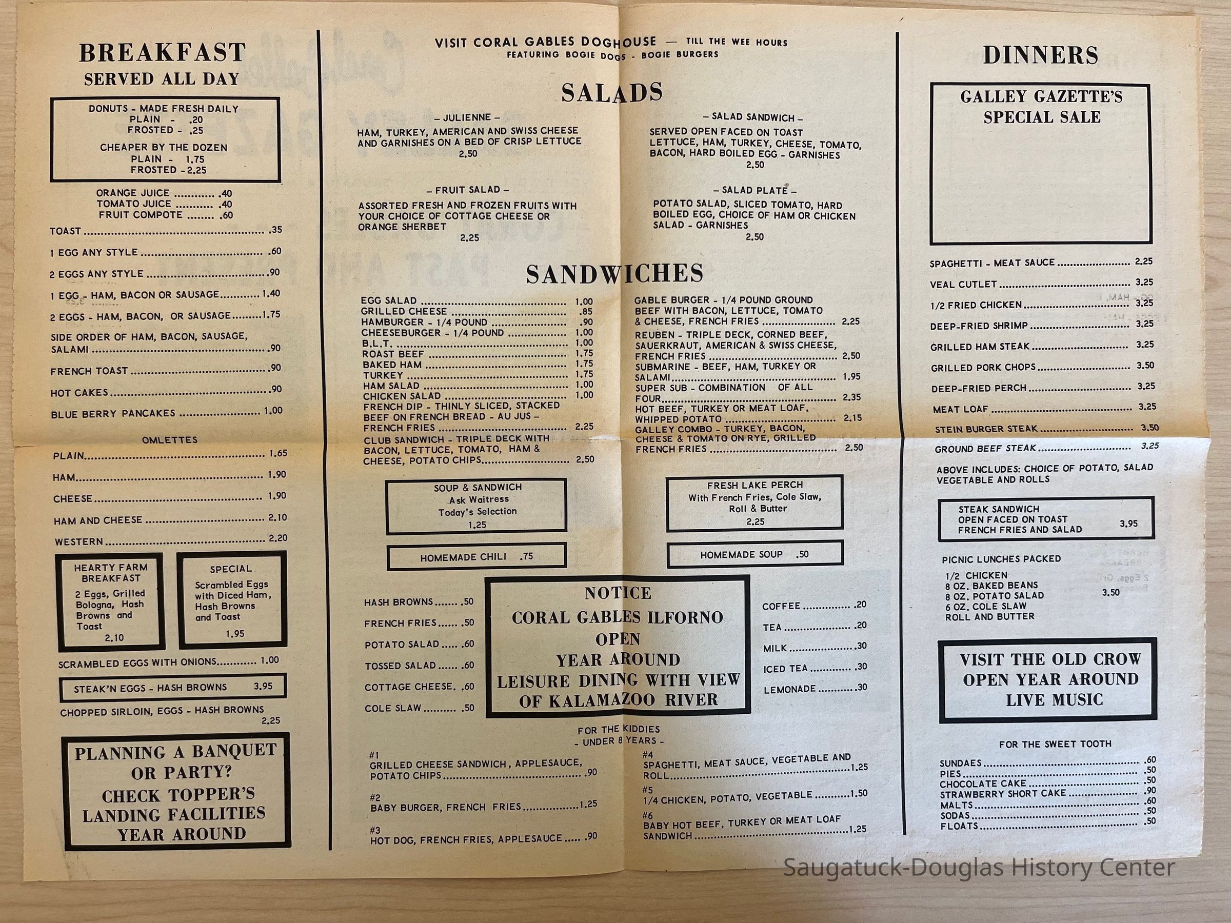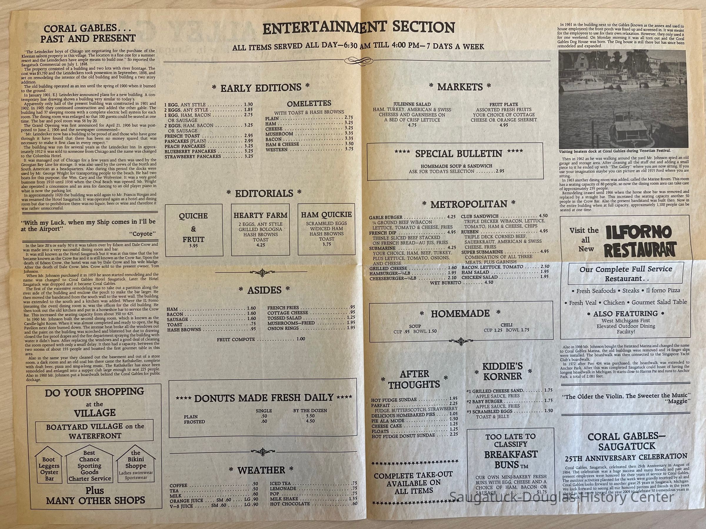 Two copies of the Coral Gables GALLEY GAZETTE newsletter. Neither has a date but one has “1986” handwritten on the first page. Both newsletter have the same format - page 1 contains a Coral Gables history, pages 2-3 is a menu and page 4 has more history of the Saugatuck Douglas area.