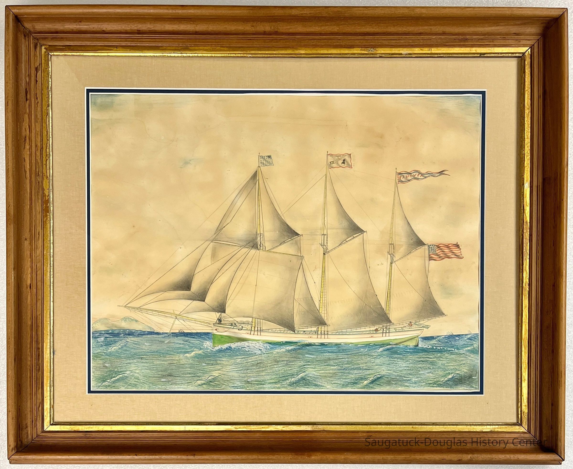 A. Colored pencil rendering of the E.J. McVea, a three-masted schooner, alone on orderly waves. According to the donor, the drawing was done by Joe Norris of Kingston Ontario in the late 19th century.