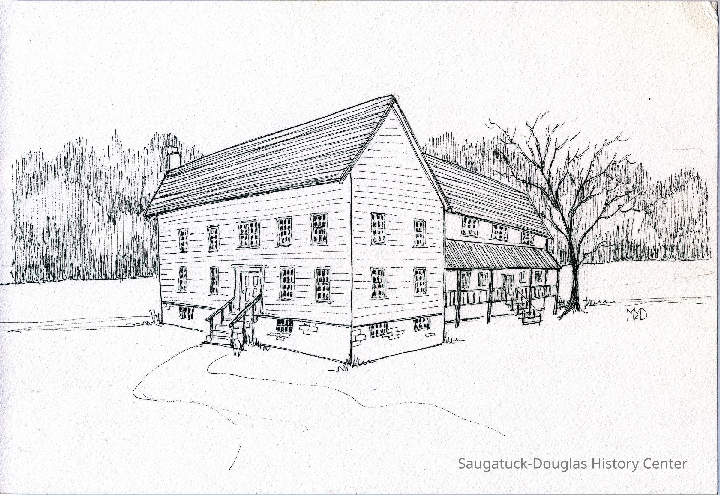 REMEMBERING ‘THE BIG HOUSE’ Some of our area's most interesting stories center around the 'lost village' of Singapore at the mouth of the Kalamazoo River. Founded in 1836, Singapore was platted out with streets with names like "Cherry" and "Detroit," and it had a bank that issued its own money, and had, over time, three or four sawmills. In addition to the mills, much of the history of Singapore centers on two buildings — one was its well-known "wild-cat" bank (now on Saugatuck's Butler Street), and the other a large boarding house called 'The Big House' which was built in 1837 or 1838 as housing for mill workers and their families. At the time some called it the "Astor House" — a bit of a local joke that played on the New York city luxury hotel by that name. Nevertheless, some later historian took this seriously and wrote of the house as one of the finest hotels in the state — describing it as having a grand ball room where the guests enjoyed 'high old times." In reality Singapore's boarding house was nothing more than a big (75 by 40 feet) two and a half story house of rough lumber. It was 'gray and unpainted' but it would most likely have had a bit of Greek Revival charm to it, if it was at all like the big boarding houses of nearby Saugatuck and Douglas at the time. It appears that the house had a good supply of whiskey, but also someone ready to make the newcomer a cup of tea — and a 'nice brick fireplace' in many of the rooms. With the help of local artist Margaret McDermott, I have constructed the 'Big House' (or Aster House) the best I can by following the narrative given by Laura Hudson Hutchins who lived there in 1848, and by following what we know of early building design in the are at that time. The Big House faced south to the Kalamazoo River and was very near the upper mill. It had a long two story wing that held a large dining room, kitchen, and sleeping rooms. It had a bar room, parlour, and large side porch. Most of the sleeping rooms were large enough for a family of 4 to 5 persons. The lower floor was fully used basement with sleeping rooms as well — making for a total of at least a dozen sleeping rooms. Up to fifty people in one house? Indeed. Mrs. Hutchins described it as a 'human beehive.' Some of the old settlers wrote about how the house functioned as an immigrant village of sorts: Catholics and Protestants; blacksmiths as well as Hollander men who could knit their own hosiery. Frenchmen from Canada, Irish, Dutch, Norwegians, a German family from Maine, and so on, all in the same house and most tied to the fortunes of the nearby mill and wild-cat bank. A good number of immigrants on their way to nearby Holland first came ashore and lived for a while in this house. Today Singapore is well known in Saugatuck for the fact that some of its single family houses were moved to Saugatuck. The fact appears to be that in the years just prior to and after the Civil War (1861-1865), life at Singapore centered on this sort of cooperative or collective housing, not single family housing. In short, most of the 'family living' which we associate with the modern 'family home' was somewhat of a rarity — and certainly unattainable by most early settlers. The Astor House it was not, but it had plenty of fireplaces, plenty of talking, and its dining room was large enough for a Saturday night dance.