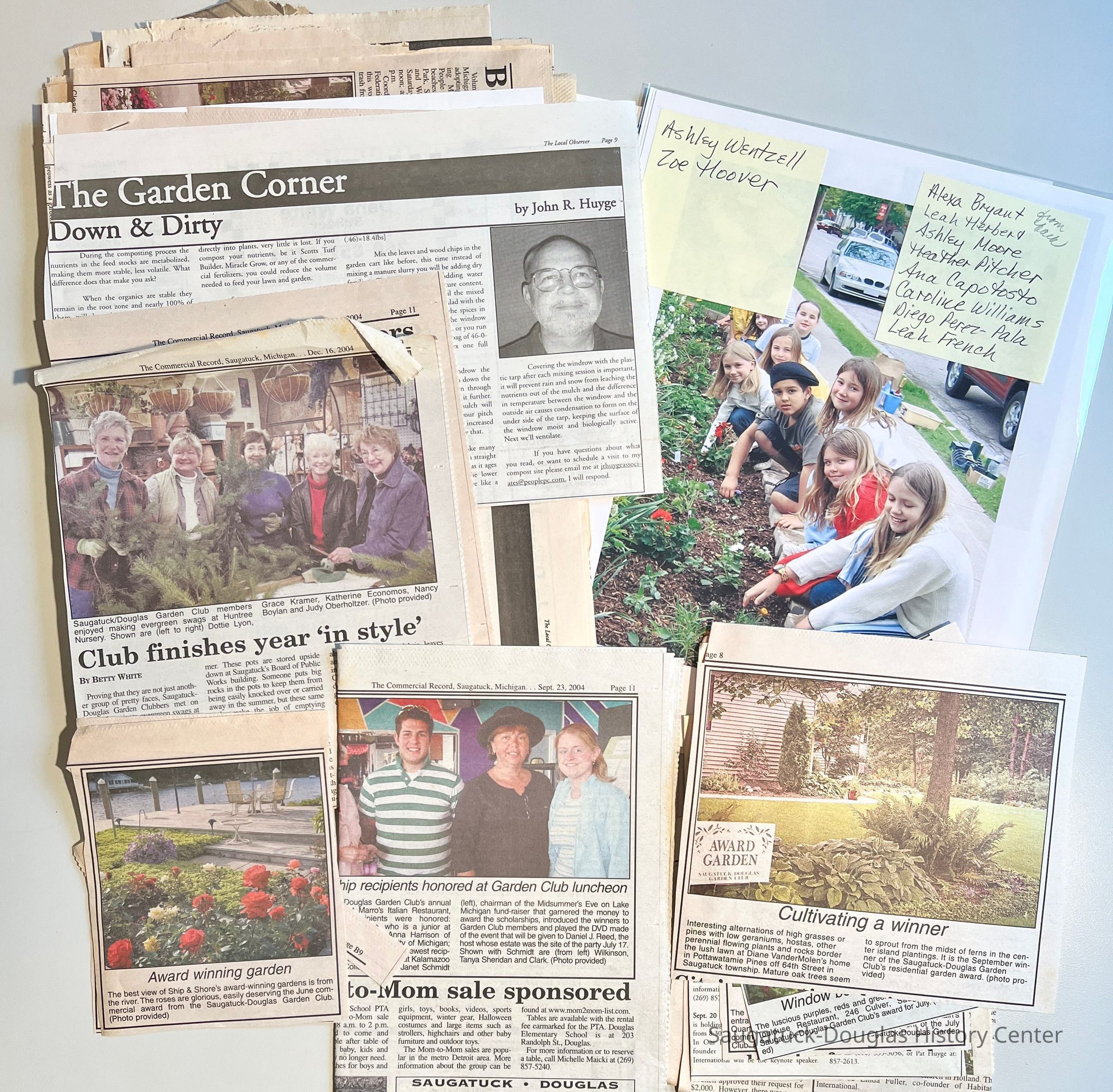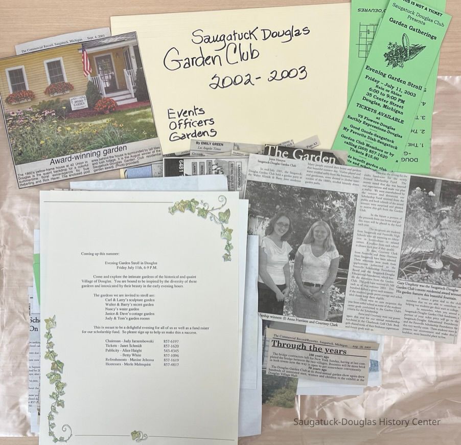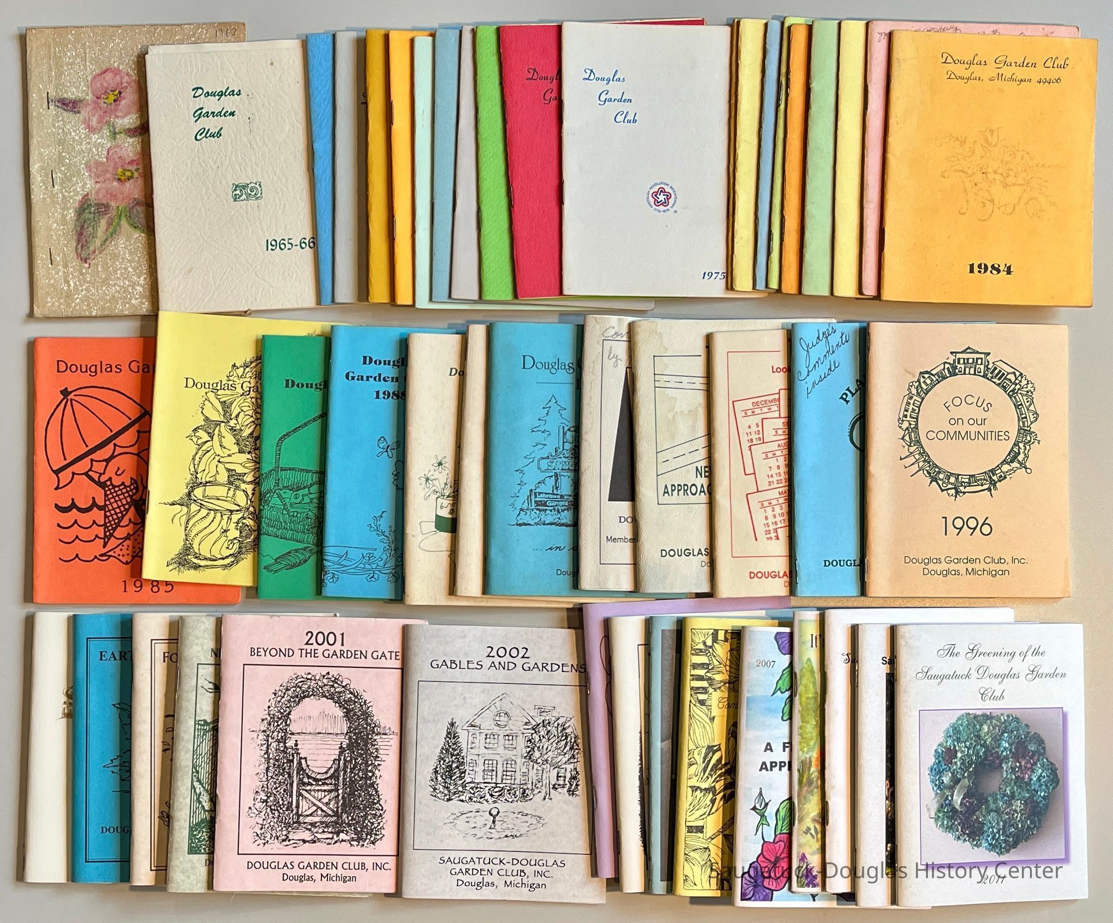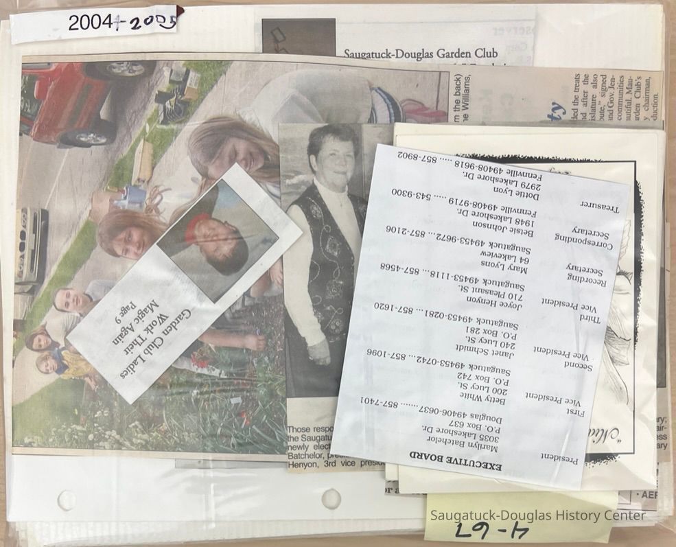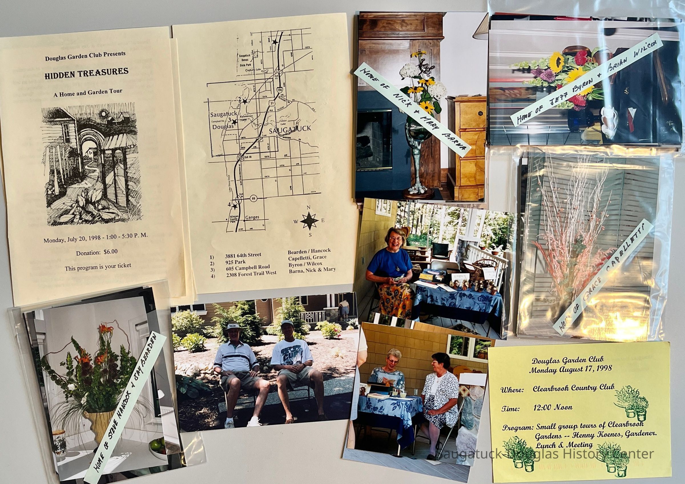 This influential community organization was founded as the Columbine Garden Club in 1928, renamed the Douglas Garden Club when federated in 1947, and renamed again in 2001 to today's [2024] Saugatuck-Douglas Garden Club. Initially the club brought together women, and their spouses, to beautify the community. Over time, additional public service goals were added to the club's bylaws. Club members have planted flowers and hung holiday decorations in public places, presented horticultural classes and flower shows, organized community pride day and garden awards, raised funds for for high-school scholarships and junior gardener projects with garden walks, homes tours and plant sales. This collection contains photos of club members, and the residences and public spaces they improved. Due to the club's long history, the photos show changes in style of dress, design, decorating and architecture. The social networks and organizational expertise built up by service-minded club members energized many other community organizations. A member of National Garden Clubs, Inc. the club has a standardized governance structure.