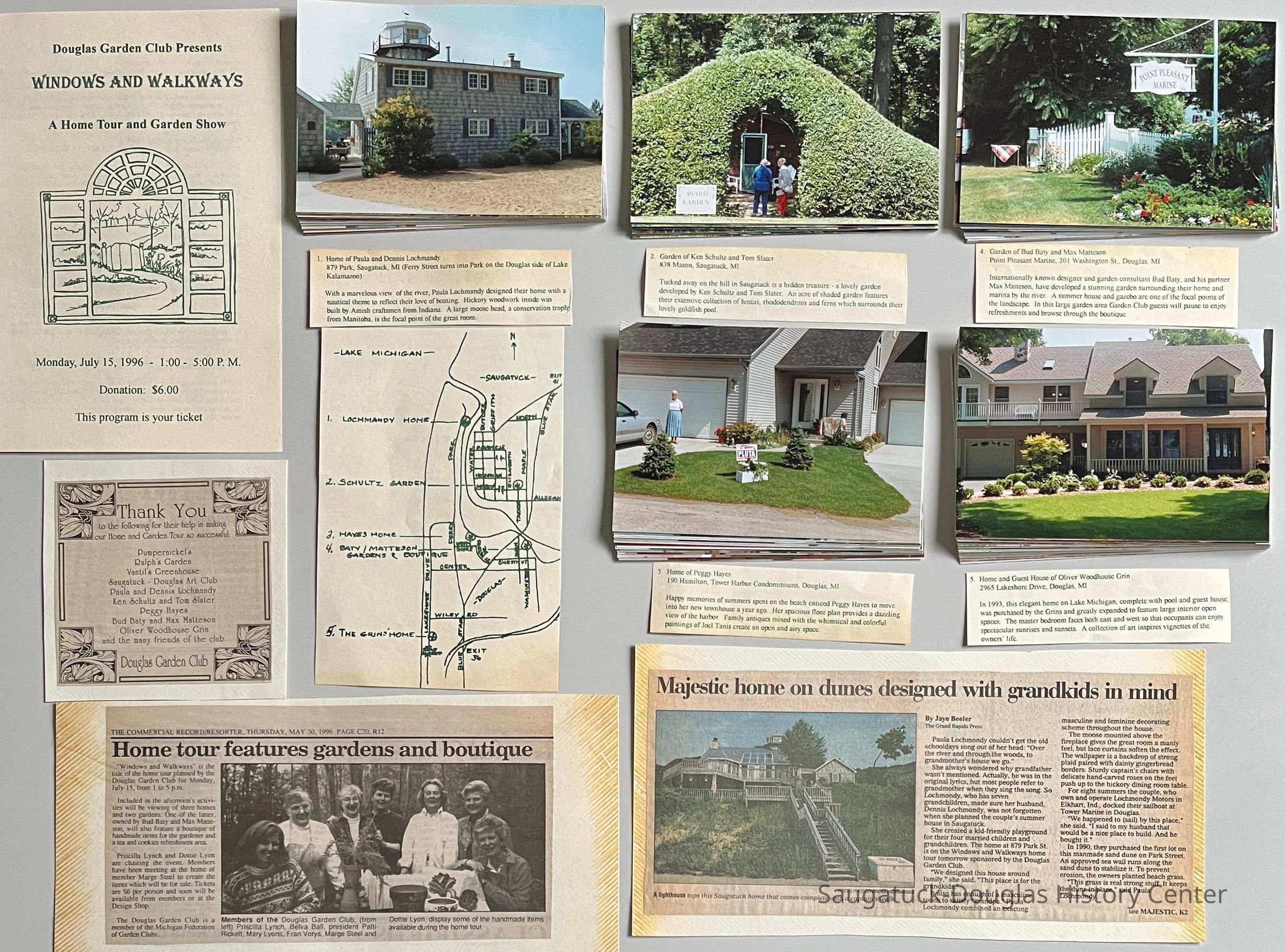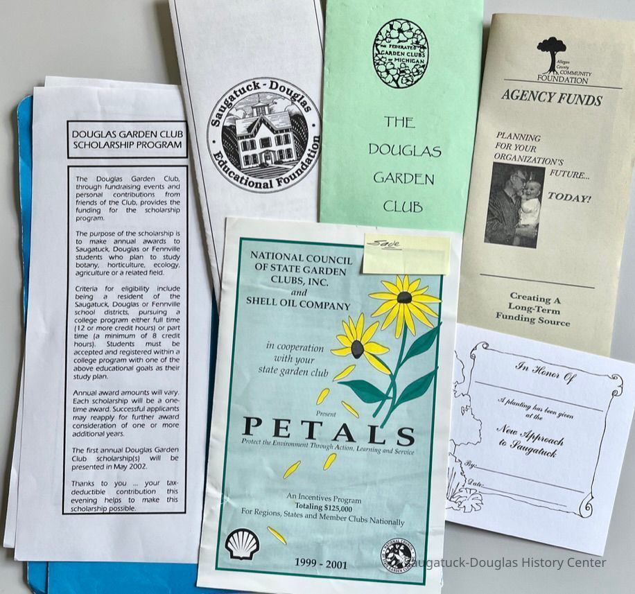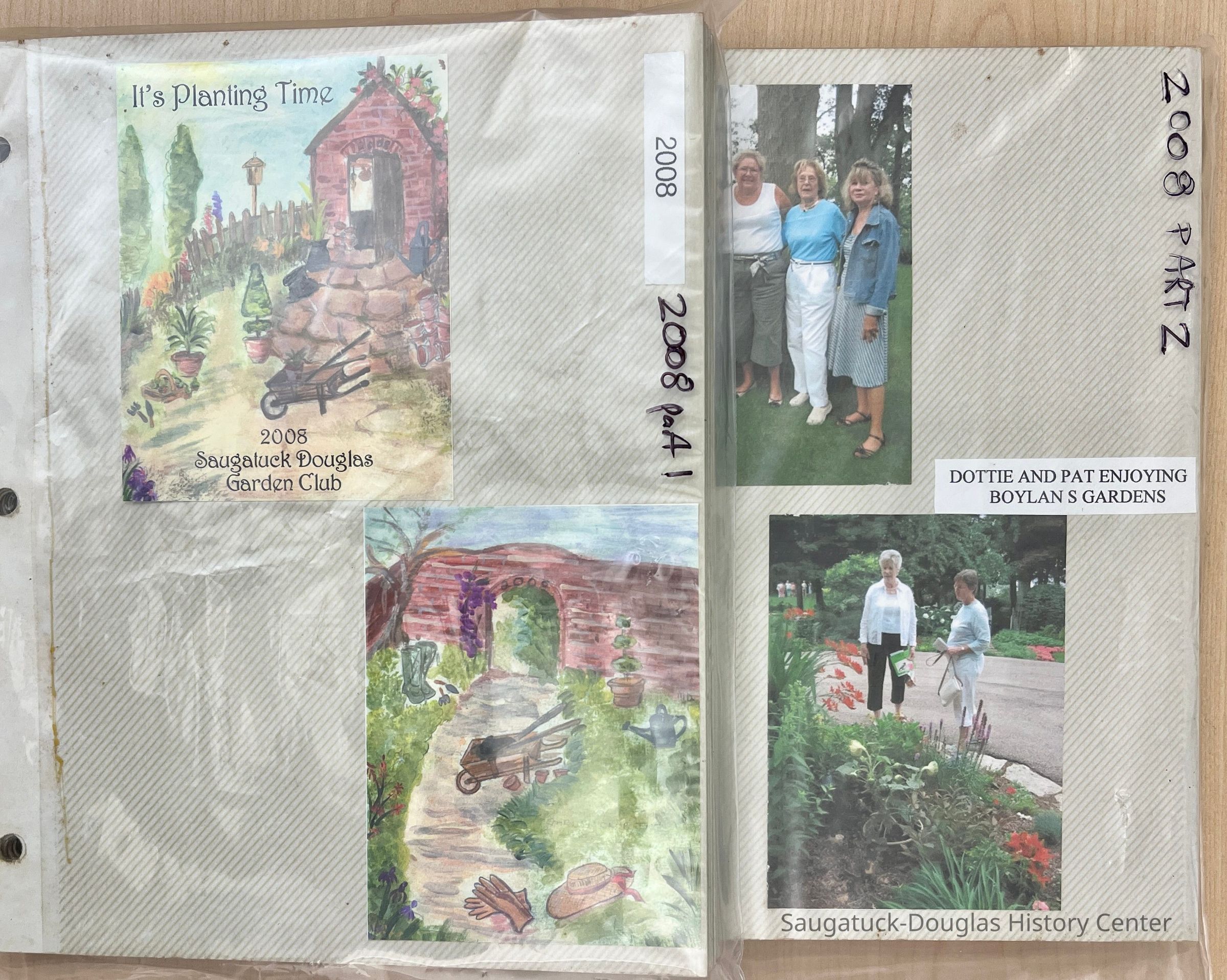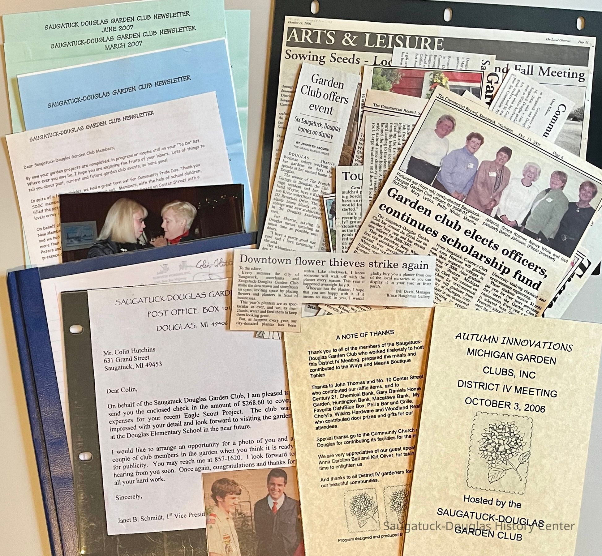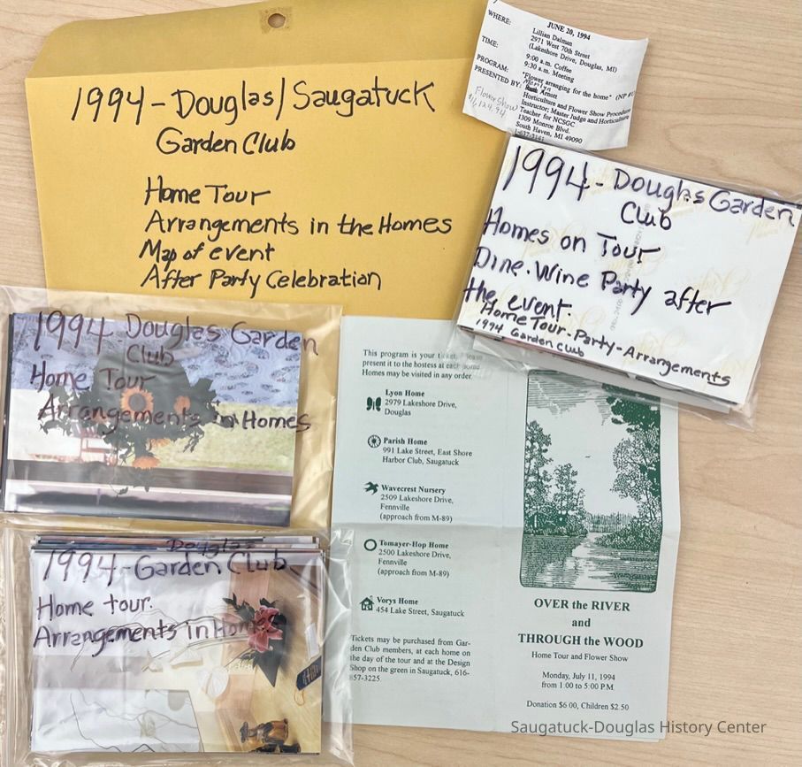 This influential community organization was founded as the Columbine Garden Club in 1928, renamed the Douglas Garden Club when federated in 1947, and renamed again in 2001 to today's [2024] Saugatuck-Douglas Garden Club. Initially the club brought together women, and their spouses, to beautify the community. Over time, additional public service goals were added to the club's bylaws. Club members have planted flowers and hung holiday decorations in public places, presented horticultural classes and flower shows, organized community pride day and garden awards, raised funds for for high-school scholarships and junior gardener projects with garden walks, homes tours and plant sales. This collection contains photos of club members, and the residences and public spaces they improved. Due to the club's long history, the photos show changes in style of dress, design, decorating and architecture. The social networks and organizational expertise built up by service-minded club members energized many other community organizations. A member of National Garden Clubs, Inc. the club has a standardized governance structure.