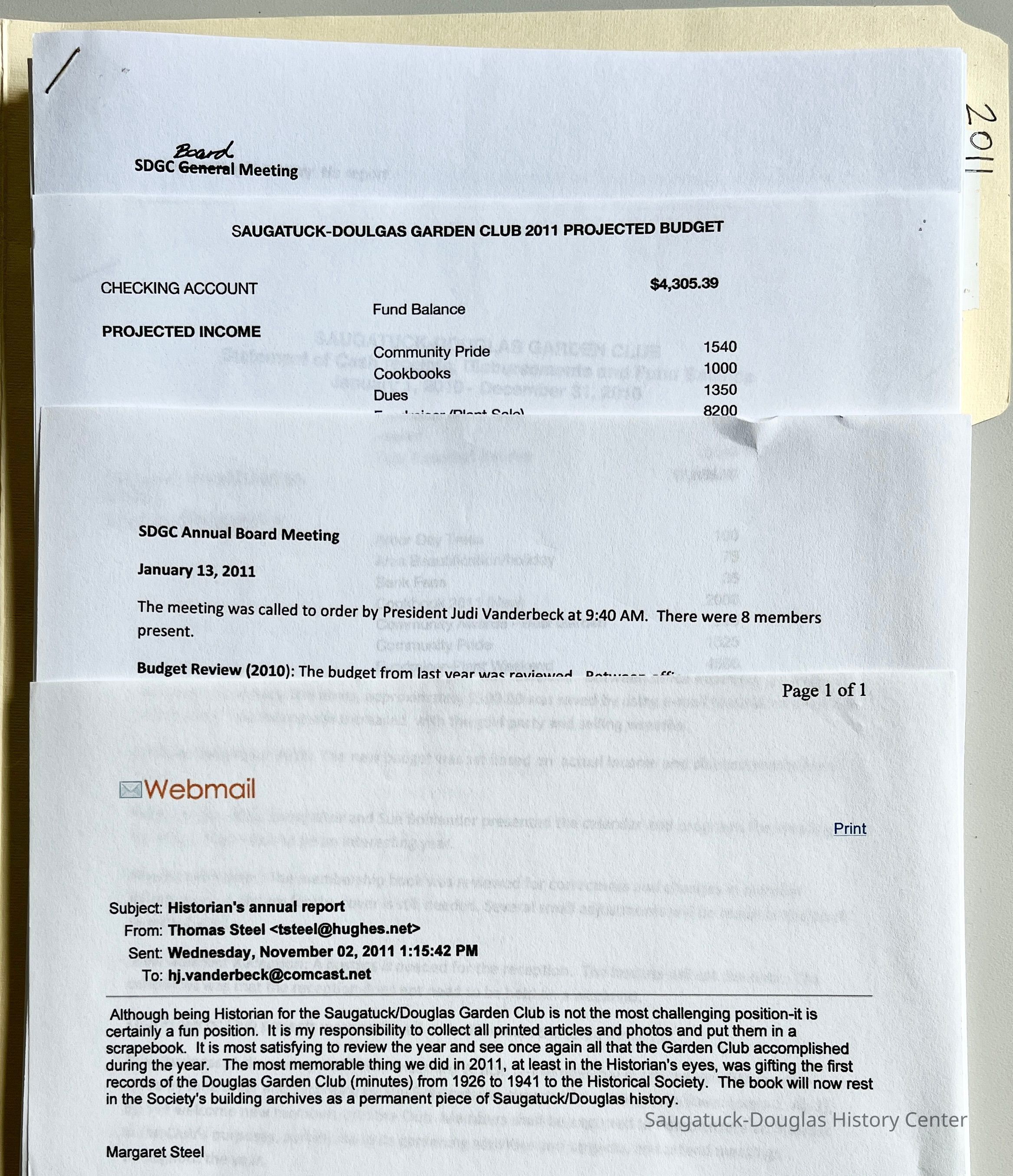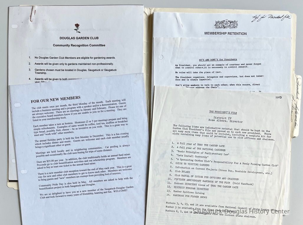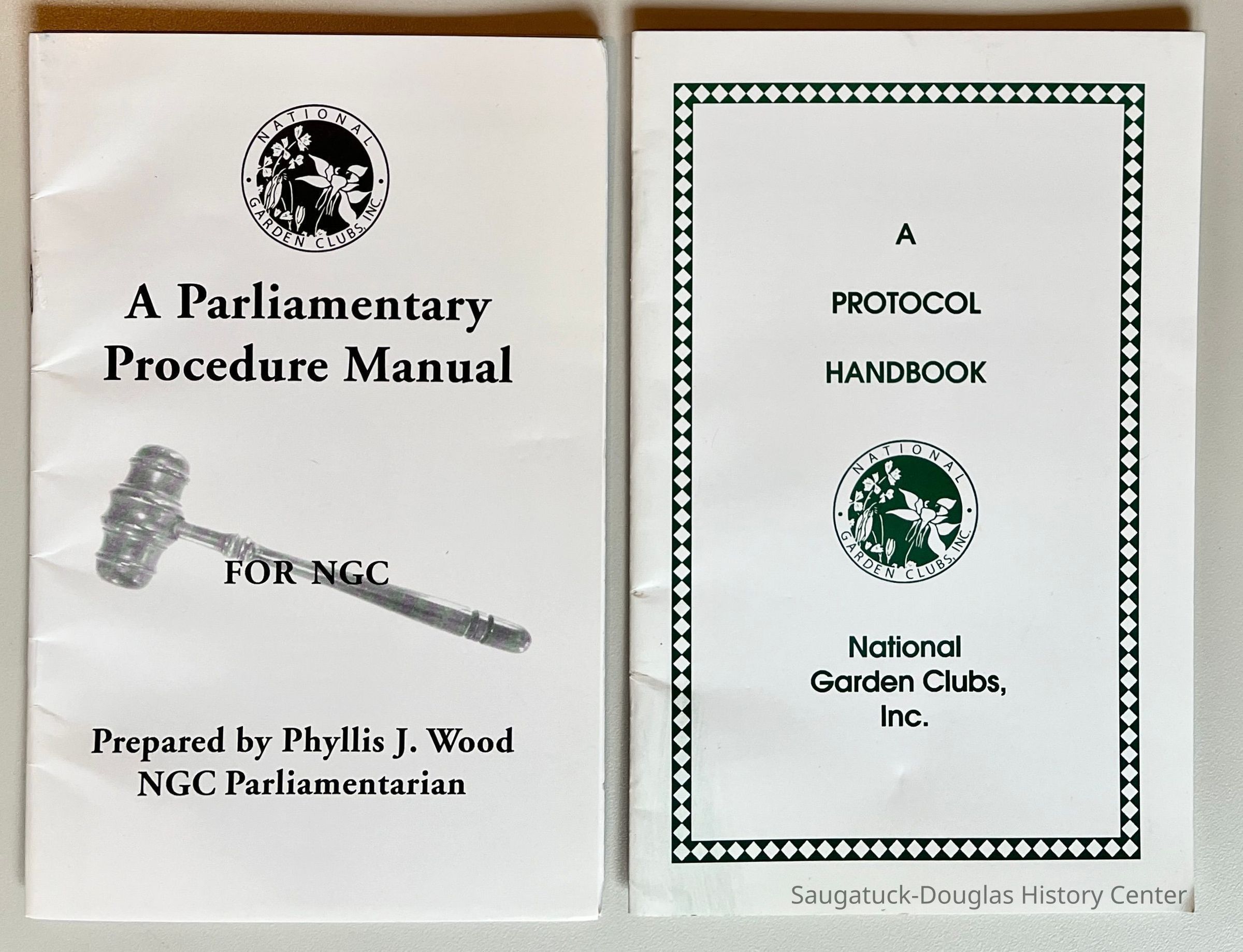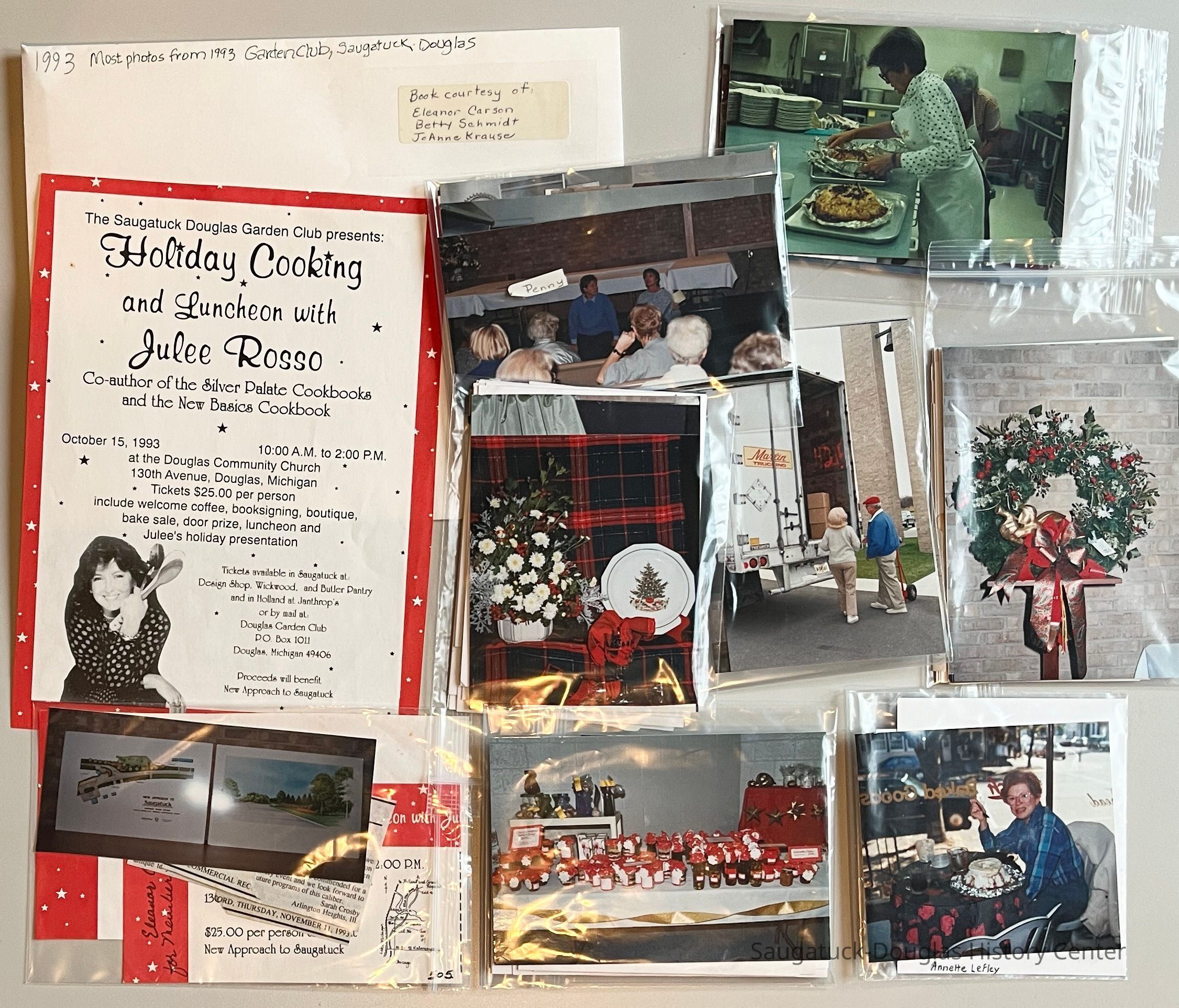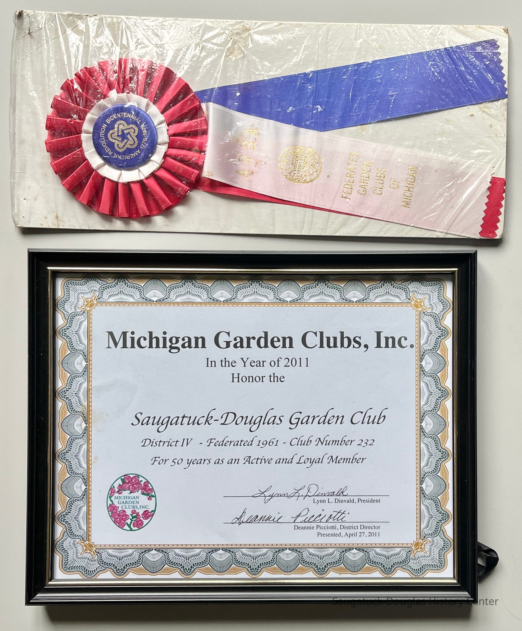 This influential community organization was founded as the Columbine Garden Club in 1928, renamed the Douglas Garden Club when federated in 1947, and renamed again in 2001 to today's [2024] Saugatuck-Douglas Garden Club. Initially the club brought together women, and their spouses, to beautify the community. Over time, additional public service goals were added to the club's bylaws. Club members have planted flowers and hung holiday decorations in public places, presented horticultural classes and flower shows, organized community pride day and garden awards, raised funds for for high-school scholarships and junior gardener projects with garden walks, homes tours and plant sales. This collection contains photos of club members, and the residences and public spaces they improved. Due to the club's long history, the photos show changes in style of dress, design, decorating and architecture. The social networks and organizational expertise built up by service-minded club members energized many other community organizations. A member of National Garden Clubs, Inc. the club has a standardized governance structure.
