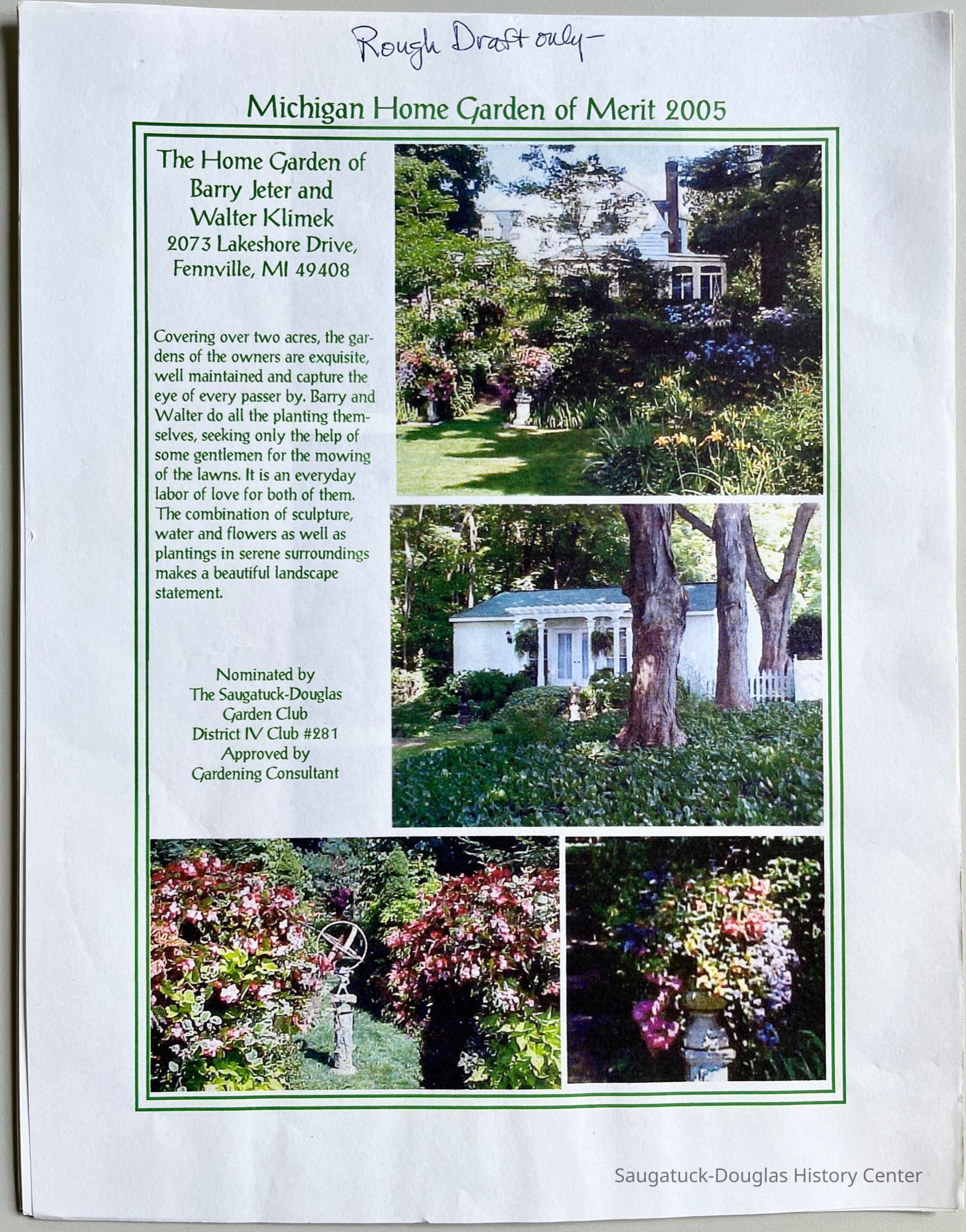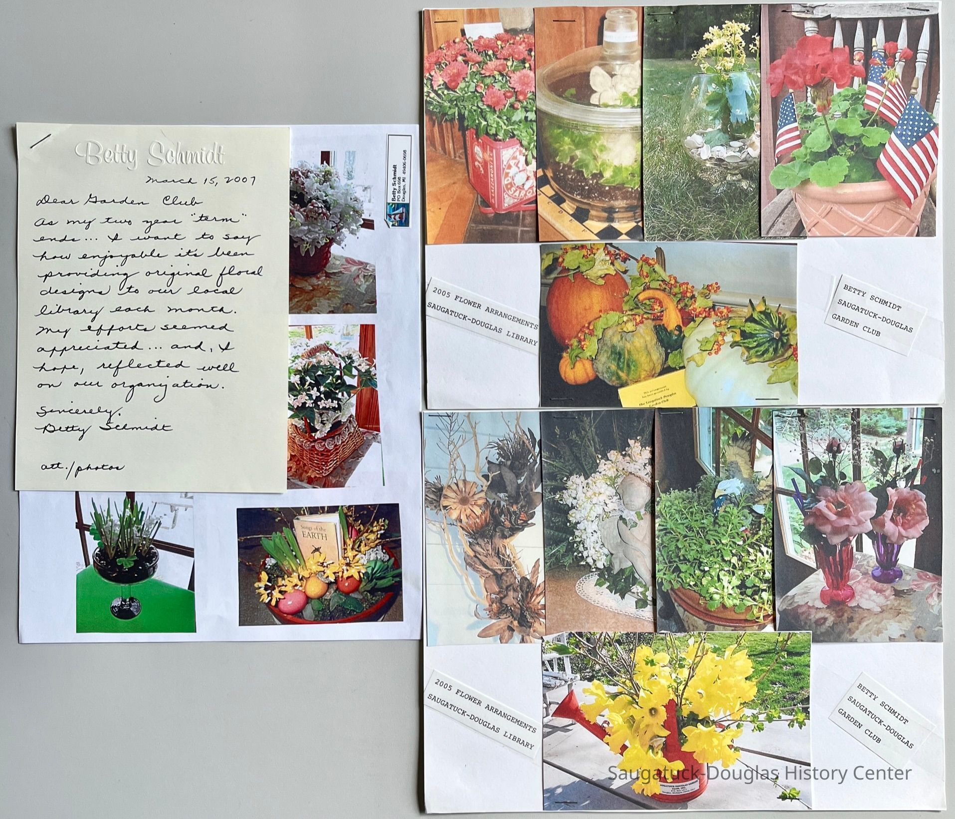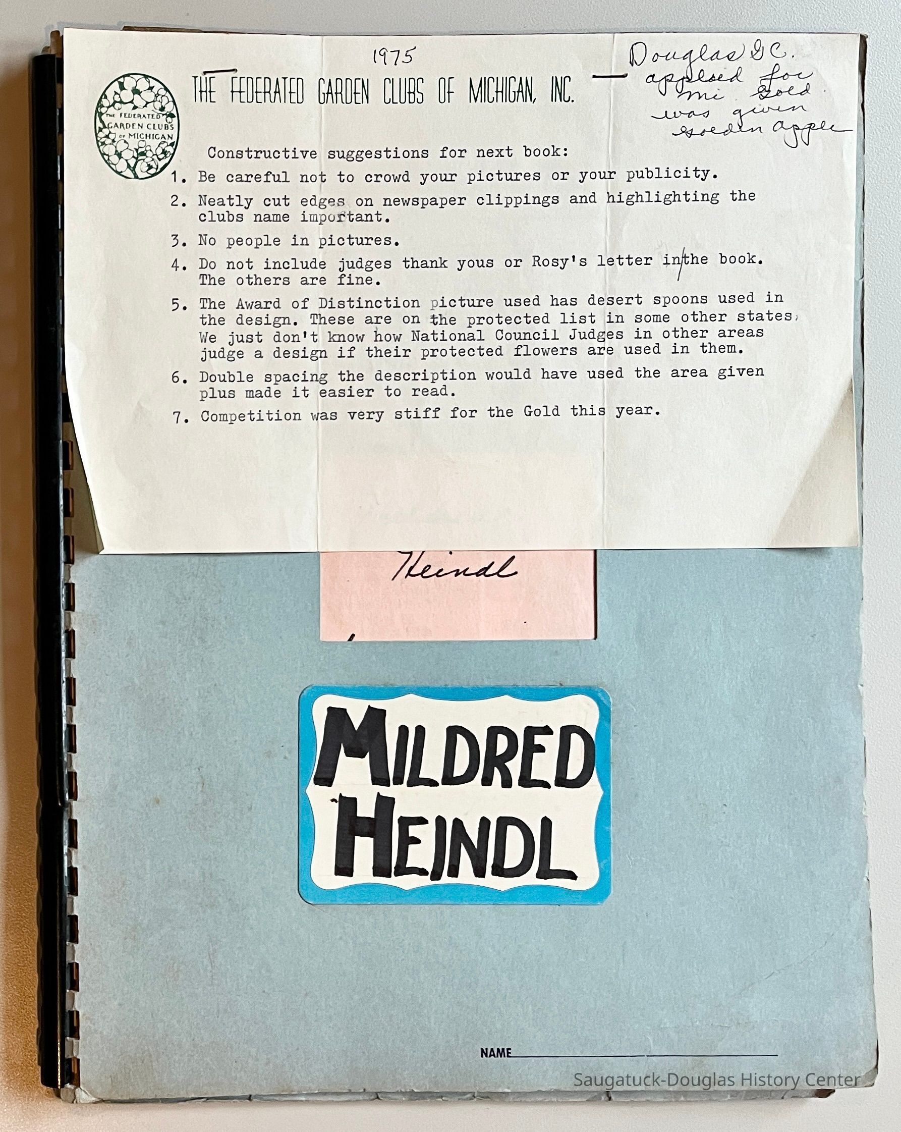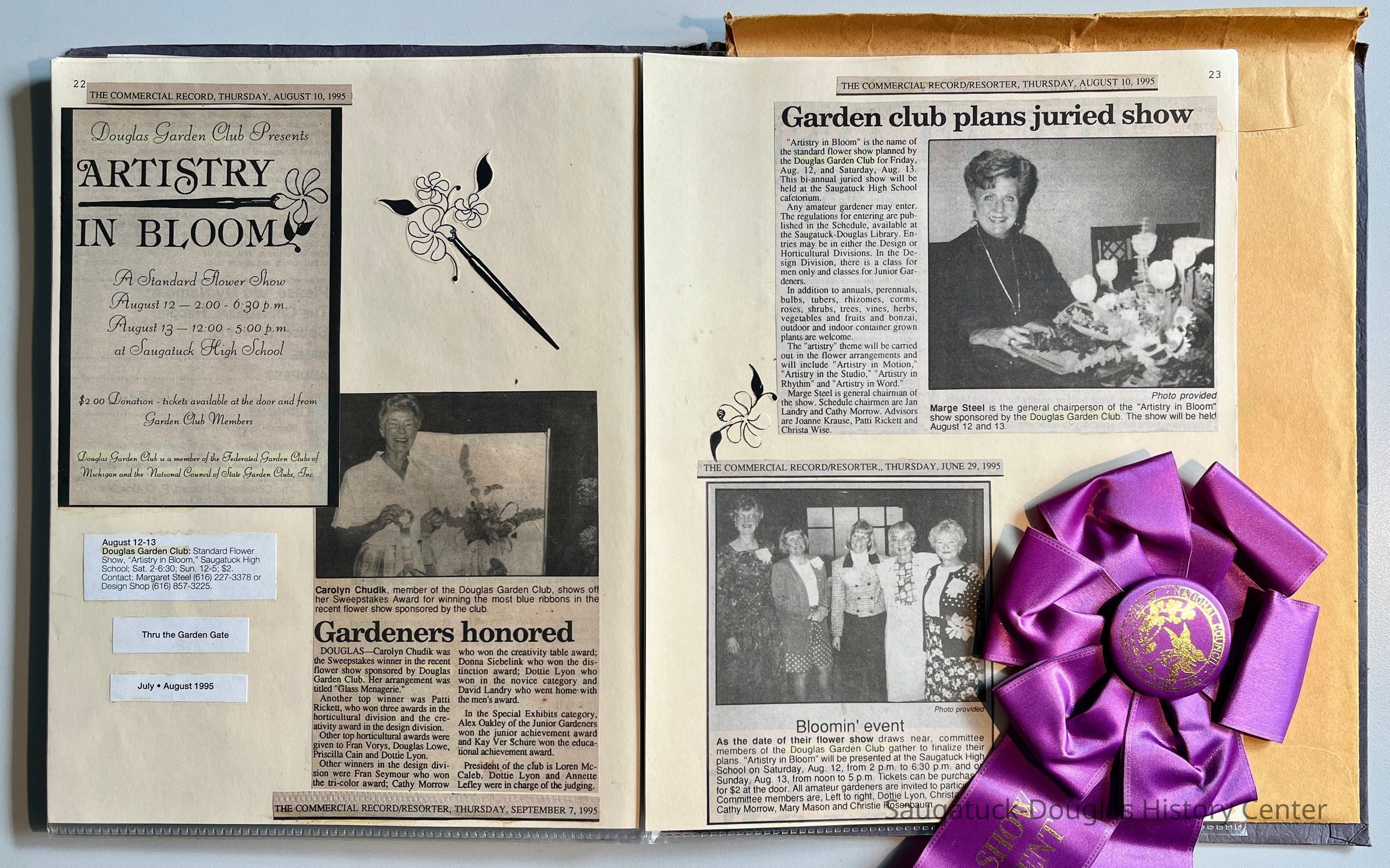 This influential community organization was founded as the Columbine Garden Club in 1928, renamed the Douglas Garden Club when federated in 1947, and renamed again in 2001 to today's [2024] Saugatuck-Douglas Garden Club. Initially the club brought together women, and their spouses, to beautify the community. Over time, additional public service goals were added to the club's bylaws. Club members have planted flowers and hung holiday decorations in public places, presented horticultural classes and flower shows, organized community pride day and garden awards, raised funds for for high-school scholarships and junior gardener projects with garden walks, homes tours and plant sales. This collection contains photos of club members, and the residences and public spaces they improved. Due to the club's long history, the photos show changes in style of dress, design, decorating and architecture. The social networks and organizational expertise built up by service-minded club members energized many other community organizations. A member of National Garden Clubs, Inc. the club has a standardized governance structure.