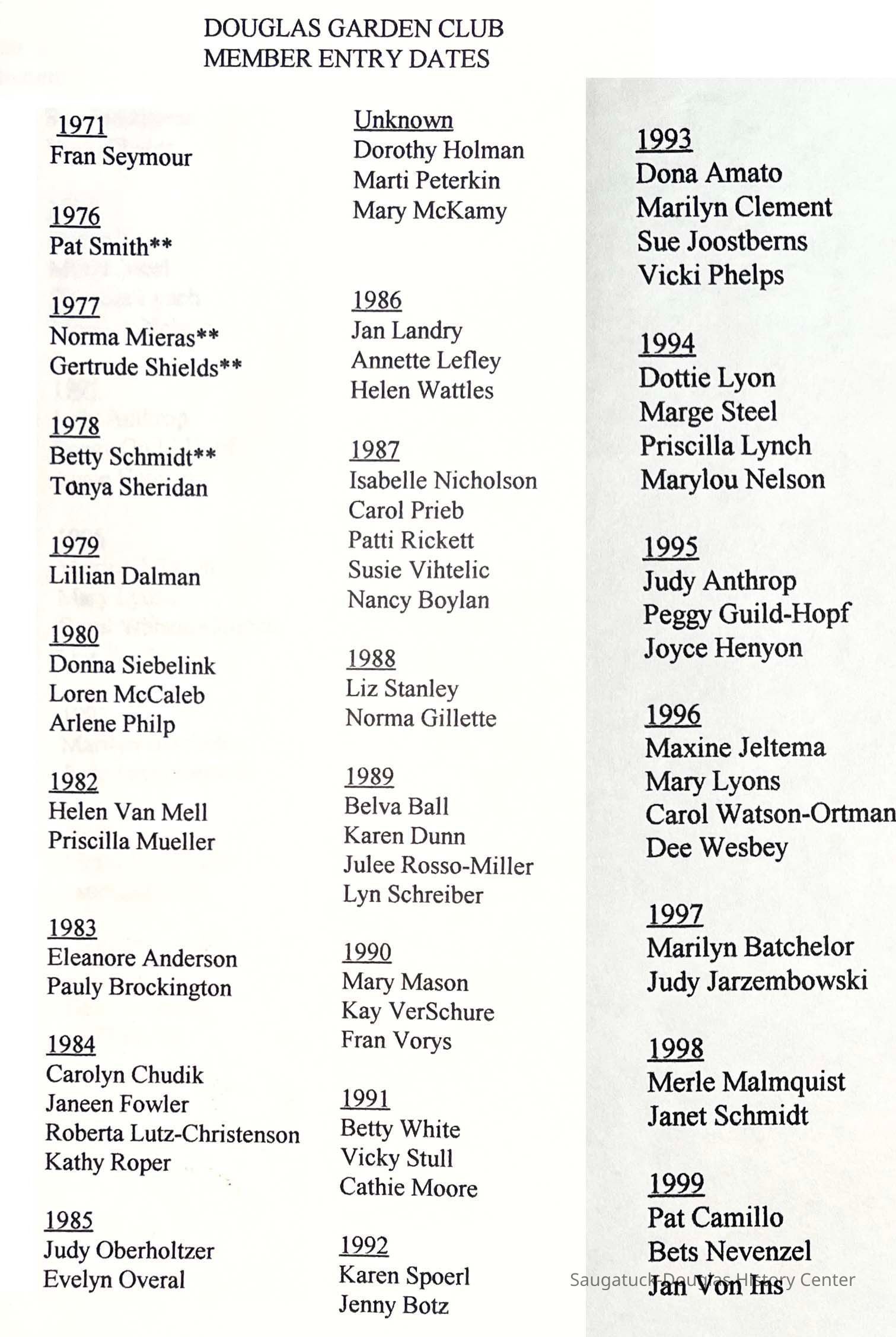 Ver Schure, KayVan Mell, Helen S. -2002Lynch, PriscillaVorys, FranBrockington, PaulySiebelink, DonnaAmato, DonaJoostberns, Suzanne Morse 1939-2014Douglas Garden ClubSaugatuck-Douglas Garden ClubWesbey, DeePhelps, Vicki (White)Anderson, EleanoreDunn, KarenNelson, MarylouMieras, Norma Arlene (Sjaarda) 1927-2015Botz, Jenny 1951-Roper, KathleenHenyon, JoyceWhite, BettyRickett, PattiVan Campen, RhodaBatchelor, MarilynBall, Belva (Lou Ross) 1931-2009Lyon, Dottie ?-2019Mason, MaryNicholson, IsabelleLefley, AnnetteAnthrop, Judy (Bowman)Prieb, CarolChudik, CarolynLandry, JanMoore, CathieOberholtzer, Judith "Judy" 1933-2020Steel, MargeVihtelic, SuzieHunt, BarbaraMcCaleb, LorenCarson, EleanorSpoerl, Karen c1937-2025Stanley, ElizabethGillette, NormaOrt, VickiVanderbeck, JudiTews, KarenWellman, SherriHeindl, MildredSteinberg, Nat 1893-1976Schmidt, JanetKramer, GraceWhite, NancyJohnson, BetsieSmith, PatMieras, Norma Arlene (Sjaarda) 1927-2015Shields, GertrudeSchmidt, BettySheridan, TanyaDalman, Lillian c1913-2008Siebelink, DonnaMcCaleb, LorenVan Mell, Helen S. -2002Mueller, PricillaAnderson, EleanoreFowler, Janeen 1930-2025Lutz-Christenson, RobertaOberholtzer, Judith "Judy" 1933-2020Overal, EvelynHolman, DorothyPeterkin, MartiMcKamy, Mary Leah (Krause) 1912-2005Wattles, HelenNicholson, IsabelleBoylan, NancyDunn, KarenRosso-Miller, JuleeSchreiber, LynMason, MaryVer Schure, KayStull, VickyMoore, CathieSpoerl, Karen c1937-2025Botz, Jenny 1951-Joostberns, Suzanne Morse 1939-2014Phelps, Vicki (White)Lyon, Dottie ?-2019Guild-Hopf, PeggyWatson-Ortman, CarolJarzembowski, Judy 1942-2012Malmquist, MerleSchmidt, JanetCamillo, Patrica Ann (Rempel) 1952-Nevensel, BetsVon Ins, Jan