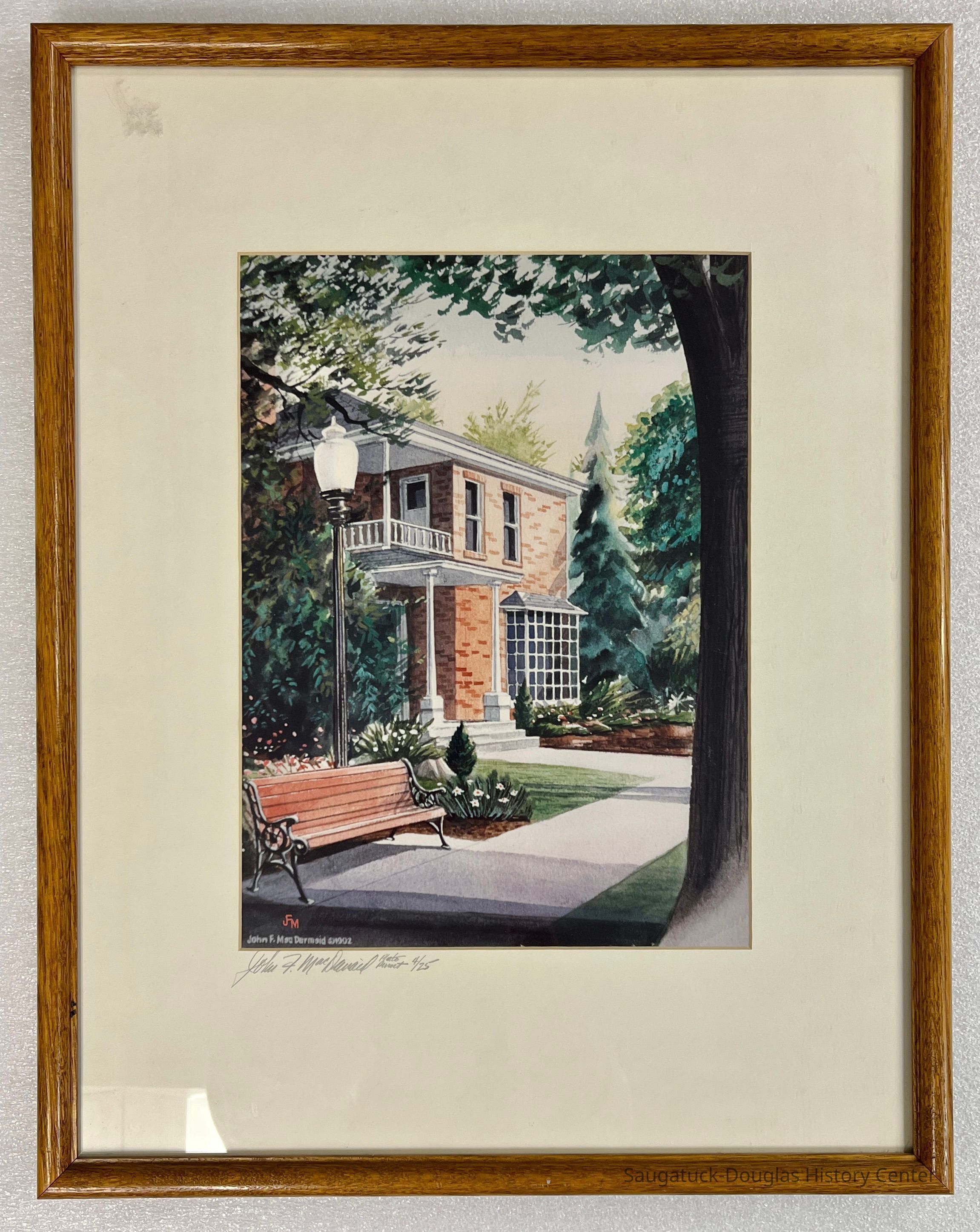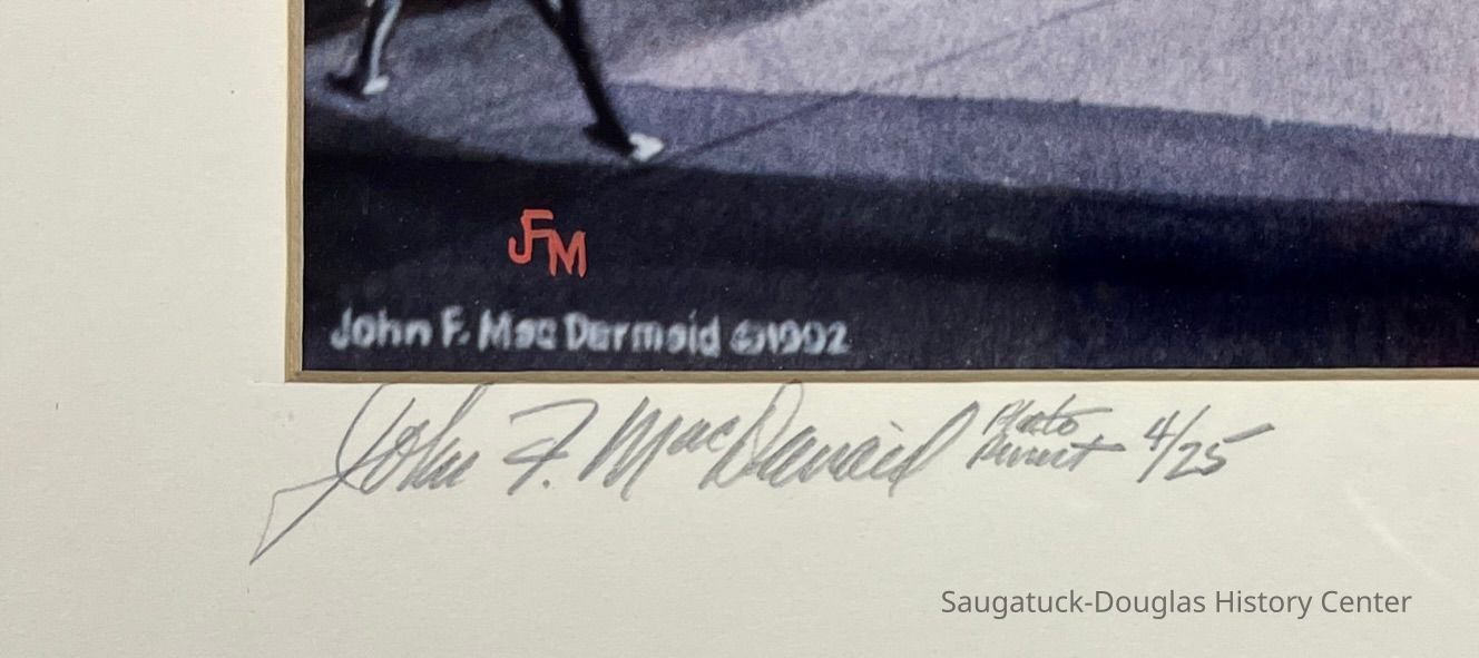 The print is behind glass with a 4" mat and .75" wood frame. The mat is signed John F. MacDermaid and numbered 4/25.