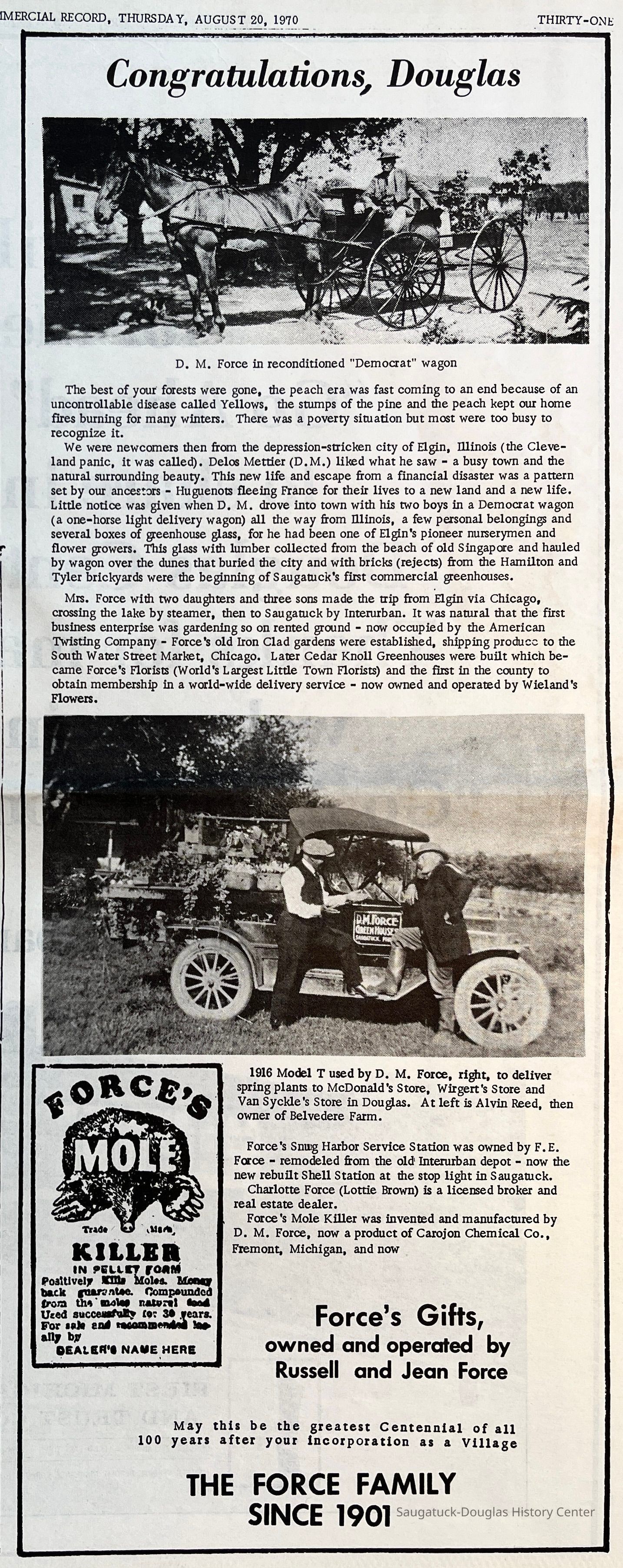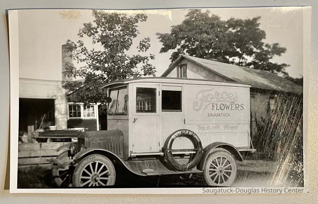 Delos M. Force has been called "Saugatuck's first florist." See 2023.10.118 for a photo and newspaper clipping about a January 3, 1949 fire, likely at this site.