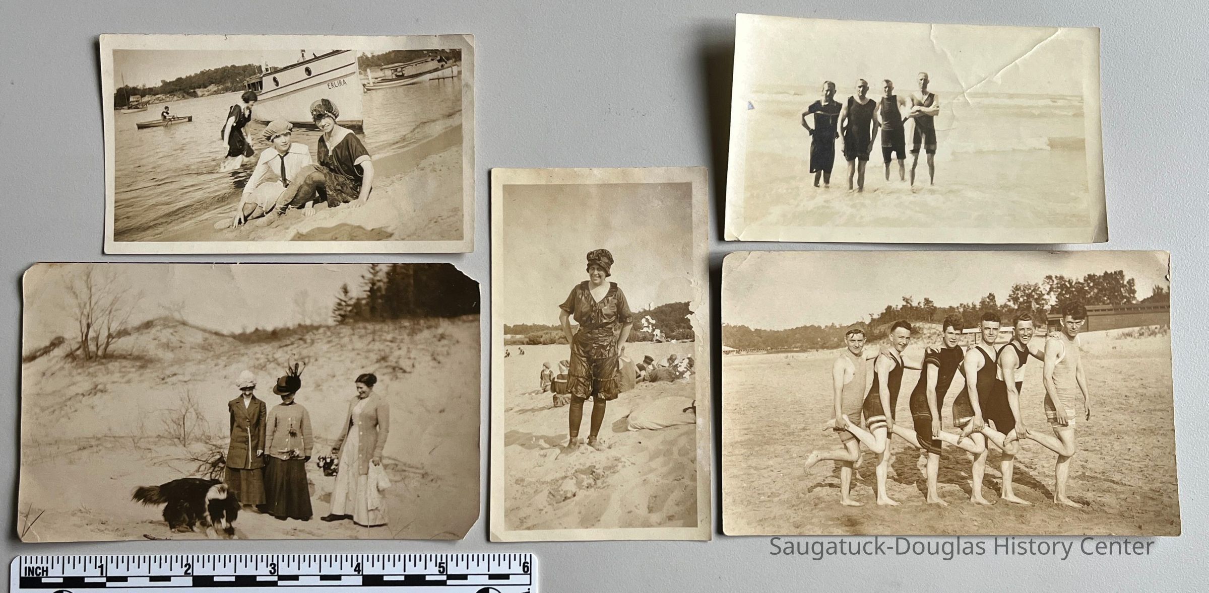 A. Two women siting in the shallows wearing full-coverage bathing suits and caps. Jessie Veits on right. The boat "Erlira" is beached behind the women with other boats and the opposite bank of the Kalamazoo River visible. The location may be the turning basin