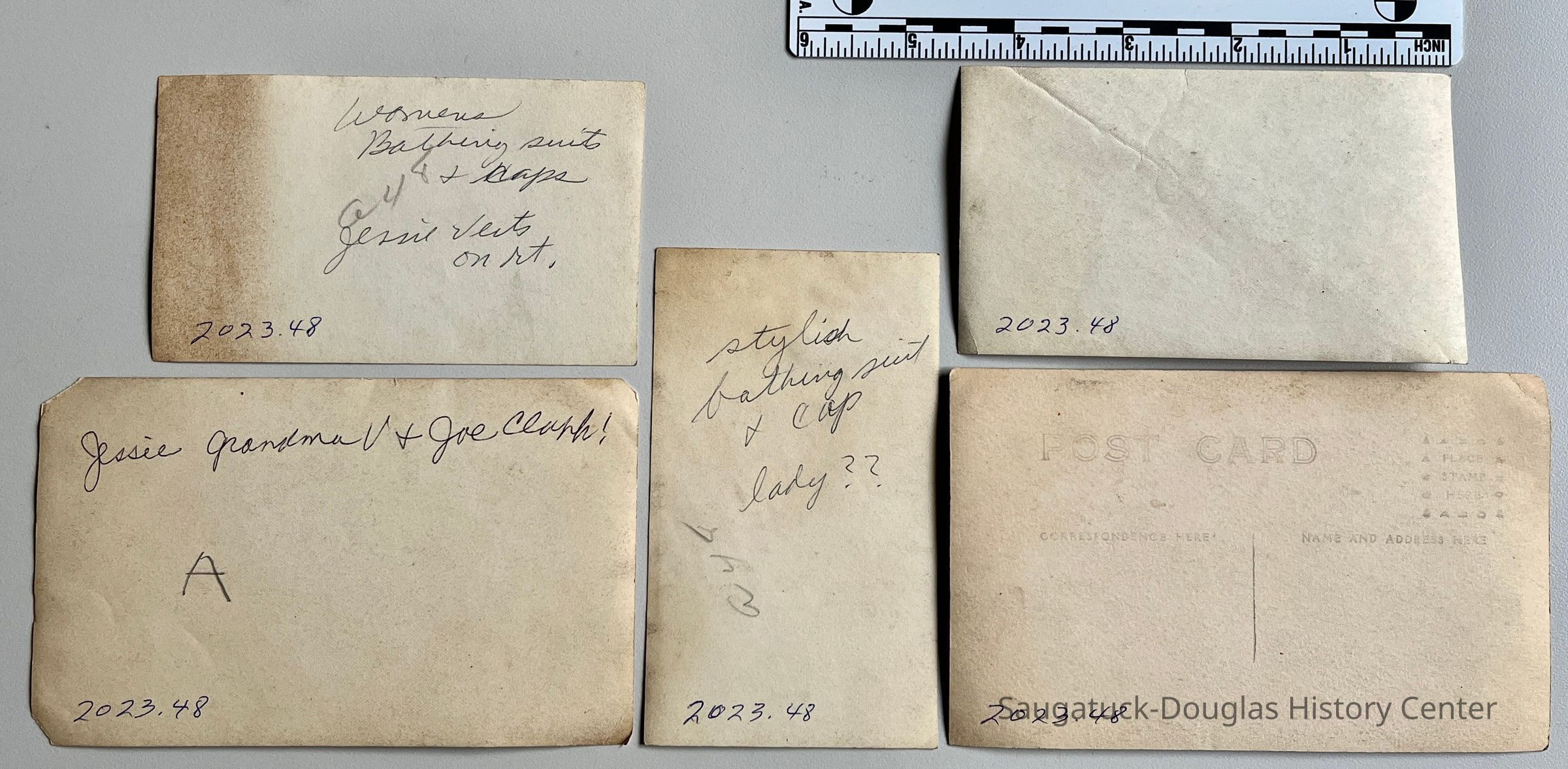 C. Three women in street clothes watching and a dog in fur digging in a dune. Note on back identifies the humans as Jessie Grandma V and Joe Clark