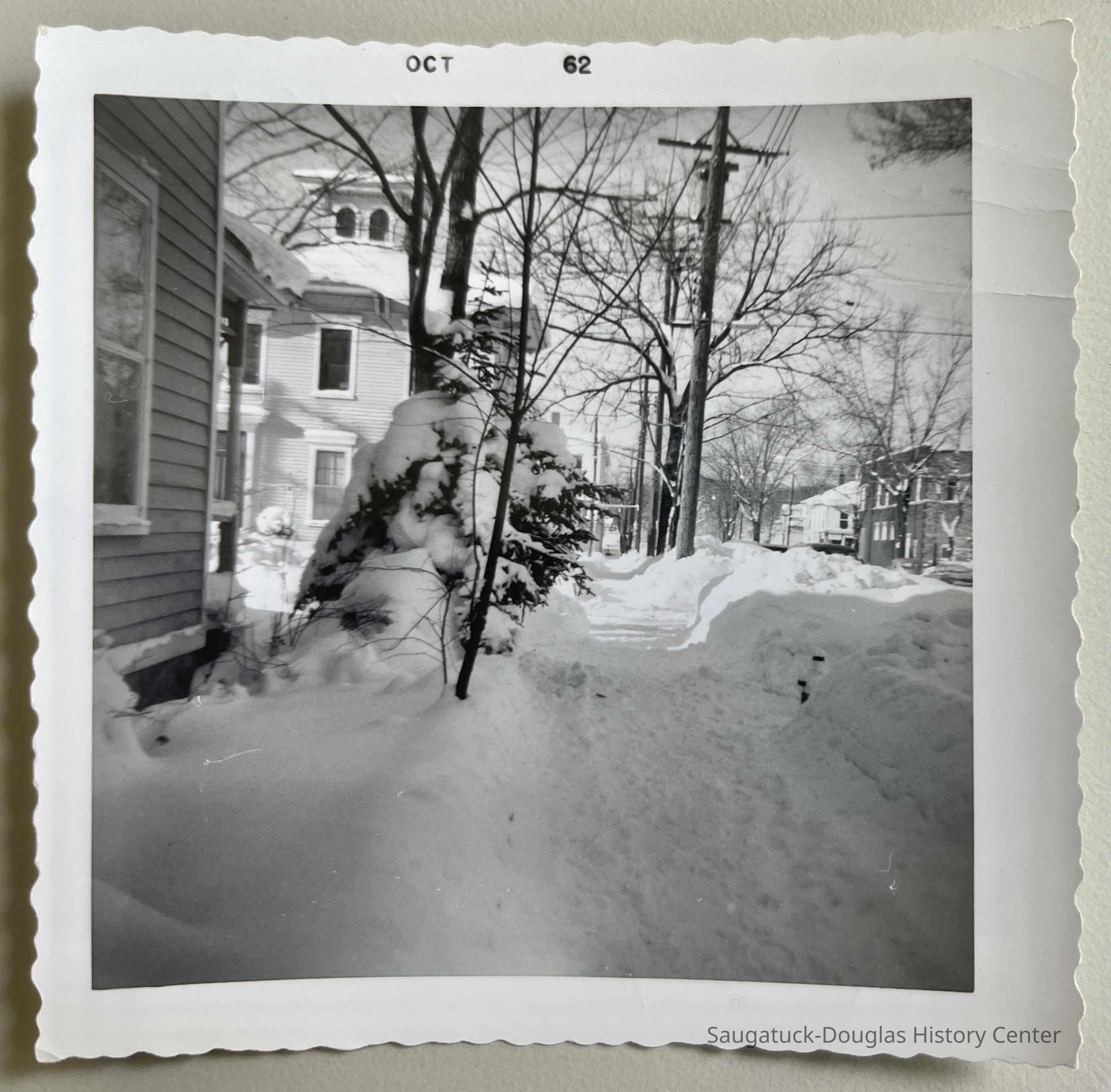 Photo of Mason Street looking west toward Butler Street. The Palzer/Finch house at 149 Griffith St. is on the near left, with the Brittain House further down the street. The Saugatuck Drug store is visible on the far right. Photo is timestamped Oct 62.