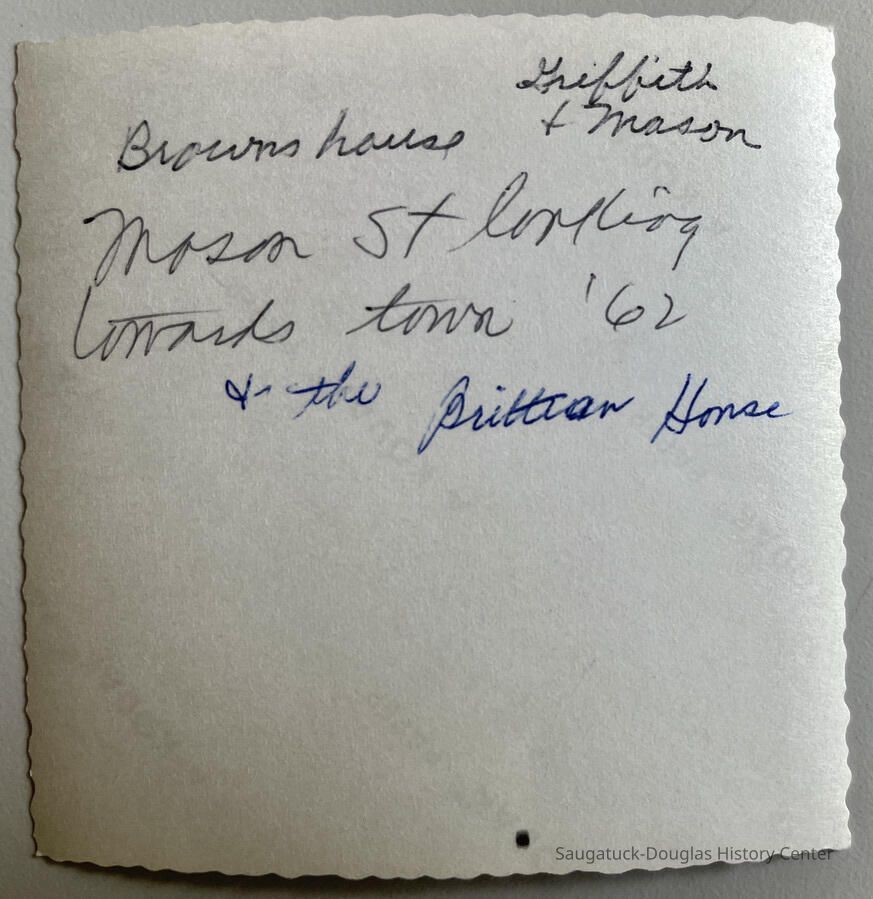 Notes written on back of photo include "Browns House, Griffith & Mason, Mason St. looking towards town '62, + the Brittian House"
