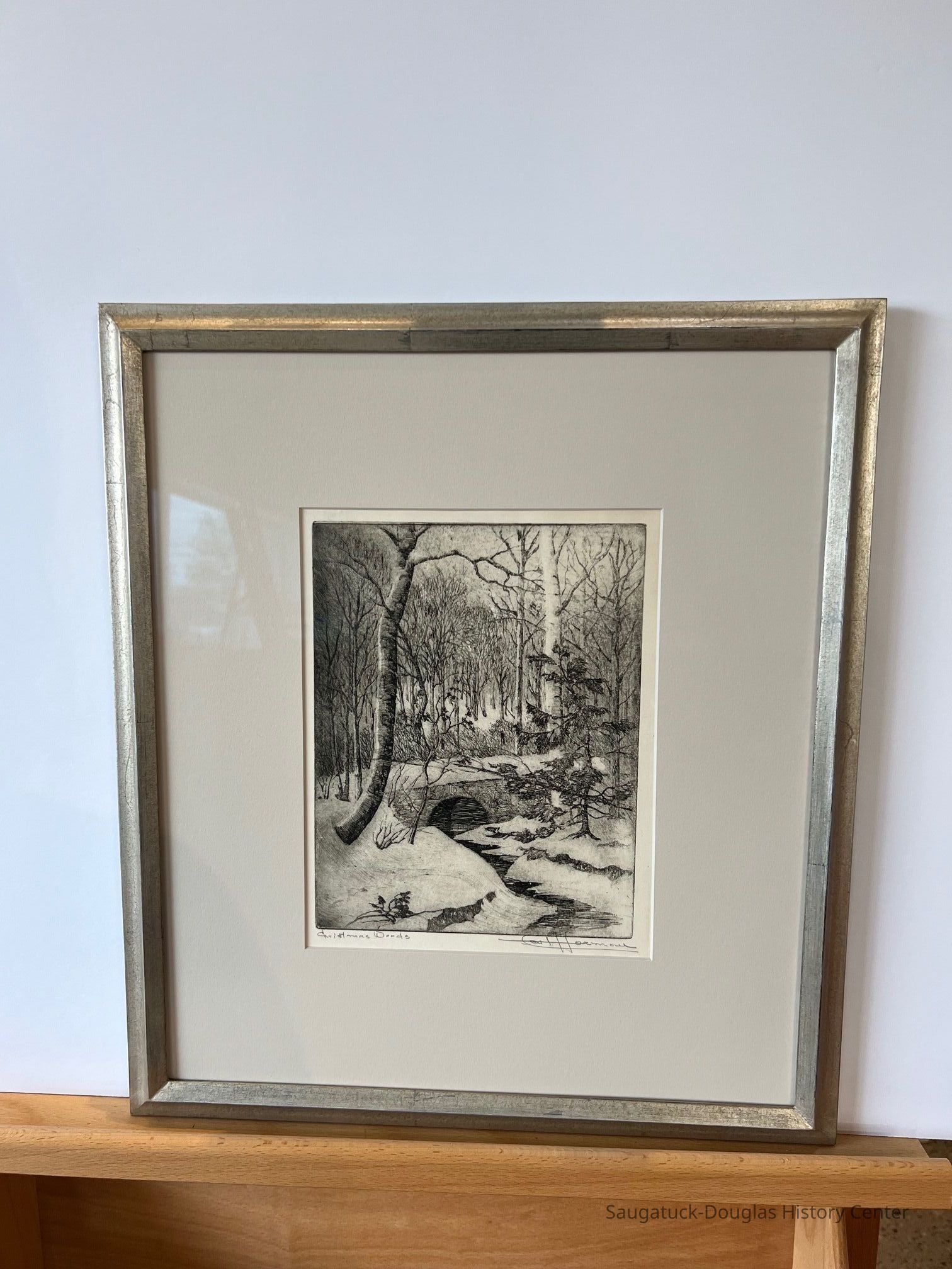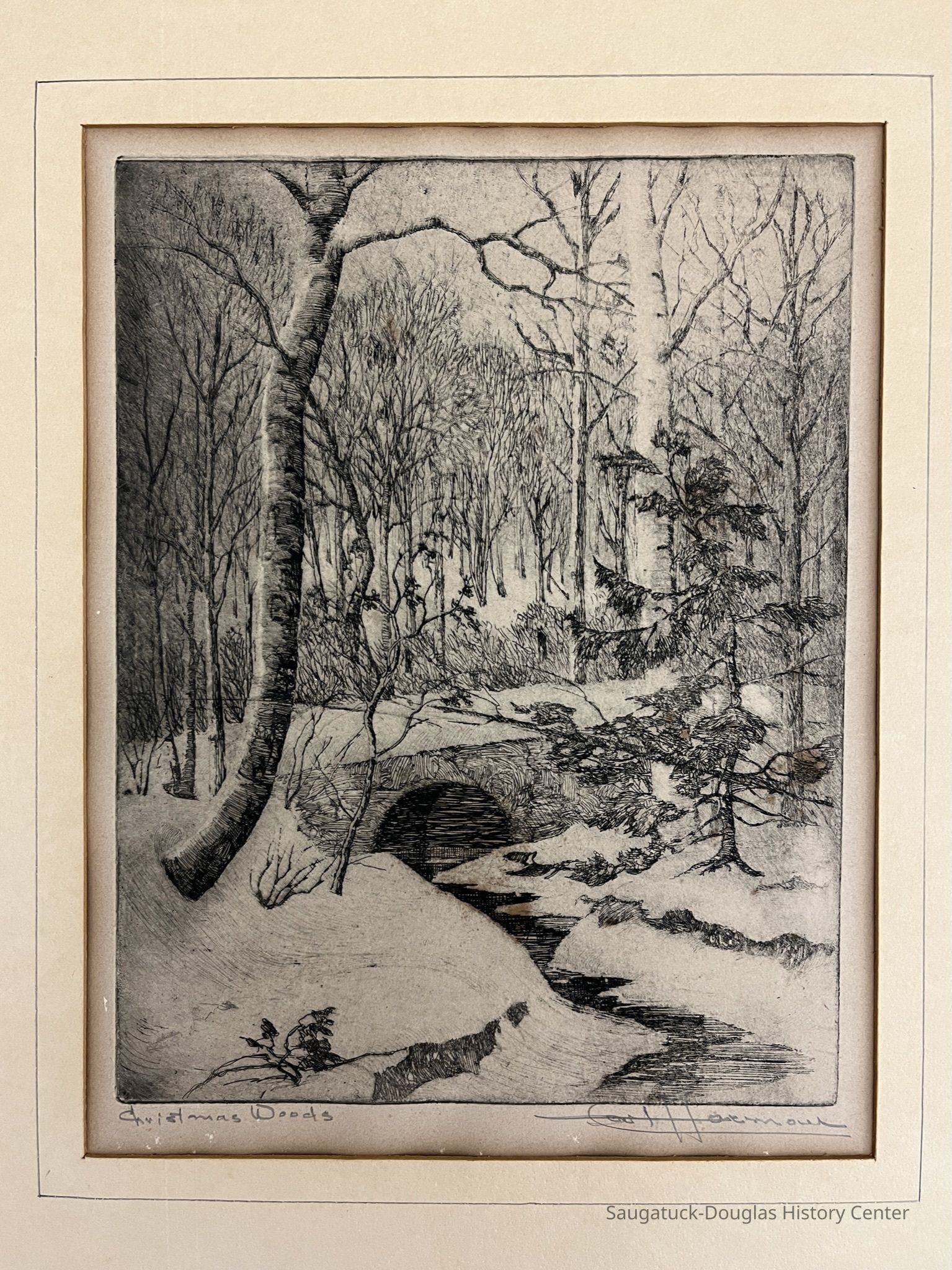 Carl Hoerman 1885-1955 Christmas Woods ca. 1930-1950 | etching This print titled Christmas Woods and signed by artist Carl Hoerman evokes the quiet stillness of the wooded dunes in the winter at the Lakeshore. Best known for his landscape paintings of the western desert and Lake Michigan dunes, Hoerman also produced prints of diverse subjects from his travels, near and far, from his Sagatuck studio. SDHC Collection Gift of Ron and Bonnie Wilkins Accession number 2022.78.05