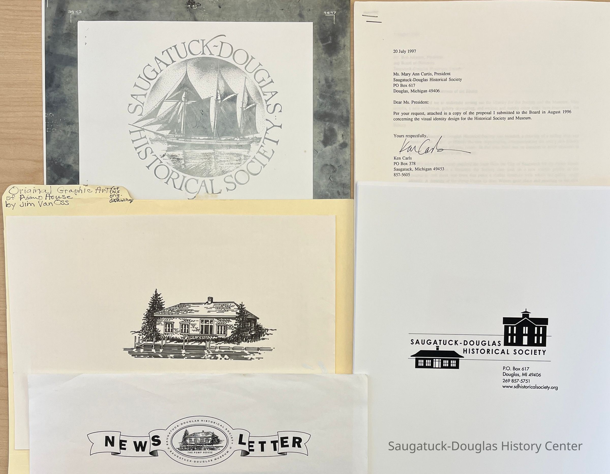 Early business records of the SDHS compiled by Michael Sweeney plus a collection of SDHS/C logo art including the original sailing ship logo, the Pump House logo by Jim Van Oss, the newsletter logo and various logos created by Ken Carls through the years.