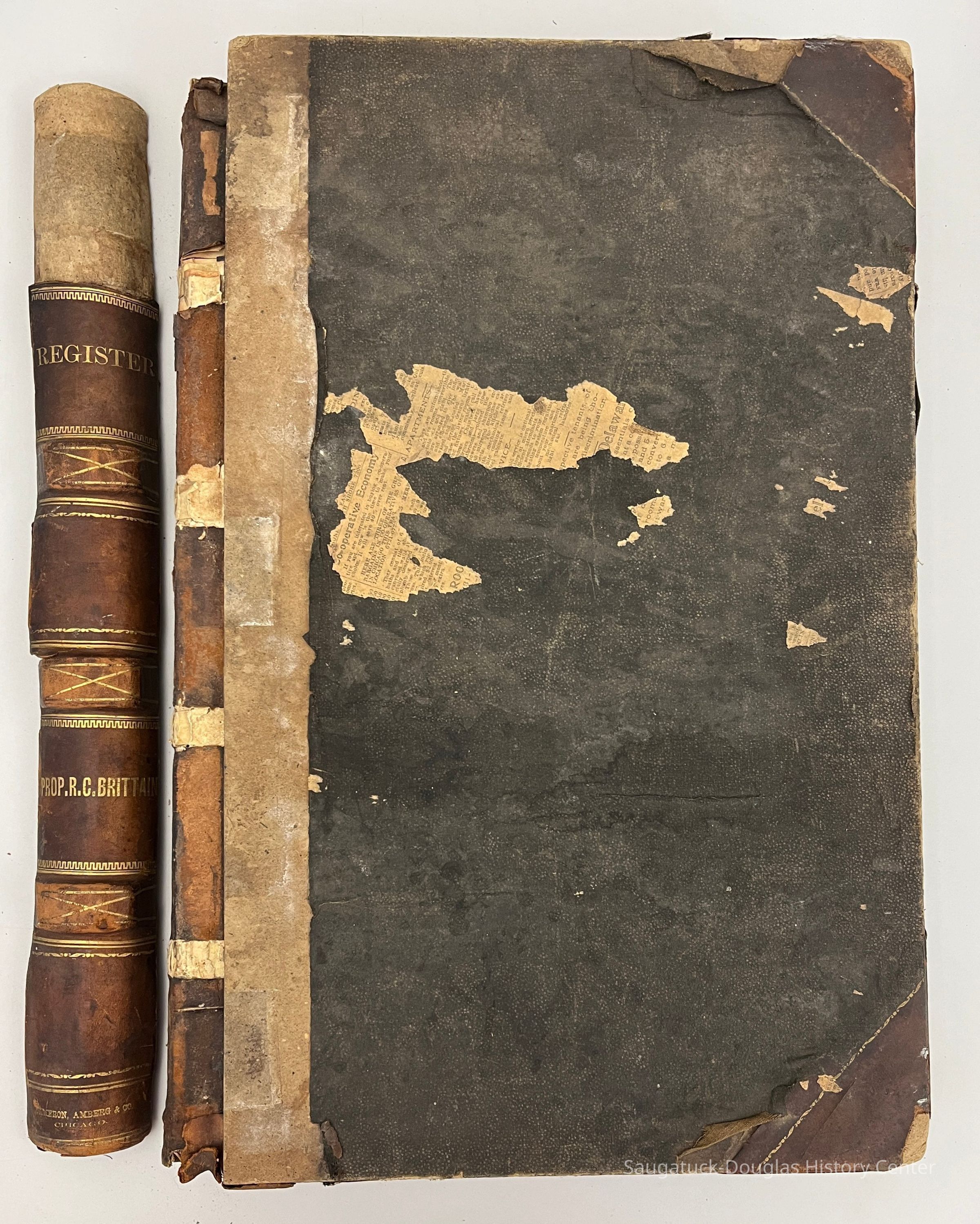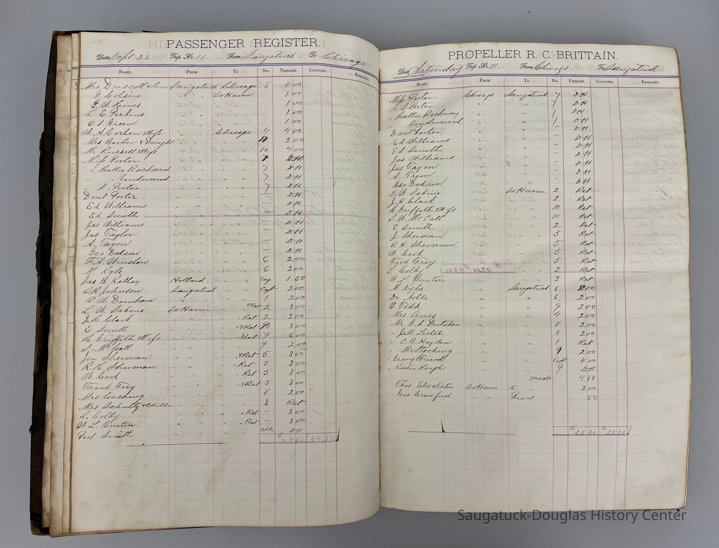Large ledger with arched but detached spine and no cover. The ledger lists the passengers who traveled on the propeller ship (on innovation over sail power) R.C. Brittain.