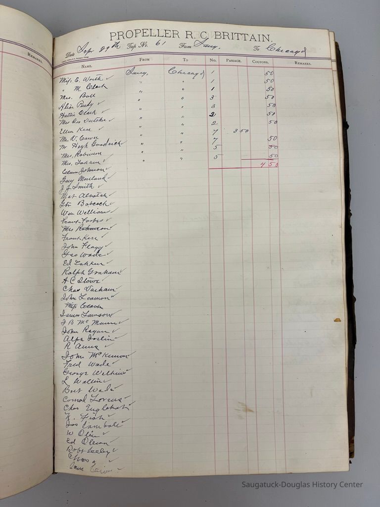 The locally-built R.C. Brittain was a steam barge that usually traveled between Saugatuck and Chicago. She likely carried cargo as well as people.
