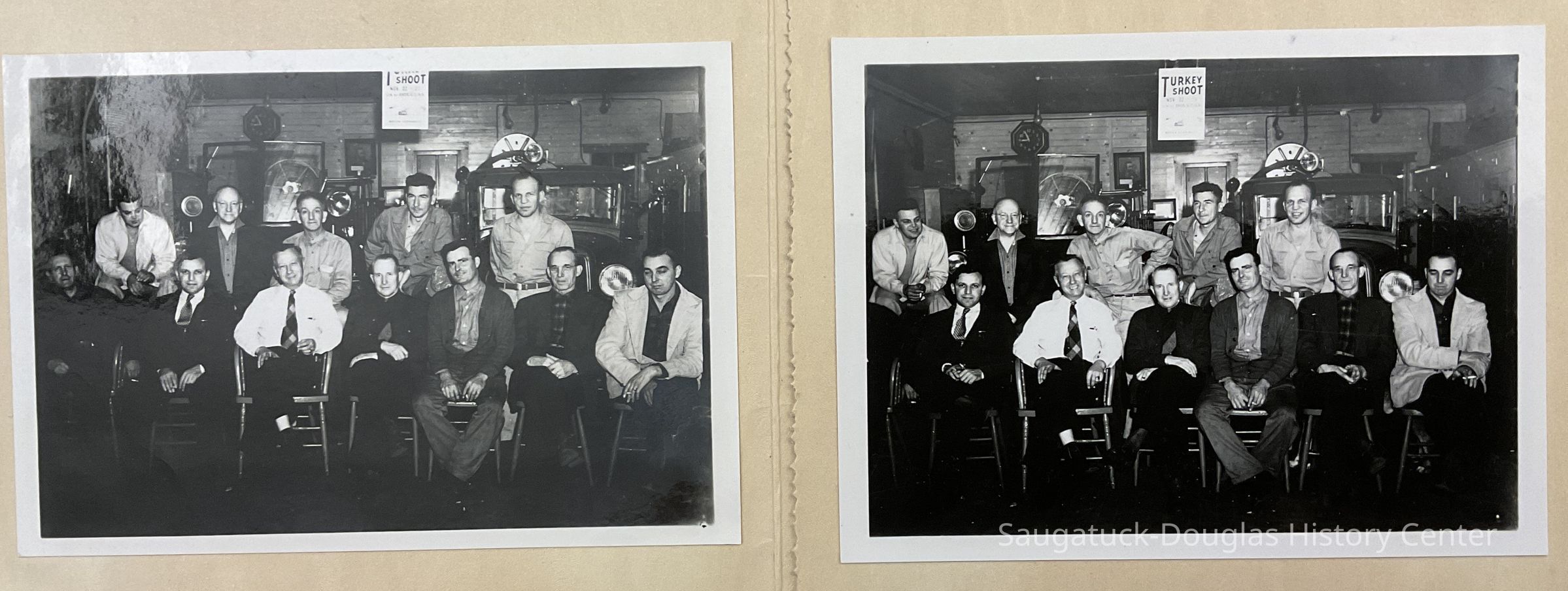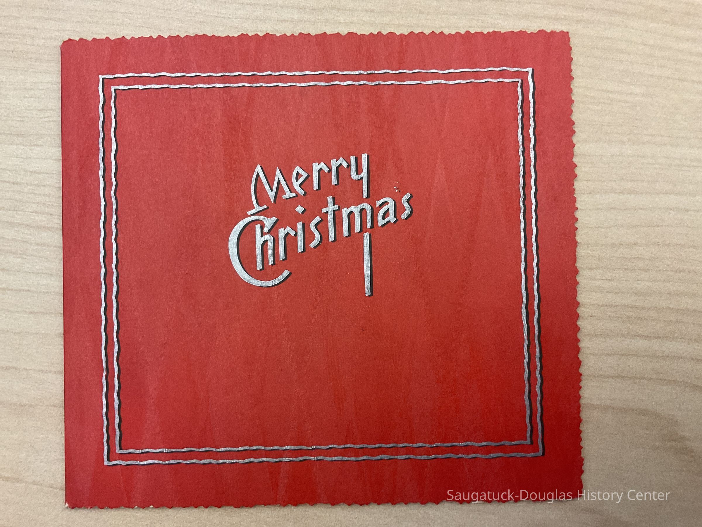 two photos of the Saugatuck Volunteer Fire Department pasted into a red Christmas Card folder with the words on the outside in silver "Merry Christmas"