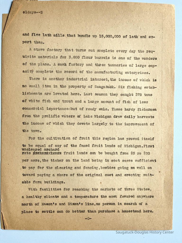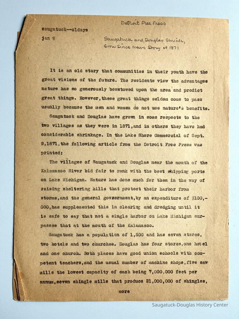 Two typed pages transcribing an account of a Douglas Free Press story about the growth of Saugatuck and Douglas as reported in the Sept 9, 1871 Lake Shore Commercial newspaper.